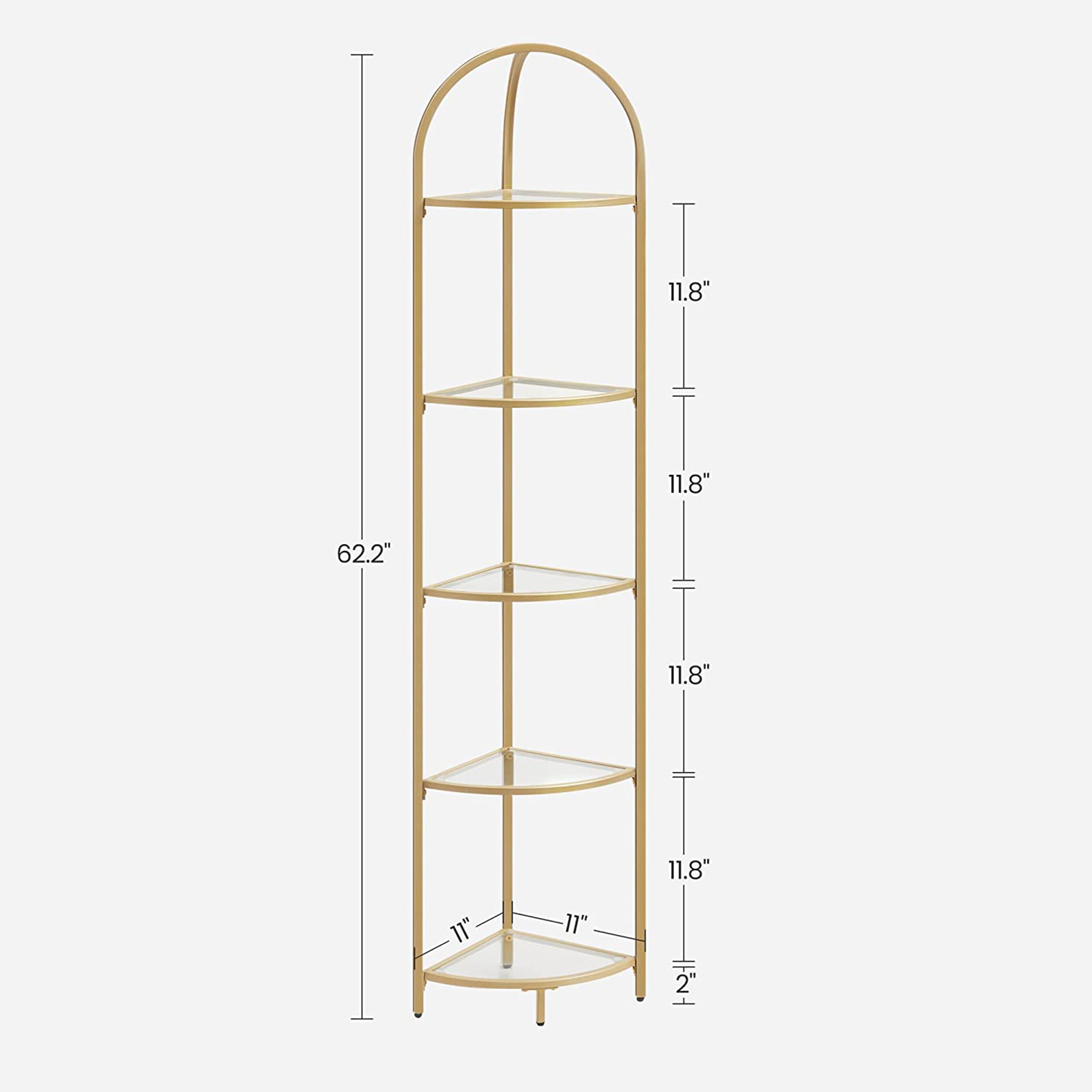 Tuotetiedot: – Väri: kultainen – Materiaali: lasi, metalli – Koko: 28 x 28 x 158 cm (P x L x K) – Hyllyjen välinen etäisyys: 30 cm – Paino: 5,3 kg – Maks. staattinen kantavuus per hylly: 5 kg Toimitus sisältää:- 1 x kulmahylly – 1 x lisävarustepaketti – 1 x kaatumissuoja – 1 x ohjeet VASAGLE Huomautukset: – Kiinnitä tuote seinään mukana toimitetulla kaatumissuojalla turvallisuuden takaamiseksi käytön aikana. – Turvallisuussyistä lapset eivät saa kiivetä tuotteelle tai leikkiä sillä.