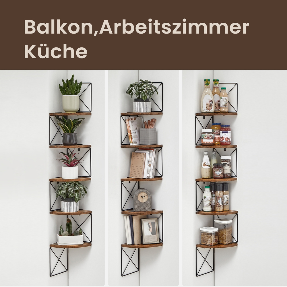 Tuotetiedot: – Väri: vintage-ruskea-musta – Materiaali: lastulevy, teräs – Koko: 20 x 20 x 127,5 cm (P x L x K) – Paino: 2,9 kg – Maks. staattinen kantavuus hyllyä kohti: 6 kg Toimitus sisältää: – 1 x kulmahylly – 1 x lisävarustepaketti – 1 x ohjeet VASAGLE Huomautukset: – Turvallisuussyistä lapset eivät saa kiivetä tuotteelle tai leikkiä sillä.