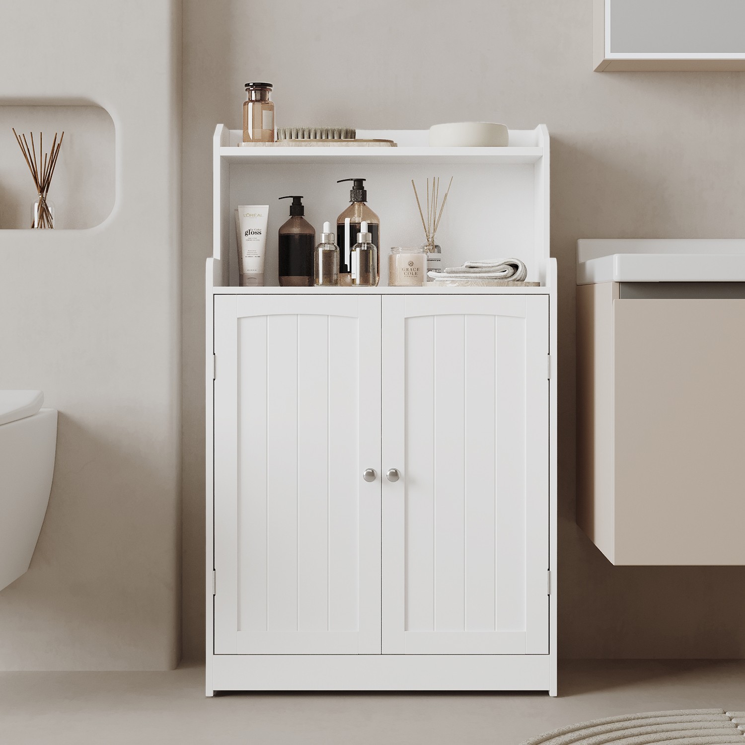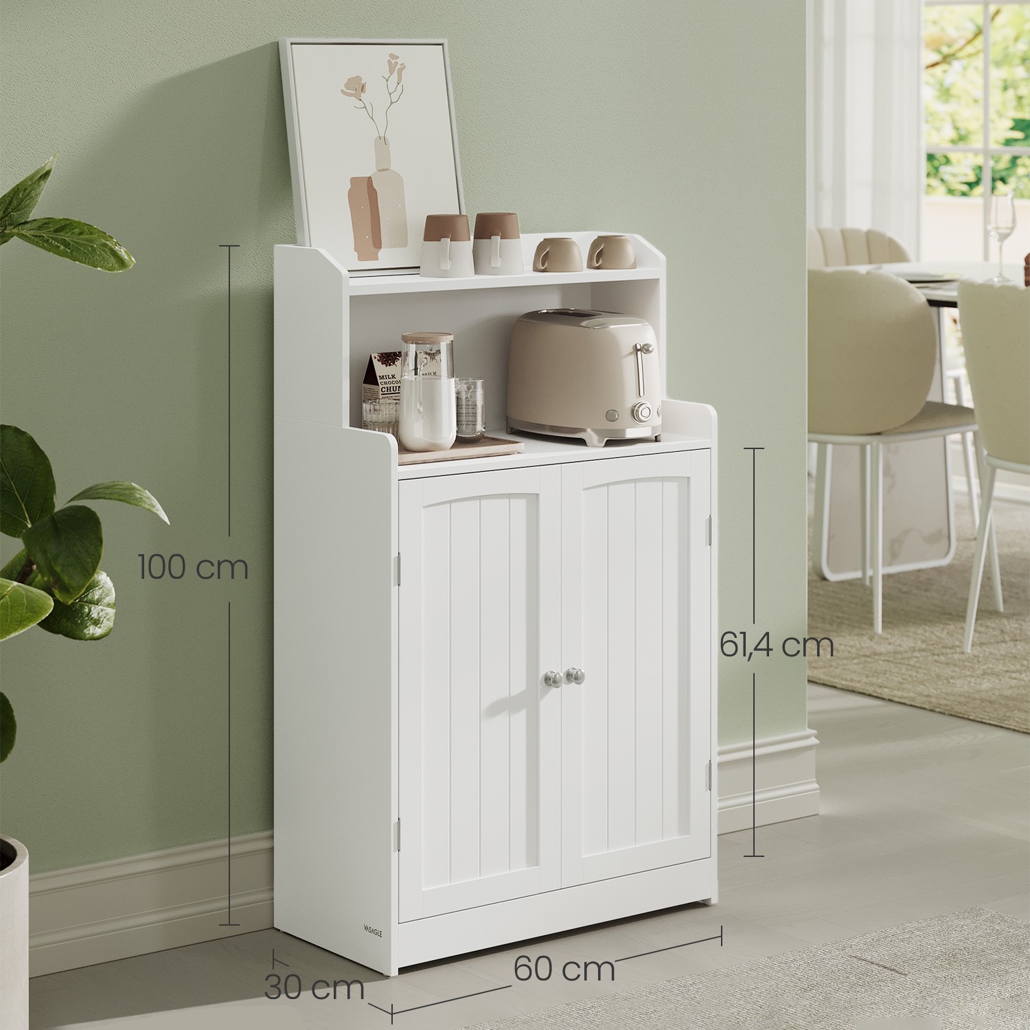 VASAGLE kylpyhuonekaappi, 2-ovinen kylpyhuonekaappi, 2 säädettävää hyllyä, 30 x 60 x 100 cm, kaappi ruokasaliin, keittiöön, olohuoneeseen, pilvinen valkoinen BBC770W01