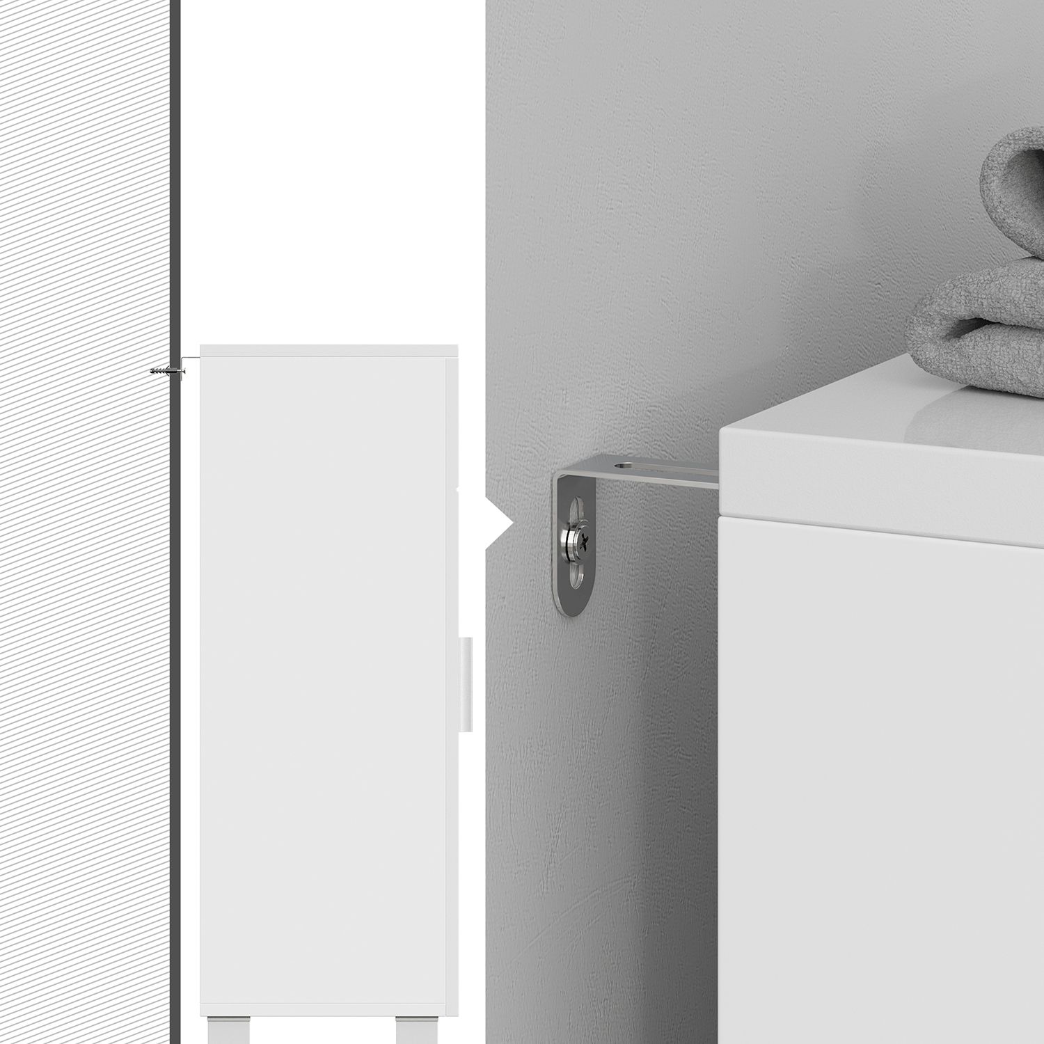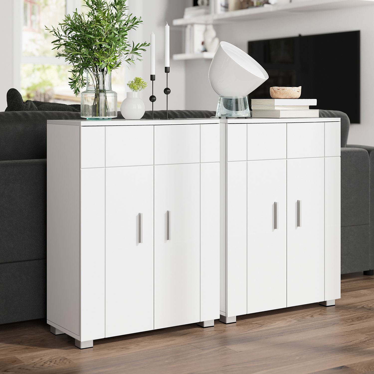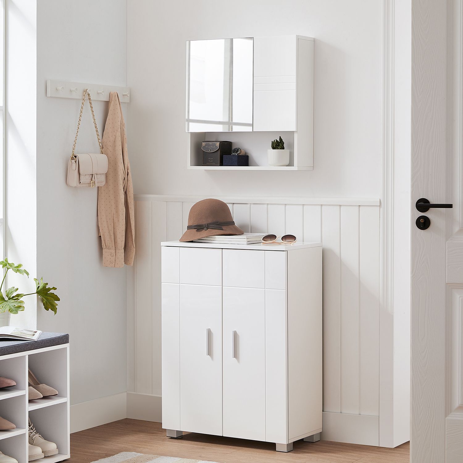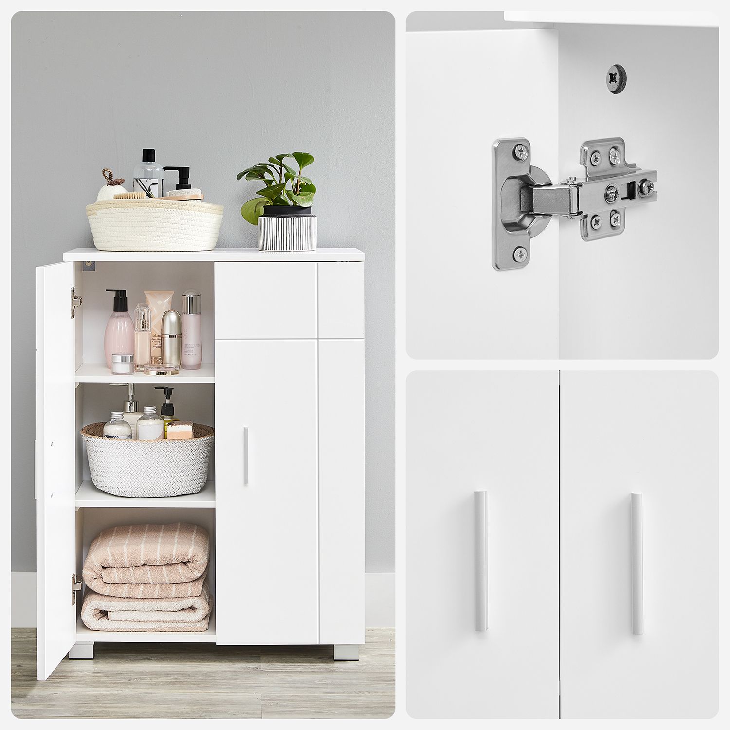 VASAGLE kylpyhuoneen kaappi, senkki, kylpyhuoneen kaappi, sivukaappi säädettävillä hyllytasoilla, eteisen kaappi, ovi ja ylälevy kiiltävällä pinnalla, 60 x 30 x 82 cm