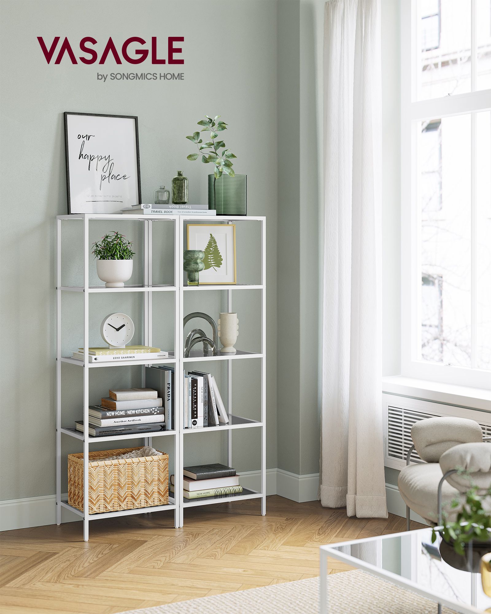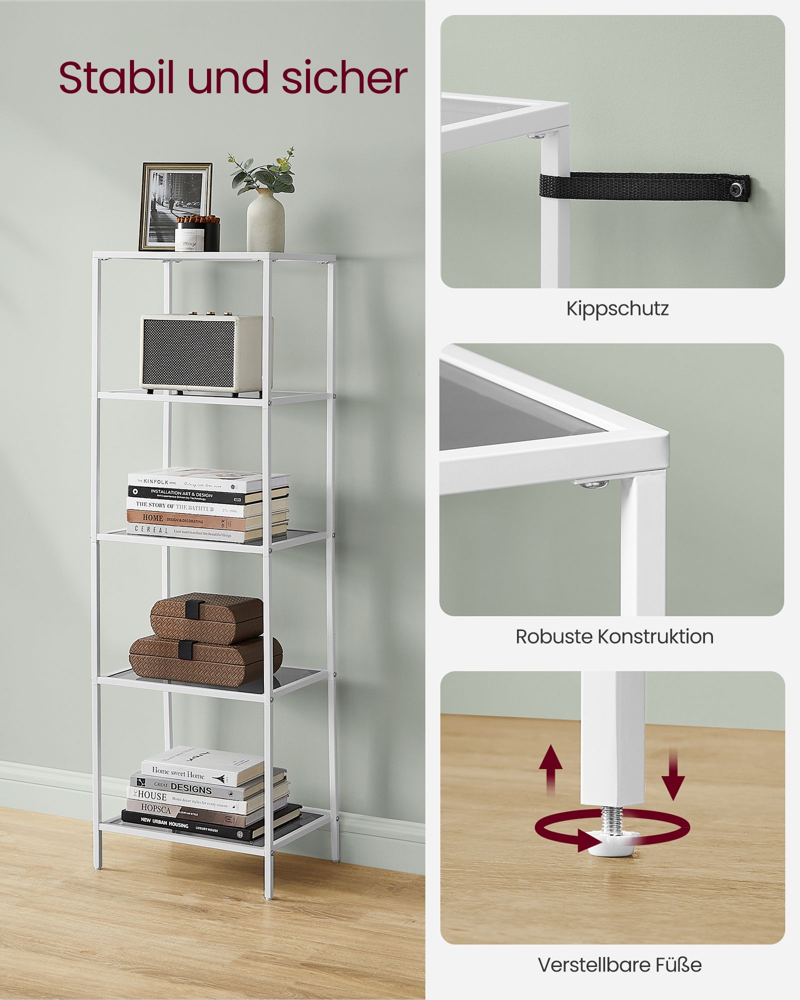 VASAGLE hyllykkö, kirjahylly, kylpyhuonehylly, 5 tasoa, keittiöhylly, kapea, hylly, kylpyhuonehylly, olohuoneeseen, makuuhuoneeseen, työhuoneeseen, karkaistu lasi, teräsrunko, kullanvärinen LGT029A01