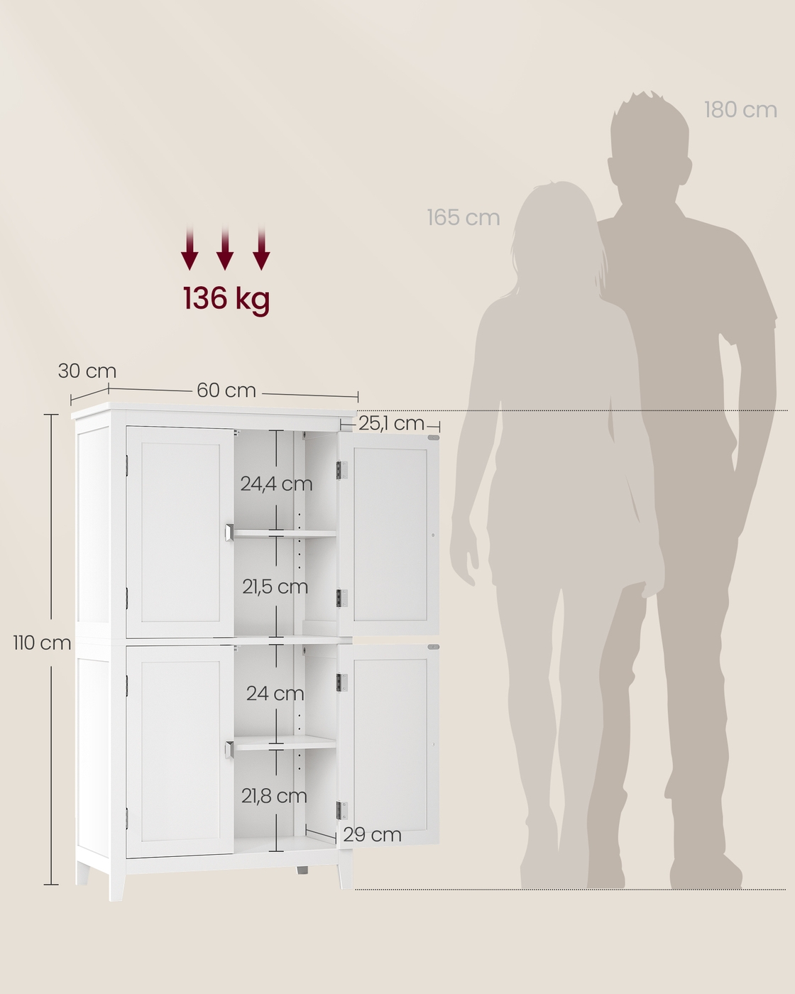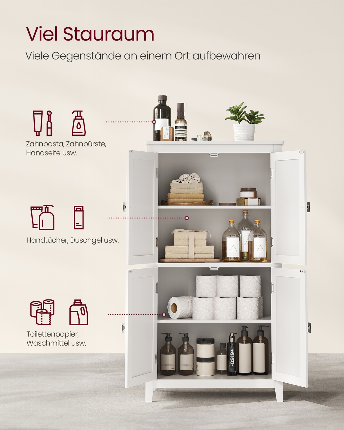 VASAGLE kylpyhuoneen kaappi, kylpyhuoneen kaappi, keittiön kaappi, 4 ovea, säädettävät hyllyt