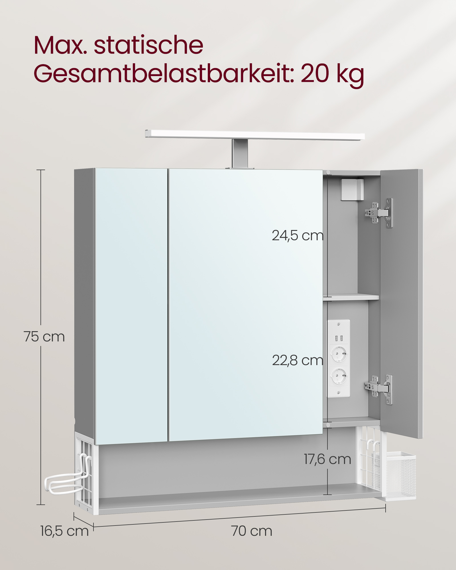 VASAGLE 3-ovinen kylpyhuonekaappi, peilikaappi, seinäkaappi, pistorasiat, ripustettava kori, hiustenkuivaajan pidike, runsaasti säilytystilaa, kylpyhuoneeseen, pesuallas