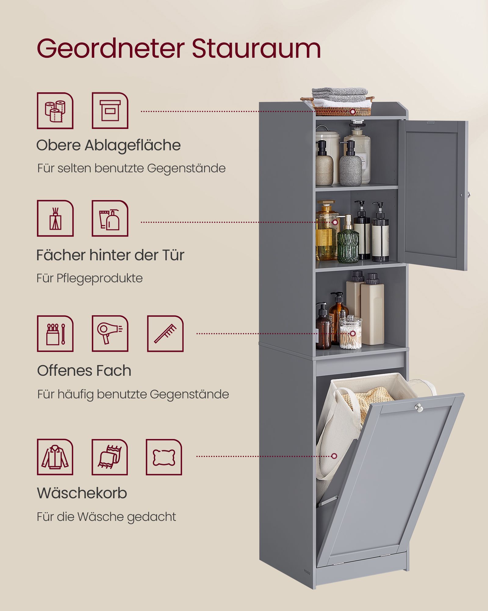 VASAGLE kylpyhuonekaappi pyykkikorilla, korkea kylpyhuonekaappi, irrotettava pyykkipussi kahvoilla, ovella, säädettävällä hyllyllä, 40 x 40 x 170 cm, pilvinen valkoinen BBC761W01