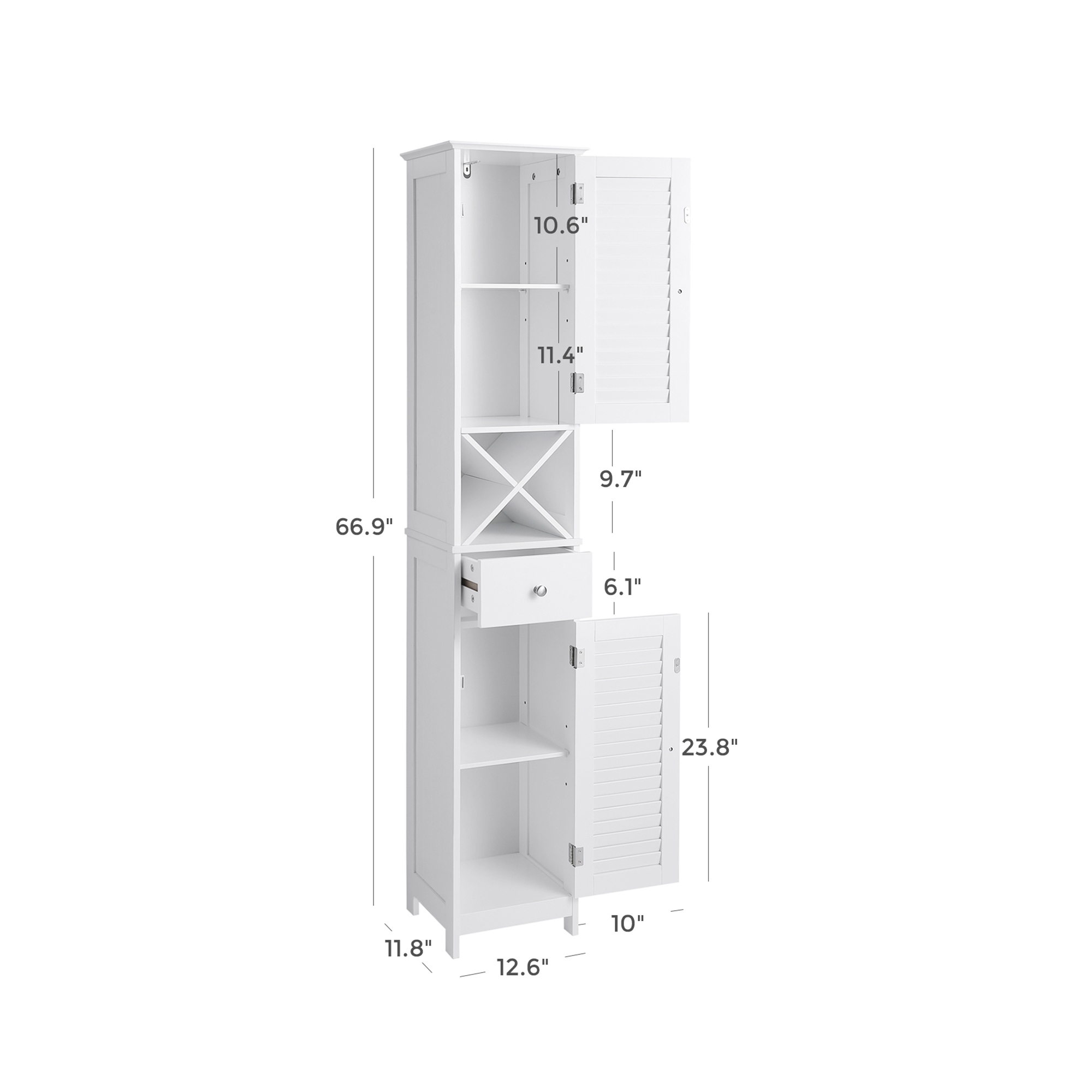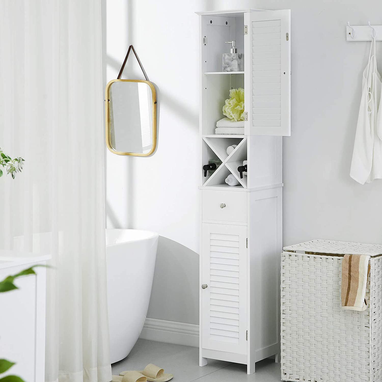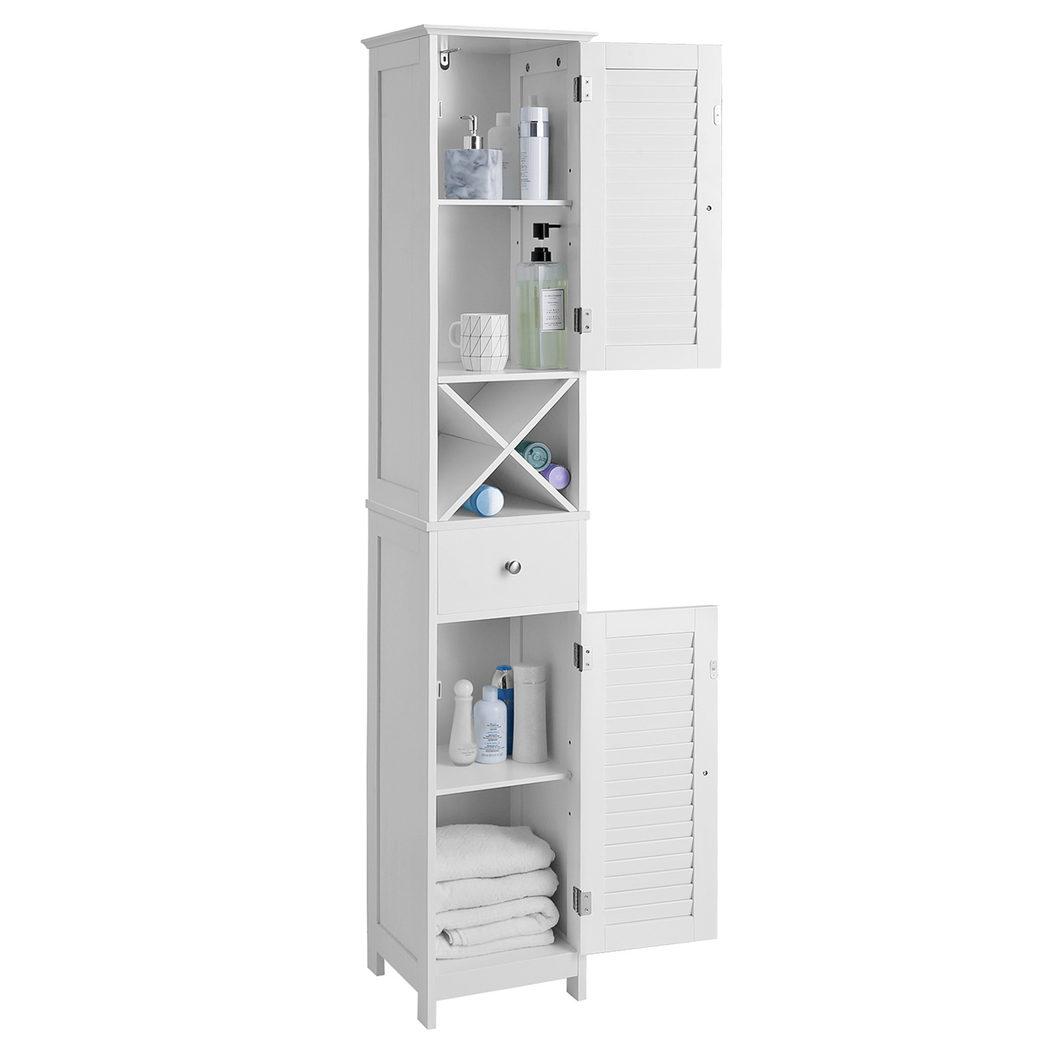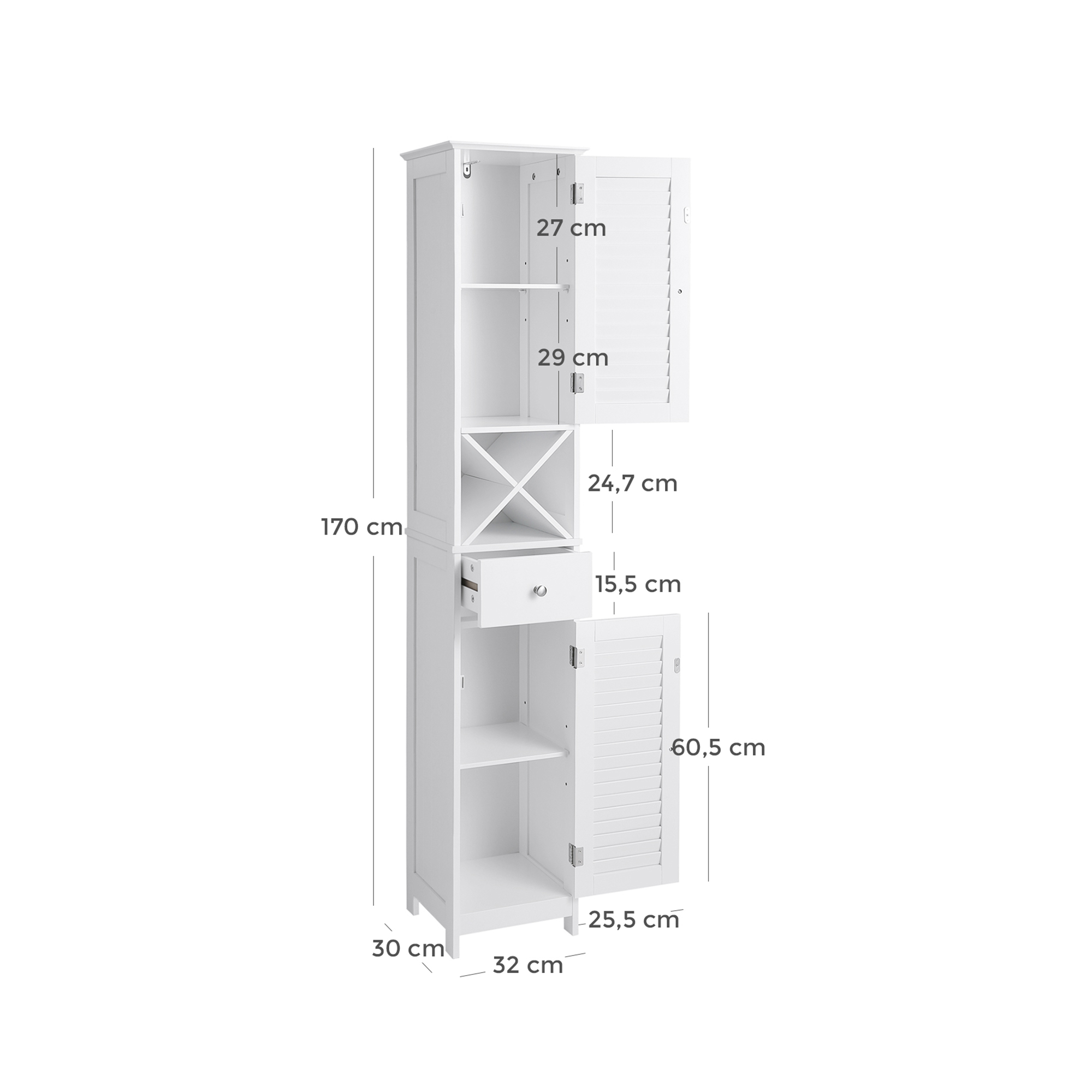 VASAGLE kylpyhuoneen kaappi, säilytyskaappi, korkea kaappi, siipiovet, laatikko, irrotettava X-muotoinen kiinnike, 32 x 30 x 170 cm, skandinaavinen tyyli, valkoinen, BBC69WT