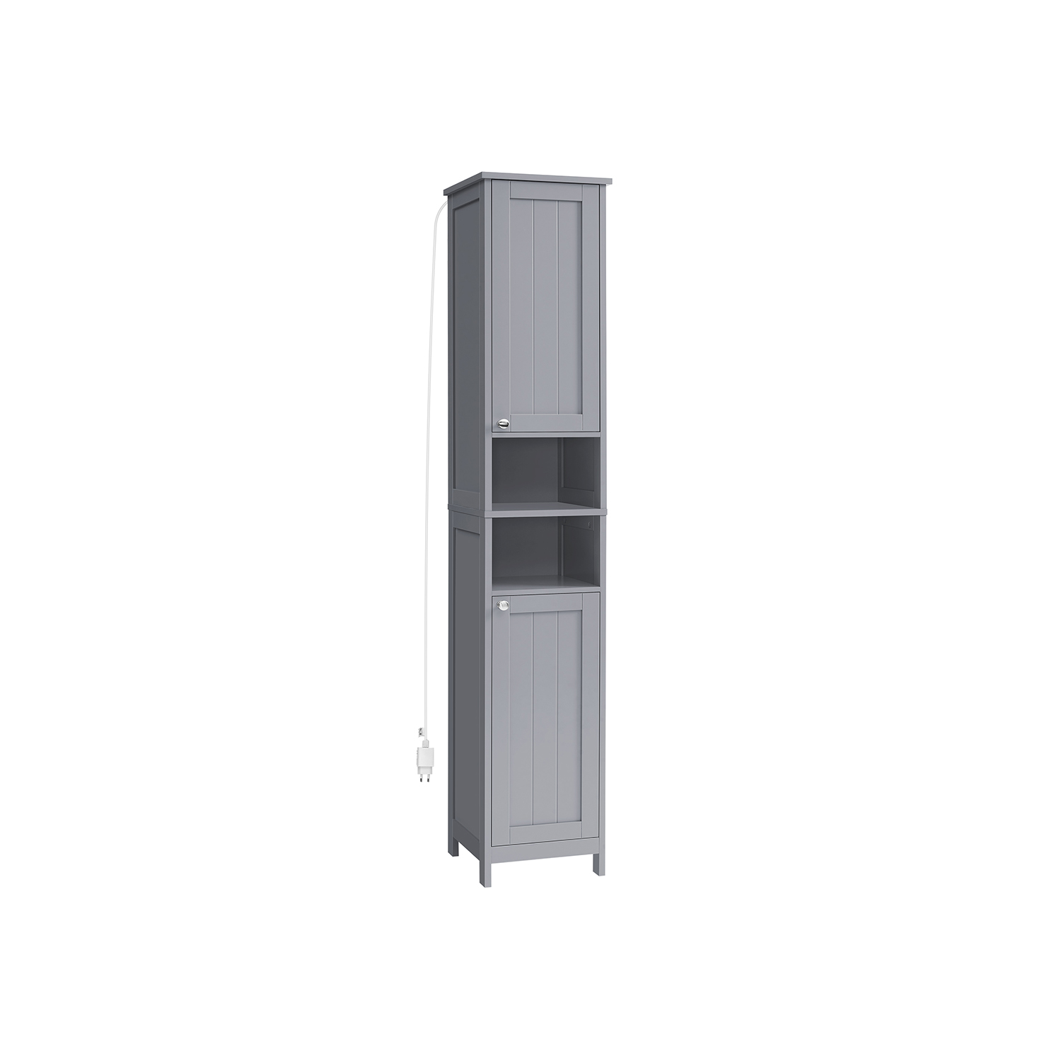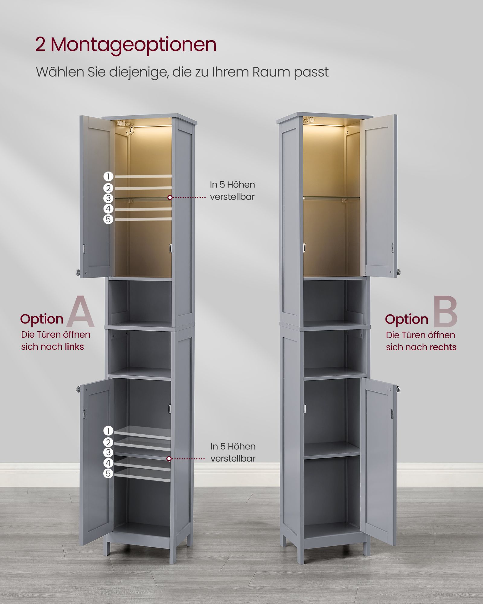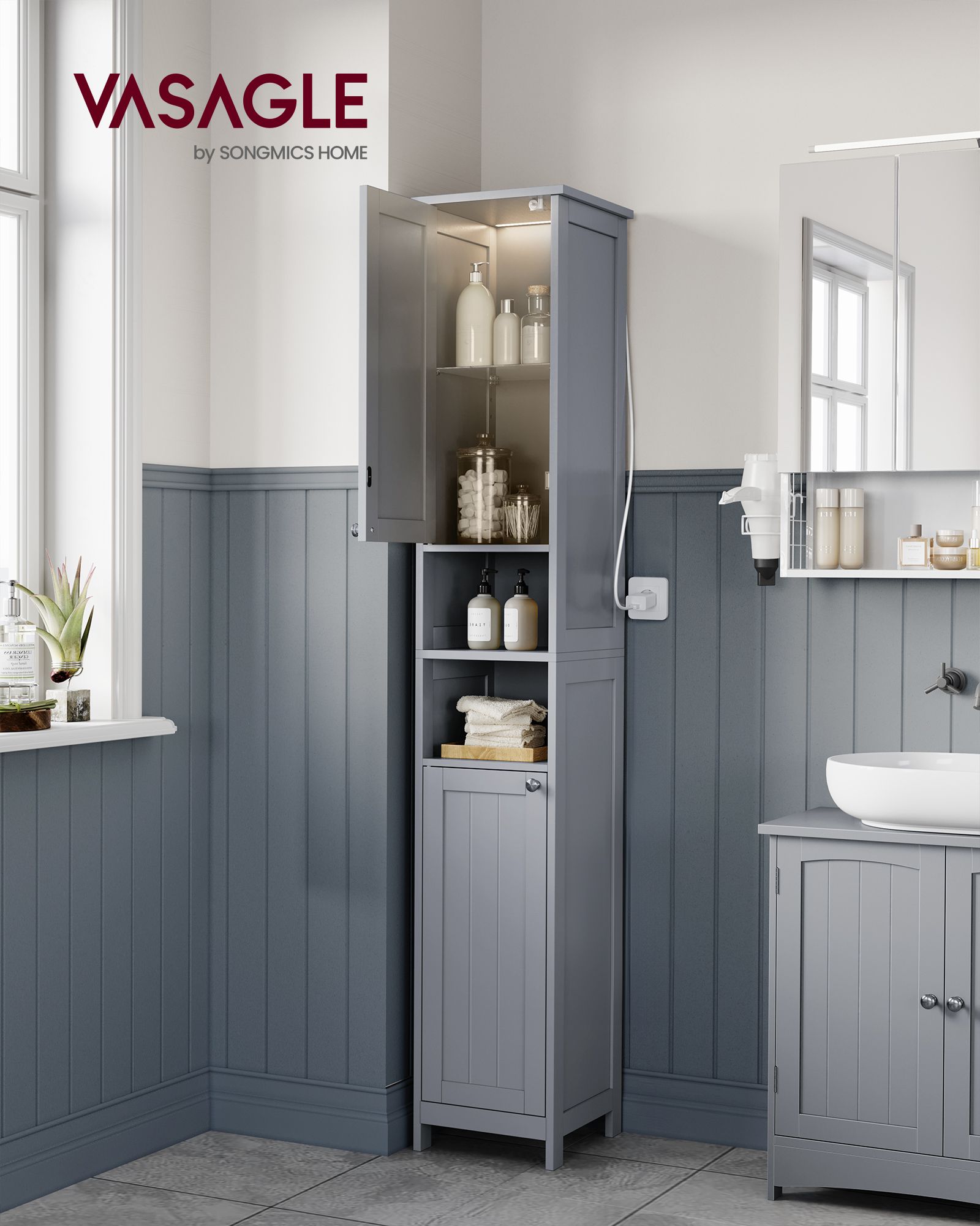 VASAGLE kylpyhuonekaappi valaistuksella, korkea, kapea kylpyhuonekaappi, säilytyskaappi säädettävillä hyllyillä, avoimet lokerot, pieniin tiloihin