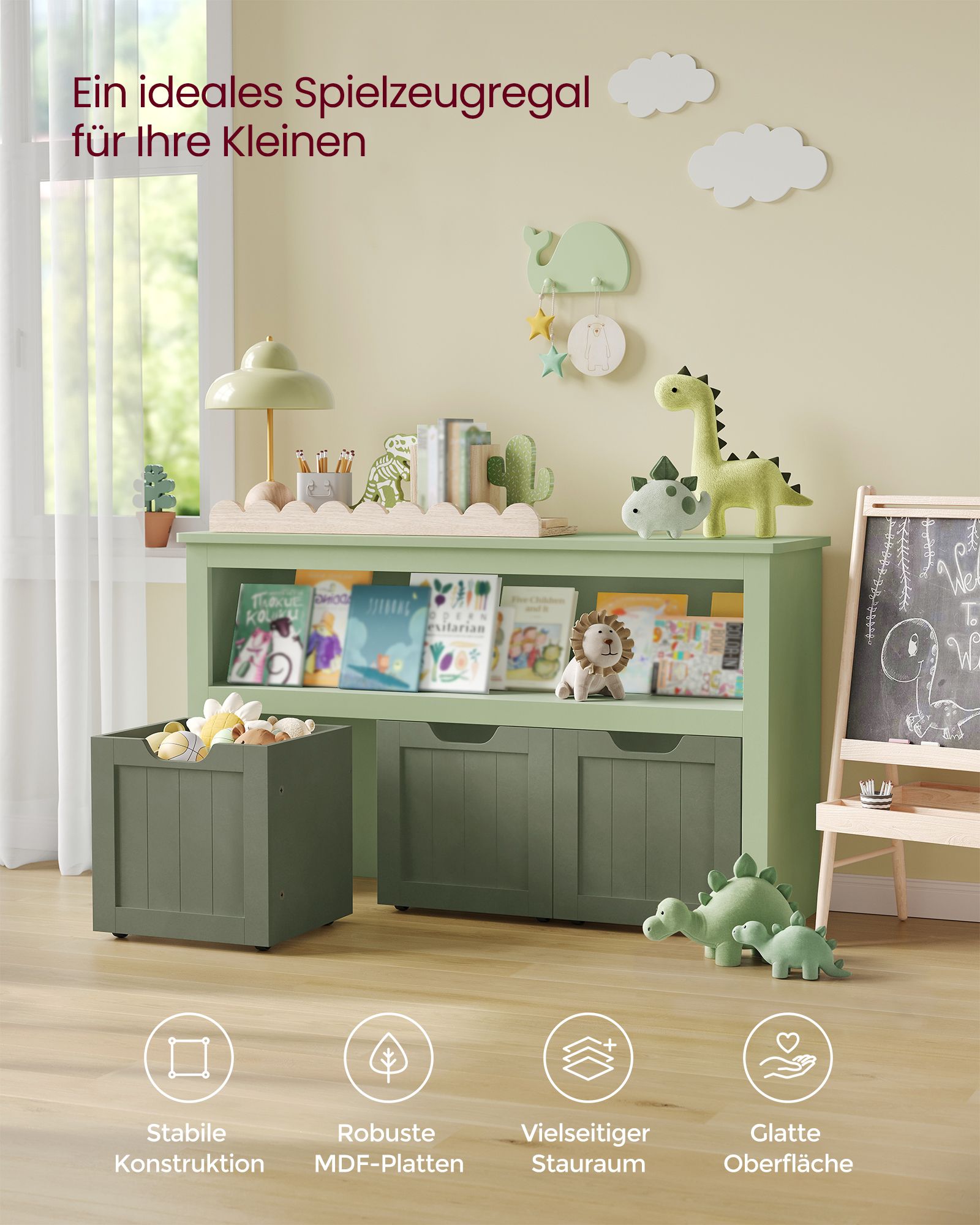 VASAGLE lasten hylly, lelujen säilytys lapsille, säilytyskaappi, lelukaappi, säilytyslaatikko pyörillä, leluhylly, lastenhuoneeseen, 102 x 30 x 60 cm, valkoinen LHS380W01