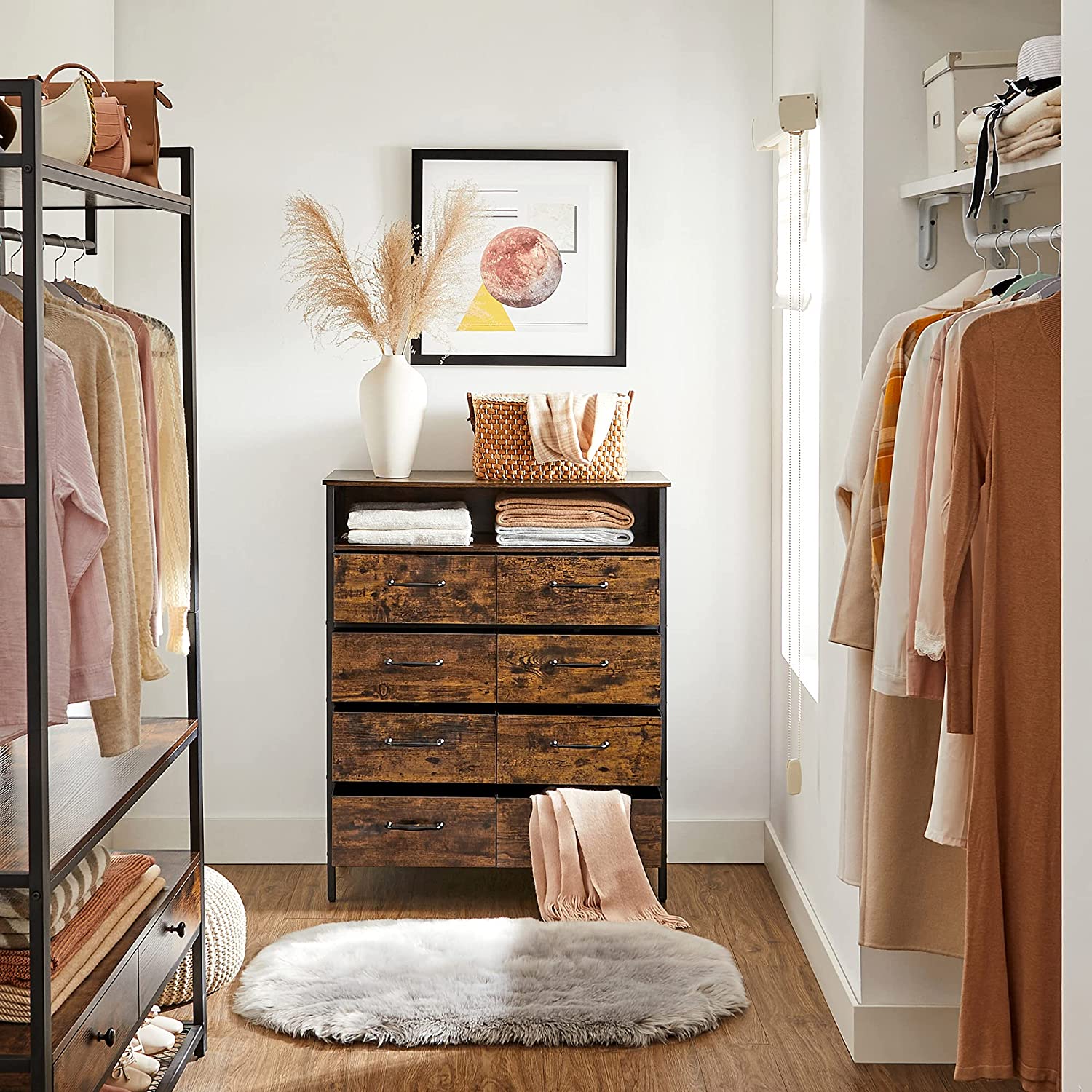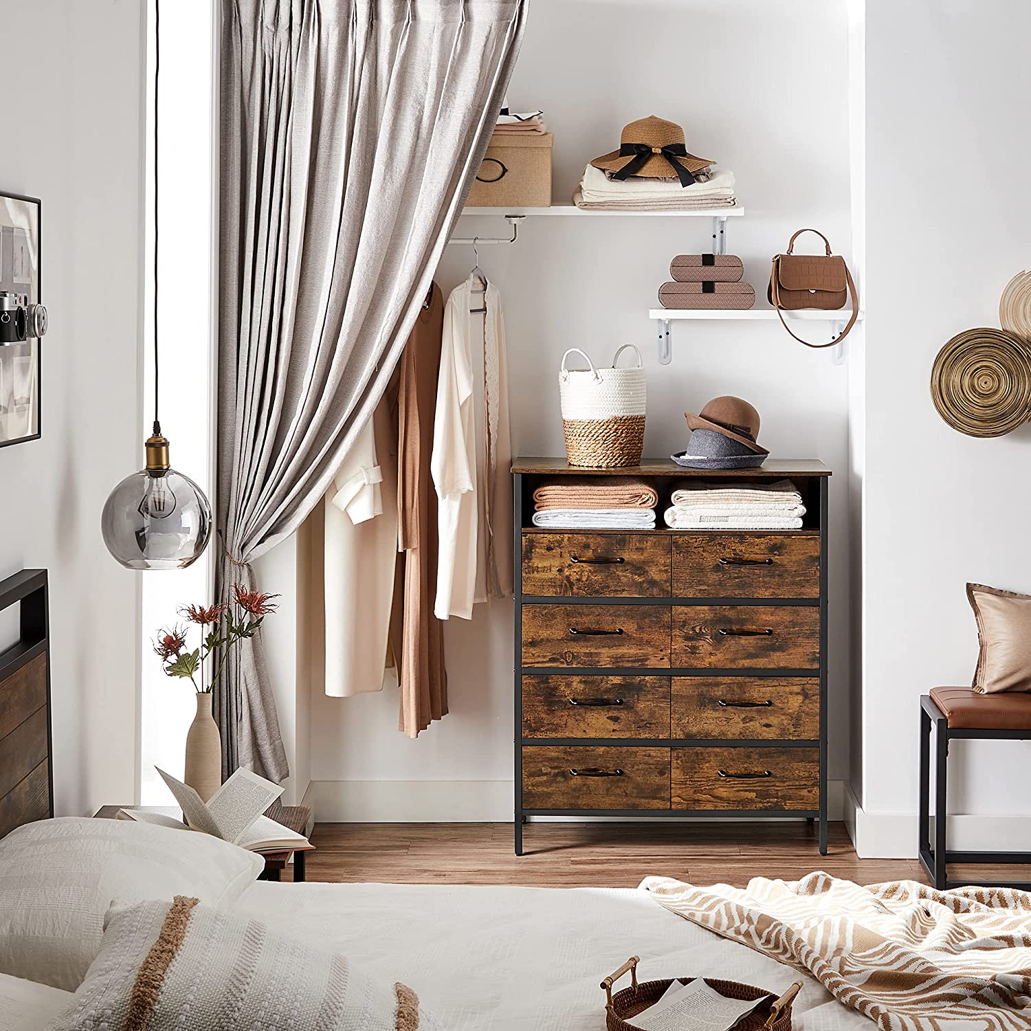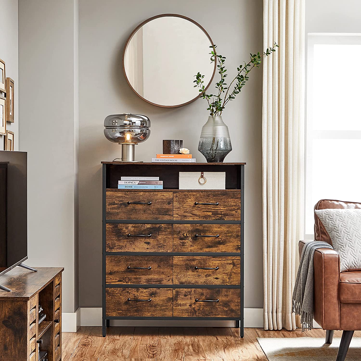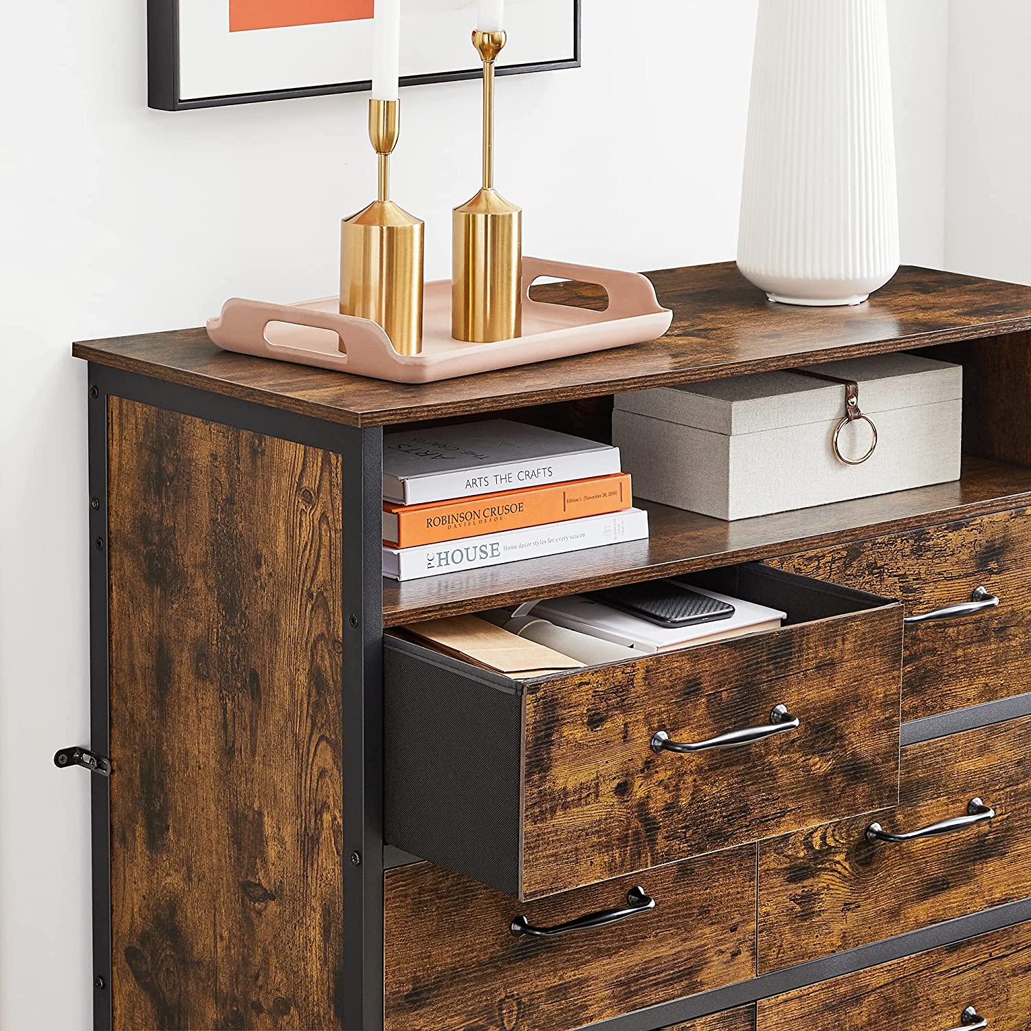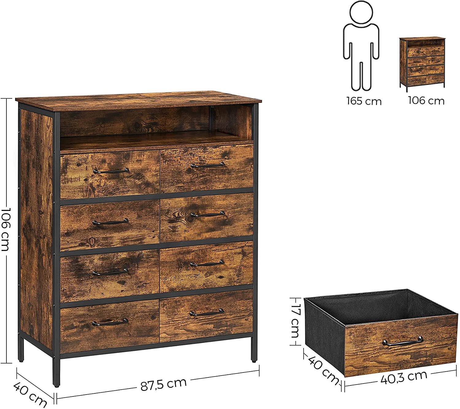 Tuotetiedot: – Väri: vintage-ruskea-musta – Materiaali: lastulevy, teräs, kuitukangas, MDF (keskitiheä kuitulevy) – Koko: 87,5 x 40 x 106 cm (P x L x K) – Paino: 24,1 kg – Pinnan maks. staattinen kantavuus: 30 kg – Avoimen hyllyn maks. staattinen kantavuus: 10 kg – Jokaisen laatikon maks. staattinen kantavuus: 5 kg – Maks. staattinen kantavuus yhteensä: 80 kg Toimitus sisältää:- 1 x lipasto – 2 x kaatumisenestolaite – 4 x säädettävät jalat – 1 x lisävarustepaketti – 1 x ohjeet VASAGLE Huomautukset: – Turvallisuussyistä lapset eivät saa kiivetä tuotteen päälle tai leikkiä sillä. – Kiinnitä tuote seinään mukana toimitetulla kaatumisenestolaitteella turvallisuuden takaamiseksi käytön aikana.