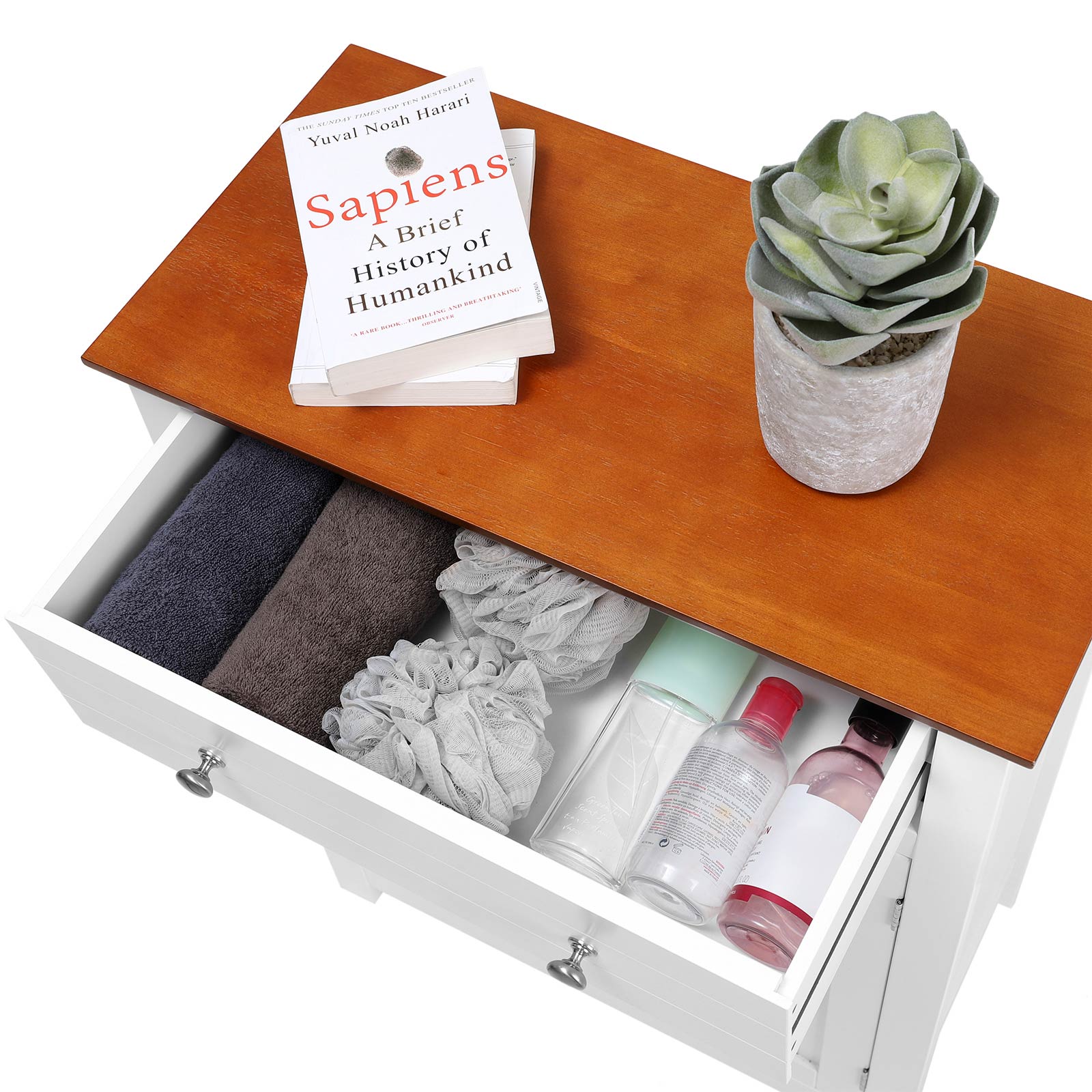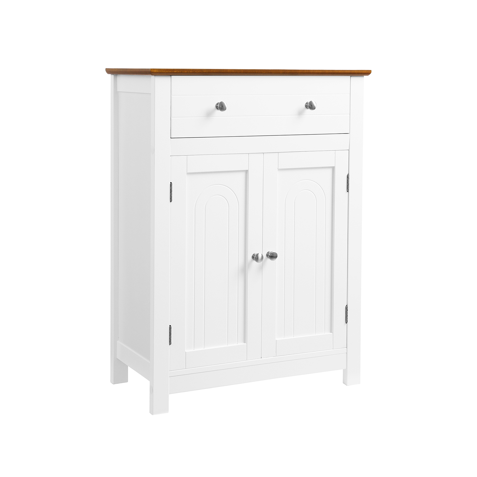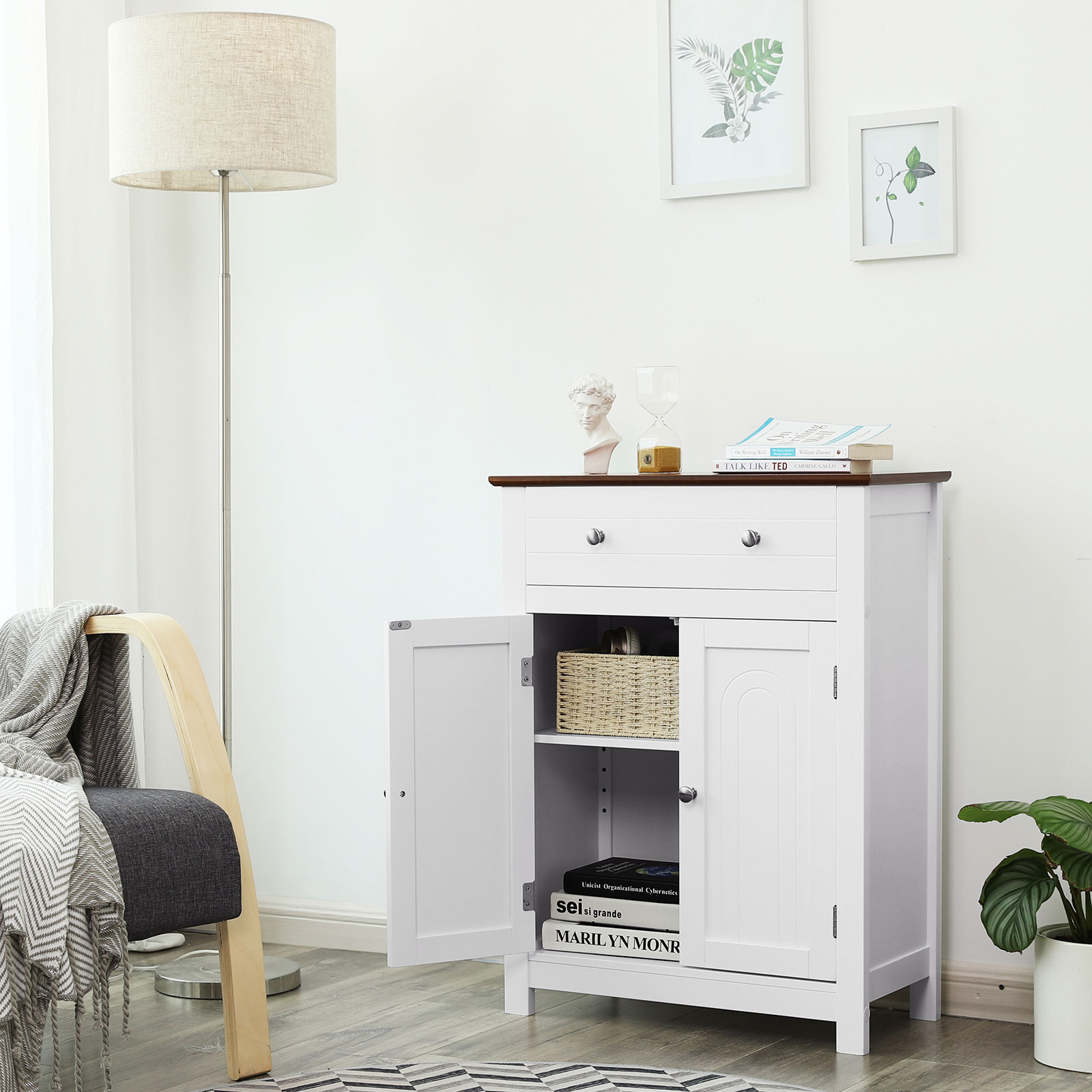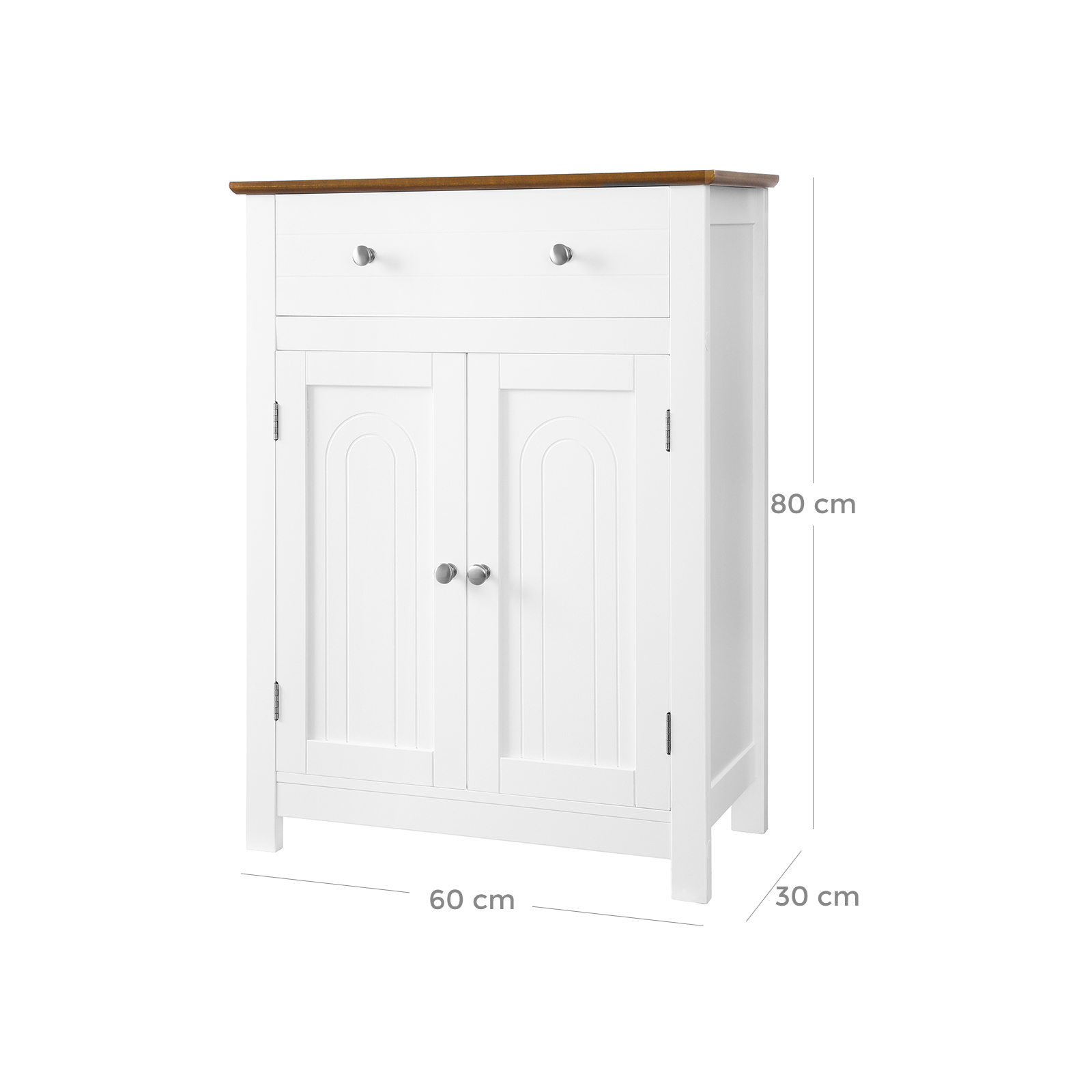 Oletko aina ärtynyt kylpyhuoneen, olohuoneen, eteisen tai keittiön kaaoksesta? VASAGLE:n seisova kaappi on käytännöllinen apuväline sinulle. Koristeellinen elementti asunnossasi Valkoisen ja ruskean värikombinaation ansiosta maalaistyyliinen kaappi näyttää tyylikkäältä ja viehättävältä, eikä se ole vain huonekalu, vaan myös kodin koriste. Huolellisesti suunniteltu yläosassa on suuri laatikko, johon mahtuu päivittäin käyttämäsi tarvikkeet. 180° kääntyvä kaksoisovi on varustettu kromatuilla metallikahvoilla, jotka helpottavat käyttöä. Kolmeen asentoon säädettävän hyllyn avulla ovien takana oleva suljettu säilytystila voidaan jakaa tarpeen mukaan. Näin voit säilyttää erilaisia esineitä ja suojata ne pölyltä, vedeltä ja uteliailta katseilta. VASAGLE on sitoutunut tarjoamaan korkealaatuisia huonekaluja, jotka luovat kodikkaan ja viihtyisän ilmapiirin kotiisi. Tuotetiedot: – Väri: valkoinen, ruskea – Materiaali: MDF-levyt, massiivipuupuuviilu (ylähylly) – Mitat: 60 x 80 x 30 cm (L x K x S) – Paino: 14,1 kg Toimitus sisältää: – 1 x kylpyhuonekaappi – 1 x tarvikepussi – 1 x ohjeet (DE, EN, IT, FR, ES)
