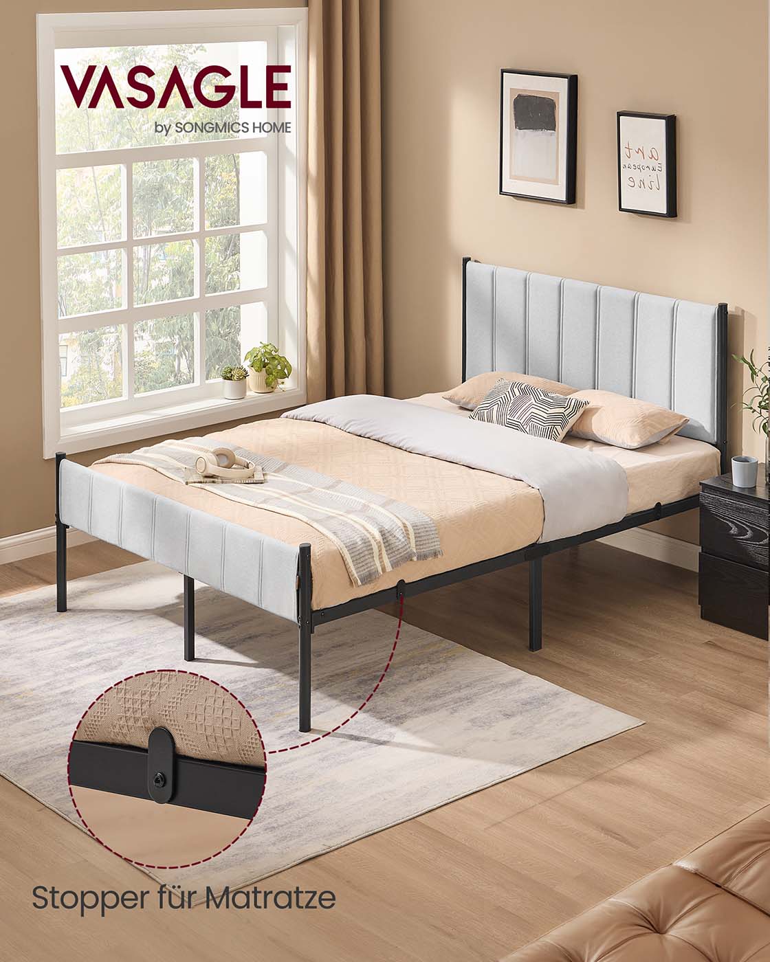 VASAGLE parivuode, sängynrunko, 140 x 200 cm, pehmustettu pääty, sängynrunko, teräslatvat, kantavuus 500 kg, helppo asentaa, kyyhkynharmaa RMB974G01