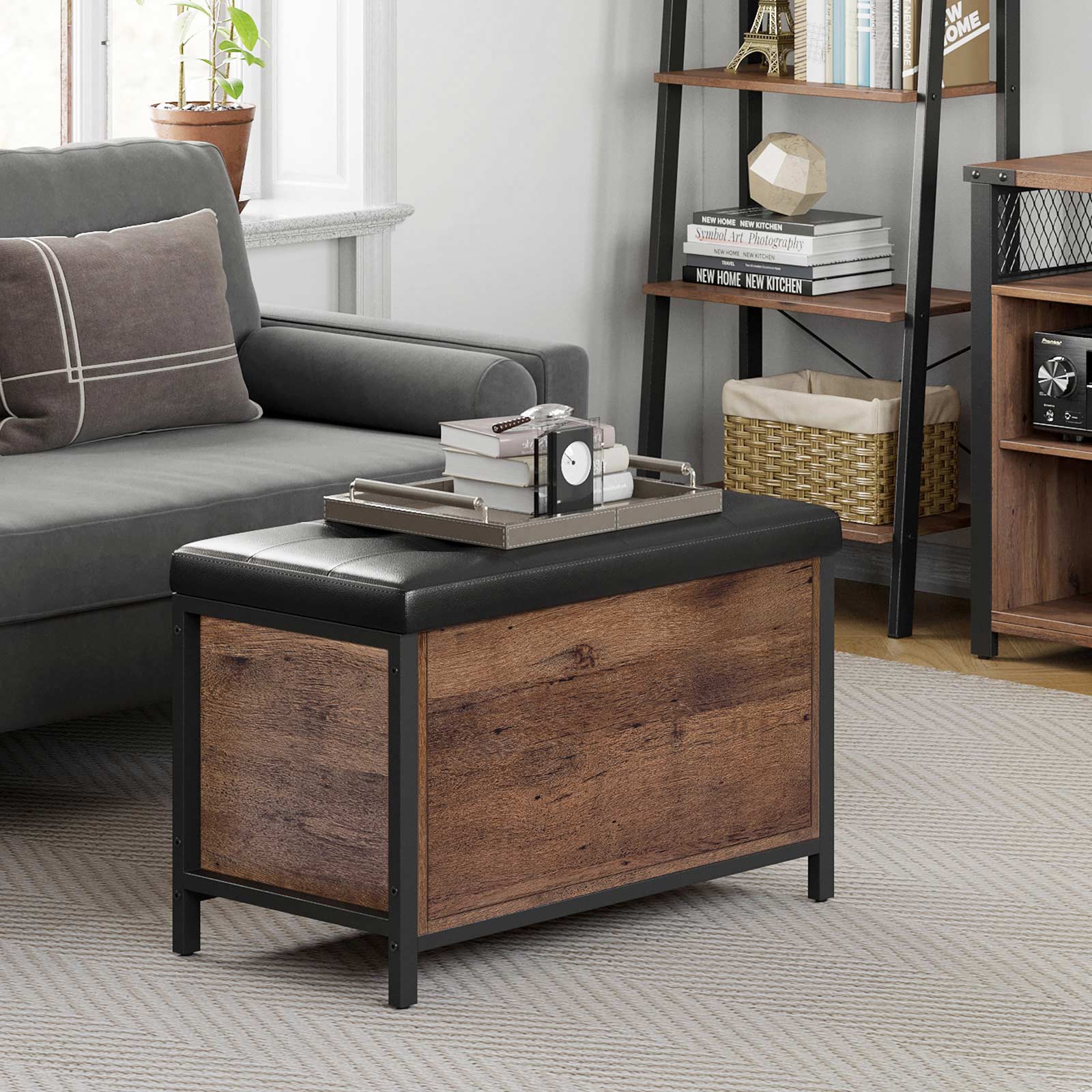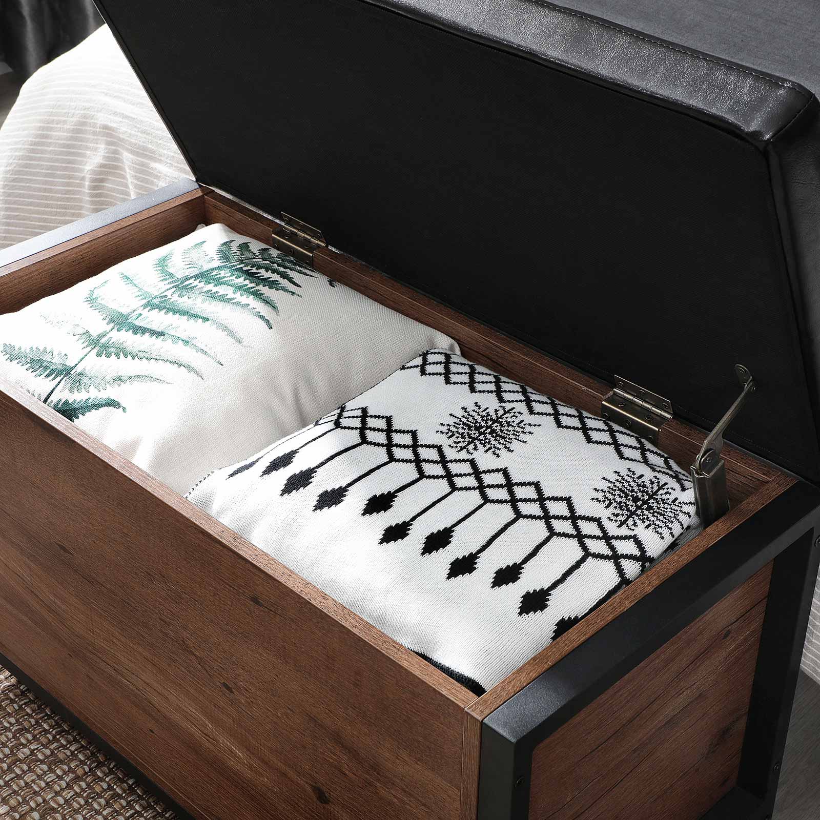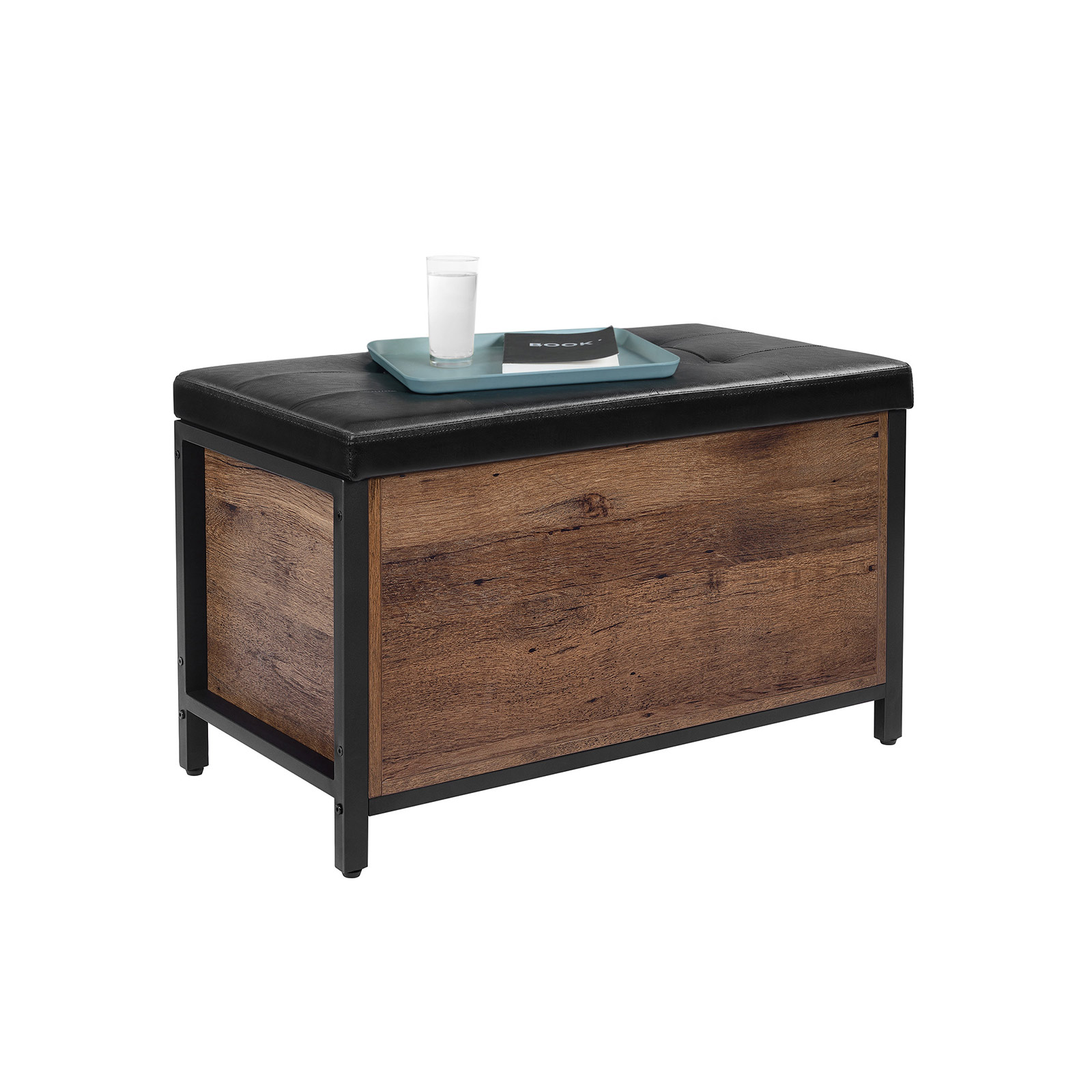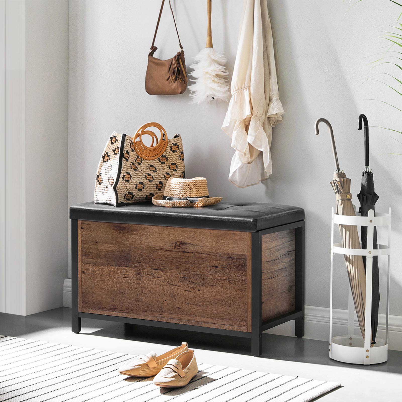 Tuotetiedot: – Väri: hasselpähkinänruskea-musta – Materiaali: lastulevy, teräs, PU-keinonahka, vaahtomuovi – Koko: 80 x 40 x 50 cm (P x L x K) – Paino: 16,9 kg – Istuimen maks. staattinen kantavuus: 90 kg – Säilytyslaatikon maks. staattinen kantavuus: 20 kgToimitus sisältää:- 1 x säilytyslaatikko istuimella- 1 x lisävarustepaketti- 1 x ohjeet (DE, EN, ES, FR, IT)VASAGLE Huomautukset:- Turvallisuussyistä lapset eivät saa kiivetä tuotteelle tai leikkiä sillä. – Tuotteen suurin staattinen kantavuus on 90 kg. Älä ylitä tätä enimmäispainoa.