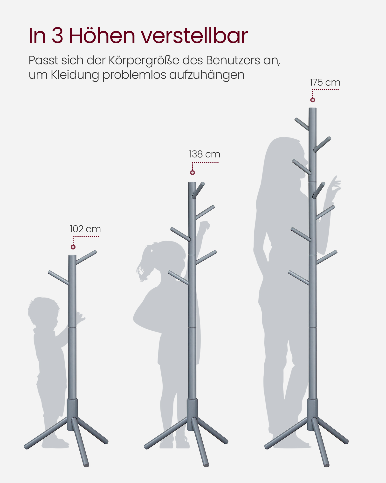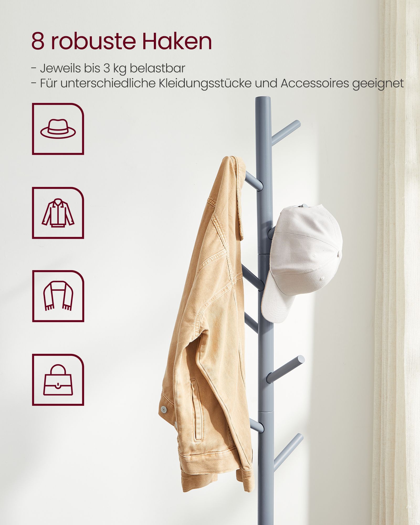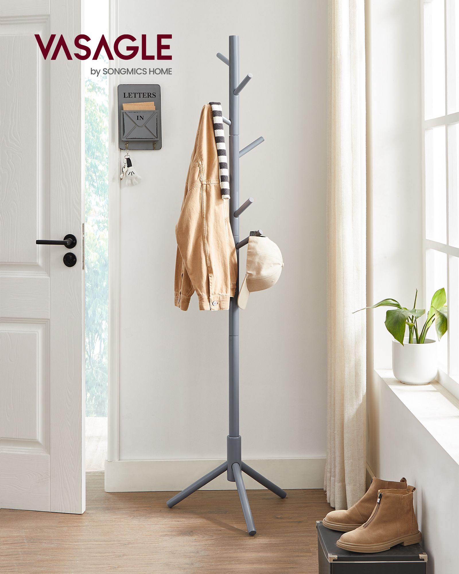VASAGLE vaateteline, vapaasti seisova vaateteline, vaateteline massiivipuusta, puun muotoinen, 8 koukulla, vaatteille, hattuille, laukkuille, eteiseen, sisäänkäyntialueelle, valkoinen RCR04WT