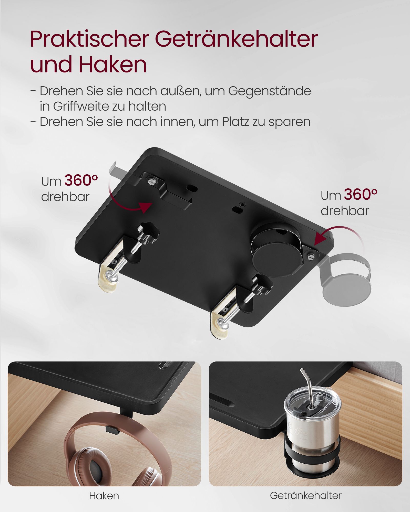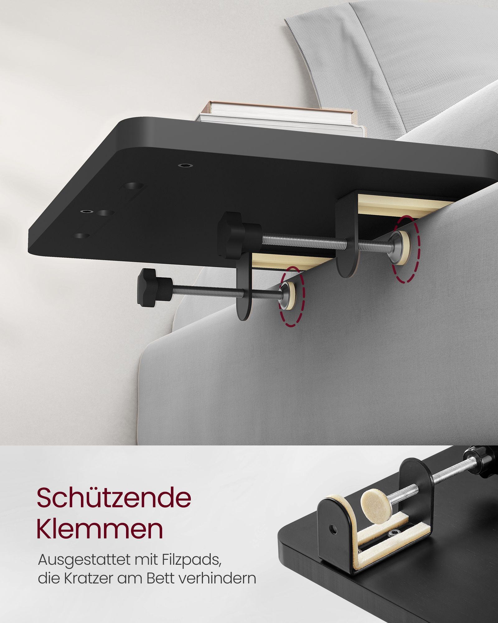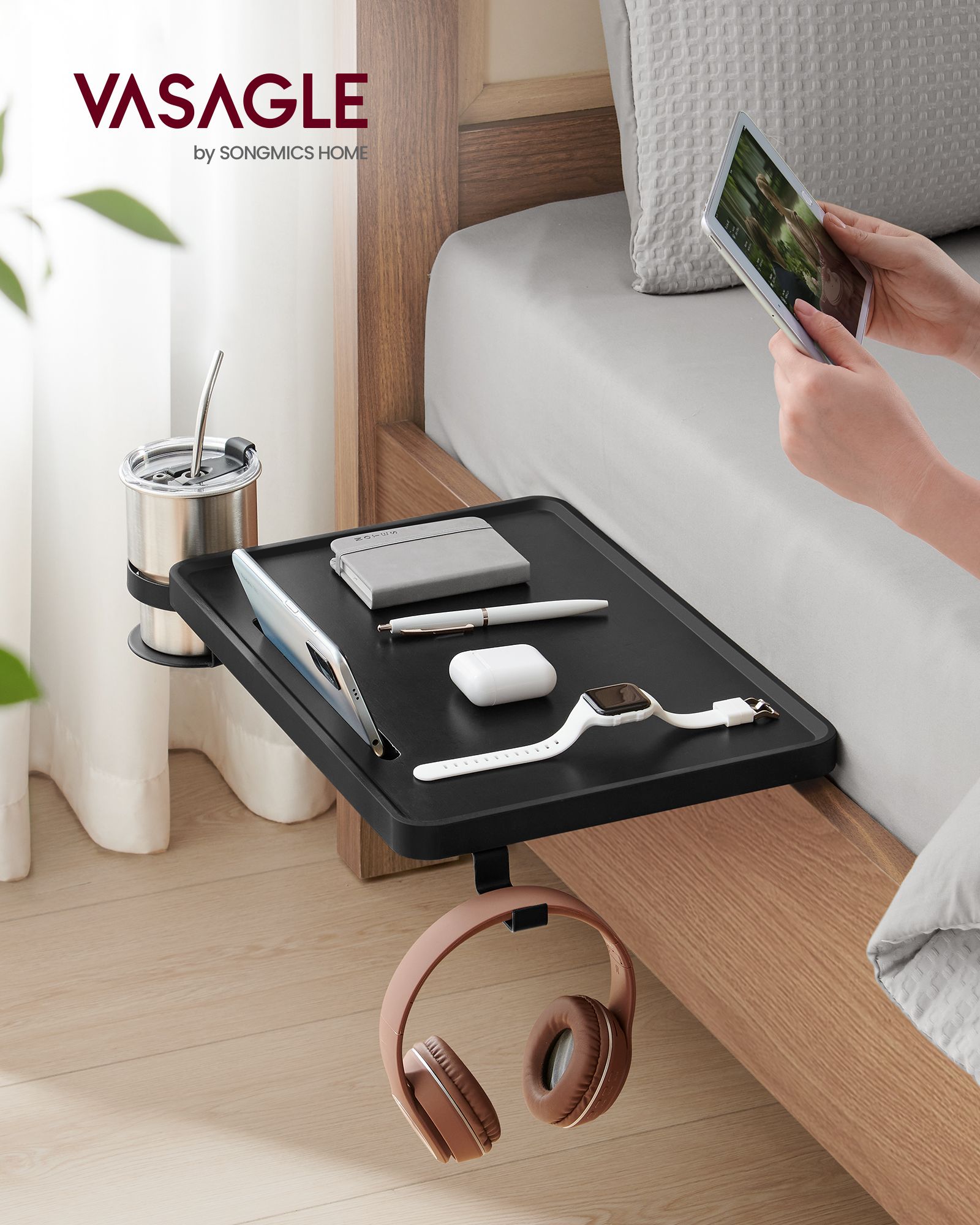 VASAGLE sängyn hylly, ripustettava yöpöytä, hylly korkealle sängylle, aukko matkapuhelimelle, kääntyvä juomatelinekoukku, säädettävät kiinnikkeet, opiskelija-asuntolan huoneeseen