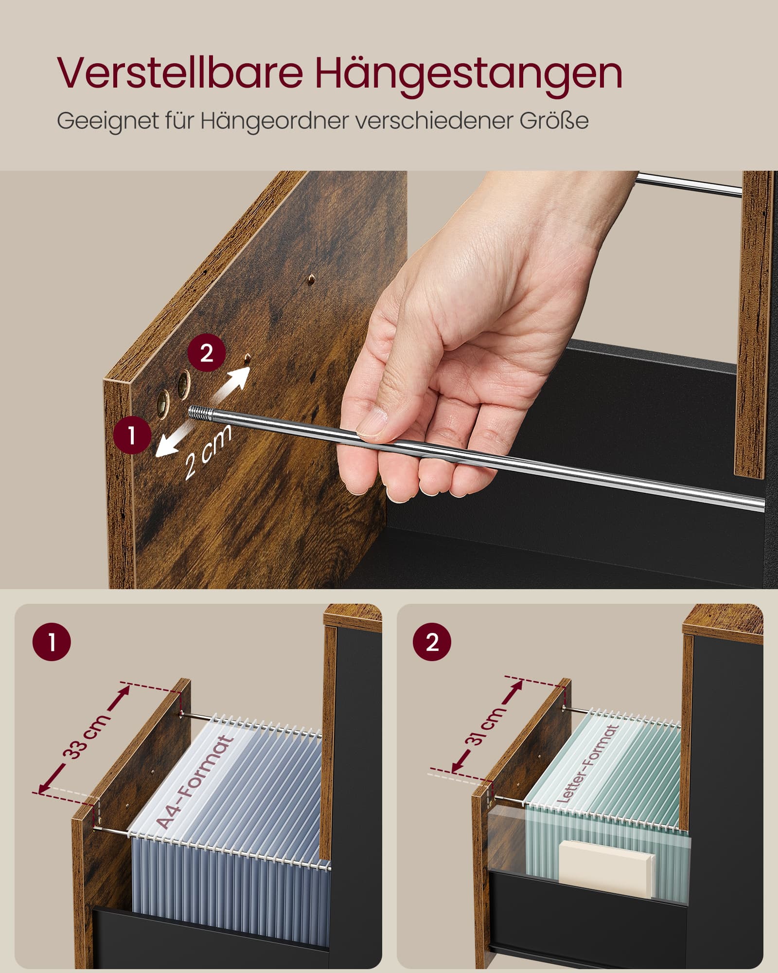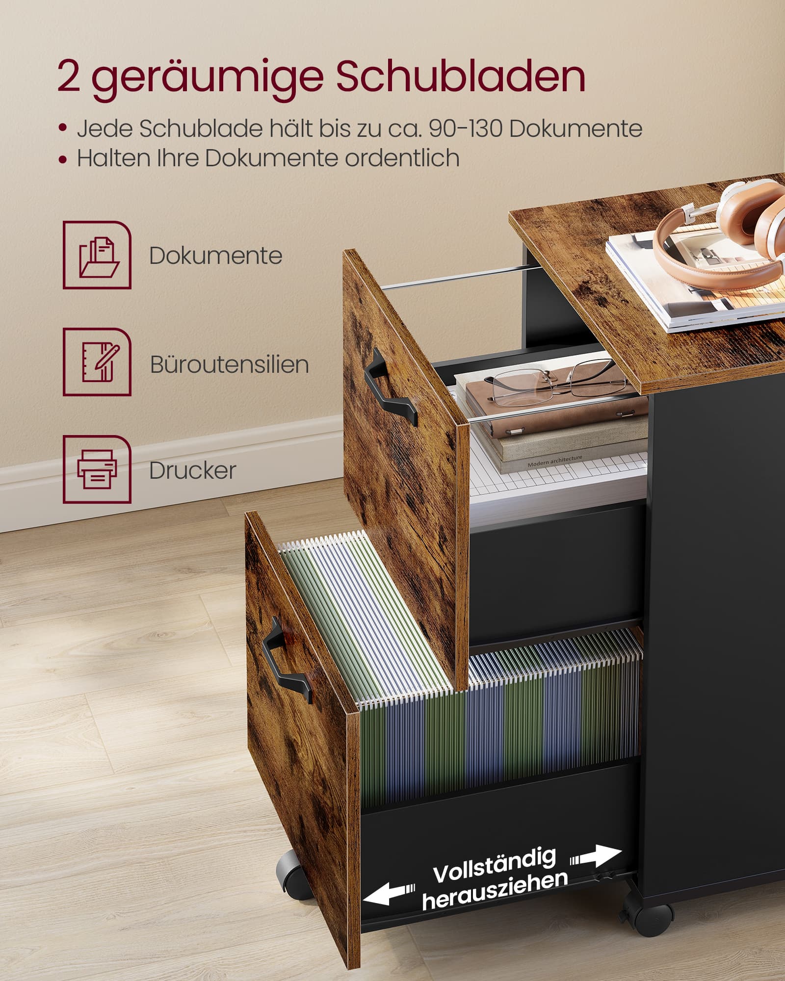 Tuotetiedot: – Väri: vintage-ruskea-musta – Materiaali: lastulevy, teräs – Koko: 42 x 40 x 70 cm (P x L x K) – Paino: 16,3 kg – Maks. staattinen kantavuus: 30 kg Toimitus sisältää: – 1 x rullakontti – 1 x lisävarustepaketti – 1 x ohjeet (DE, EN, ES, FR, IT) VASAGLE Huomautukset: – Turvallisuussyistä lapset eivät saa kiivetä tuotteelle tai leikkiä sillä.