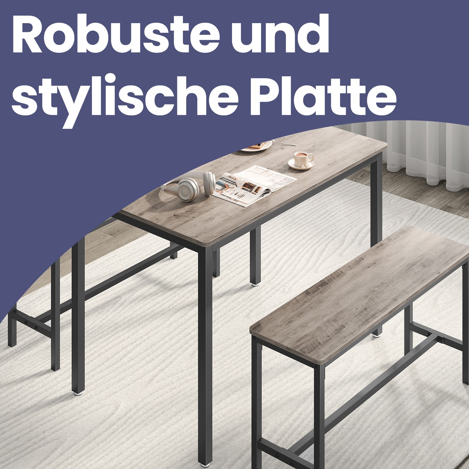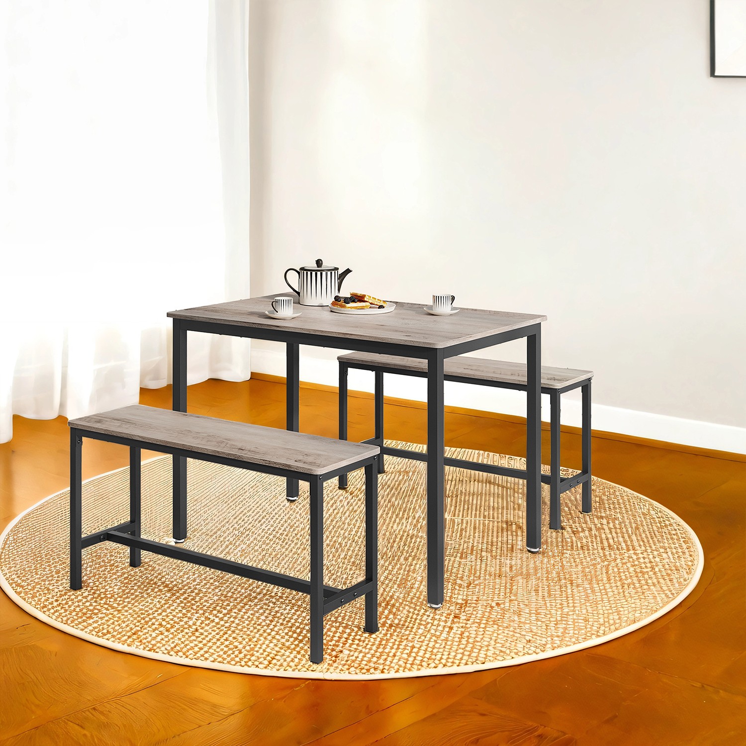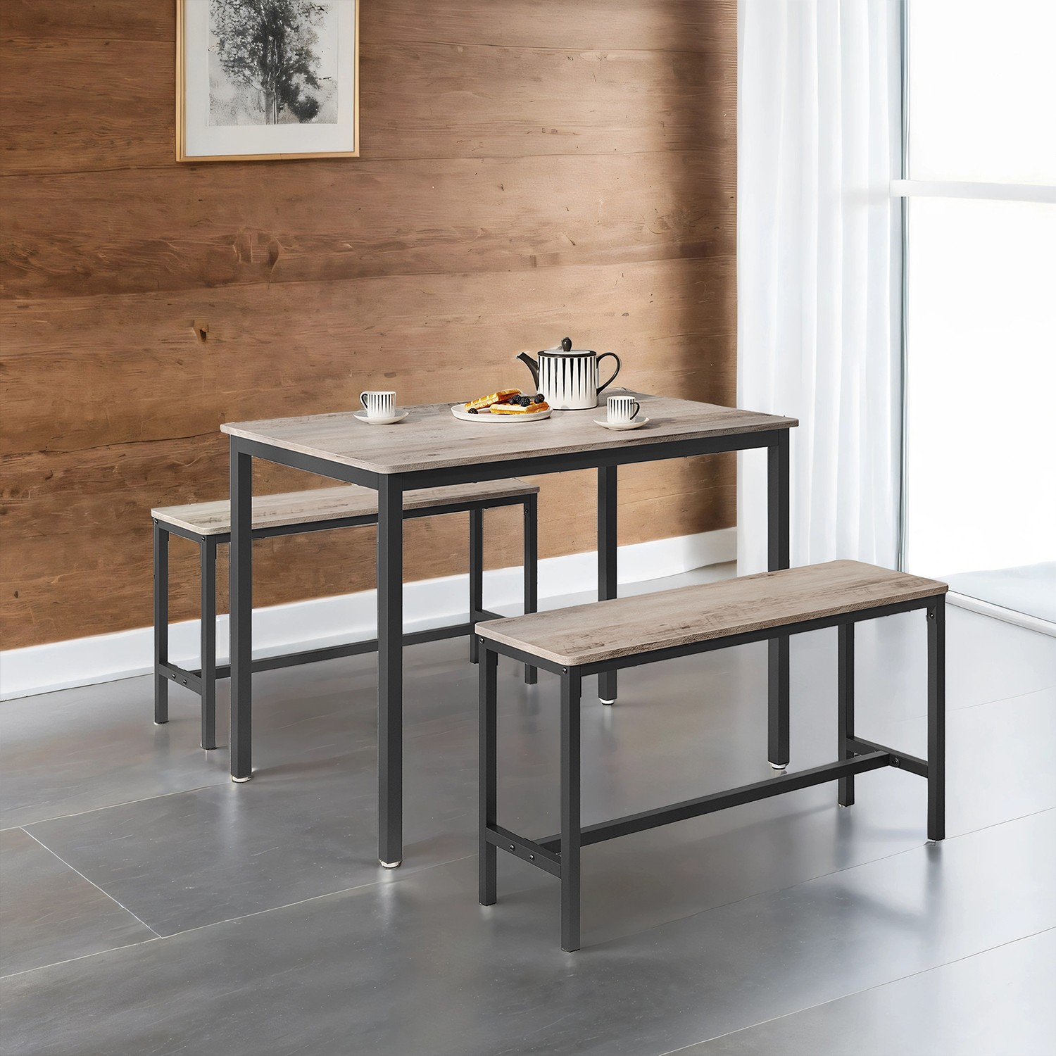 Ruokapöytä 2 penkillä, keittiöpöytä, ruokasalipenkit, teräsrunko, teollinen muotoilu, vintage-ruskea-musta