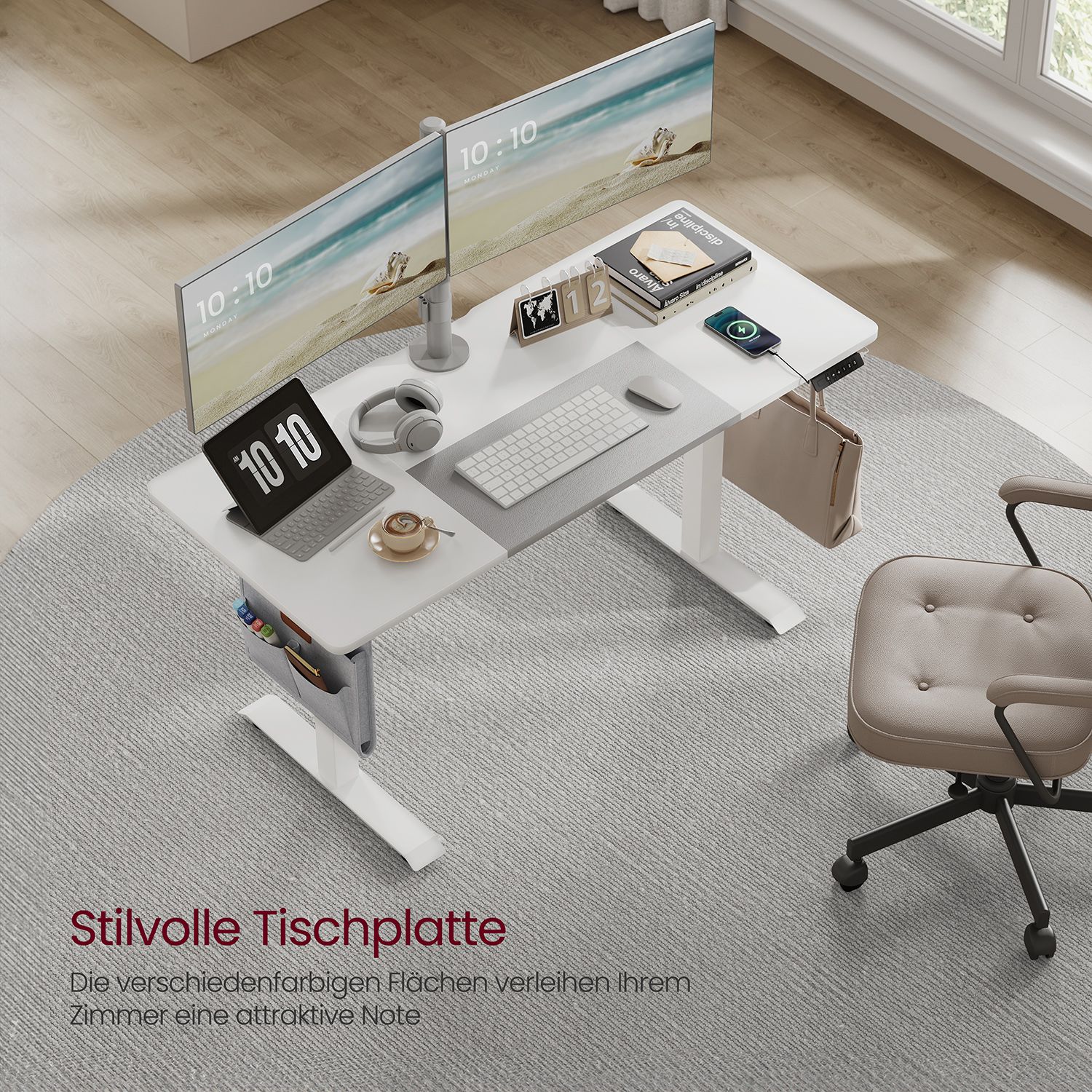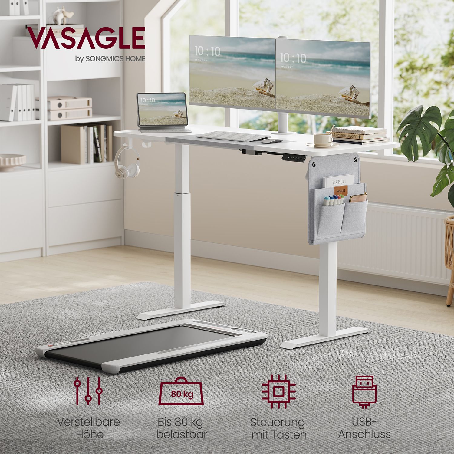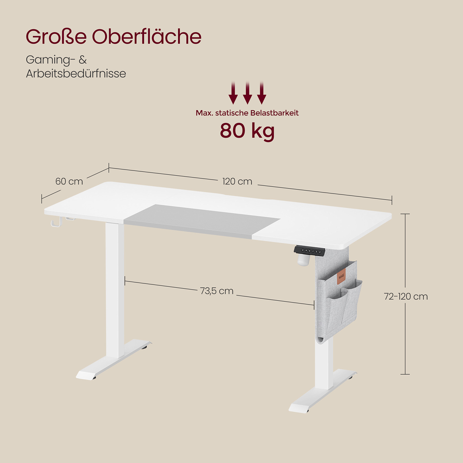 VASAGLE Sähköisesti korkeussäädettävä työpöytä, 72–120 cm, pöytälevy 60 x 120 cm, muistitoiminto 3 korkeudella, järjestelijällä ja koukulla