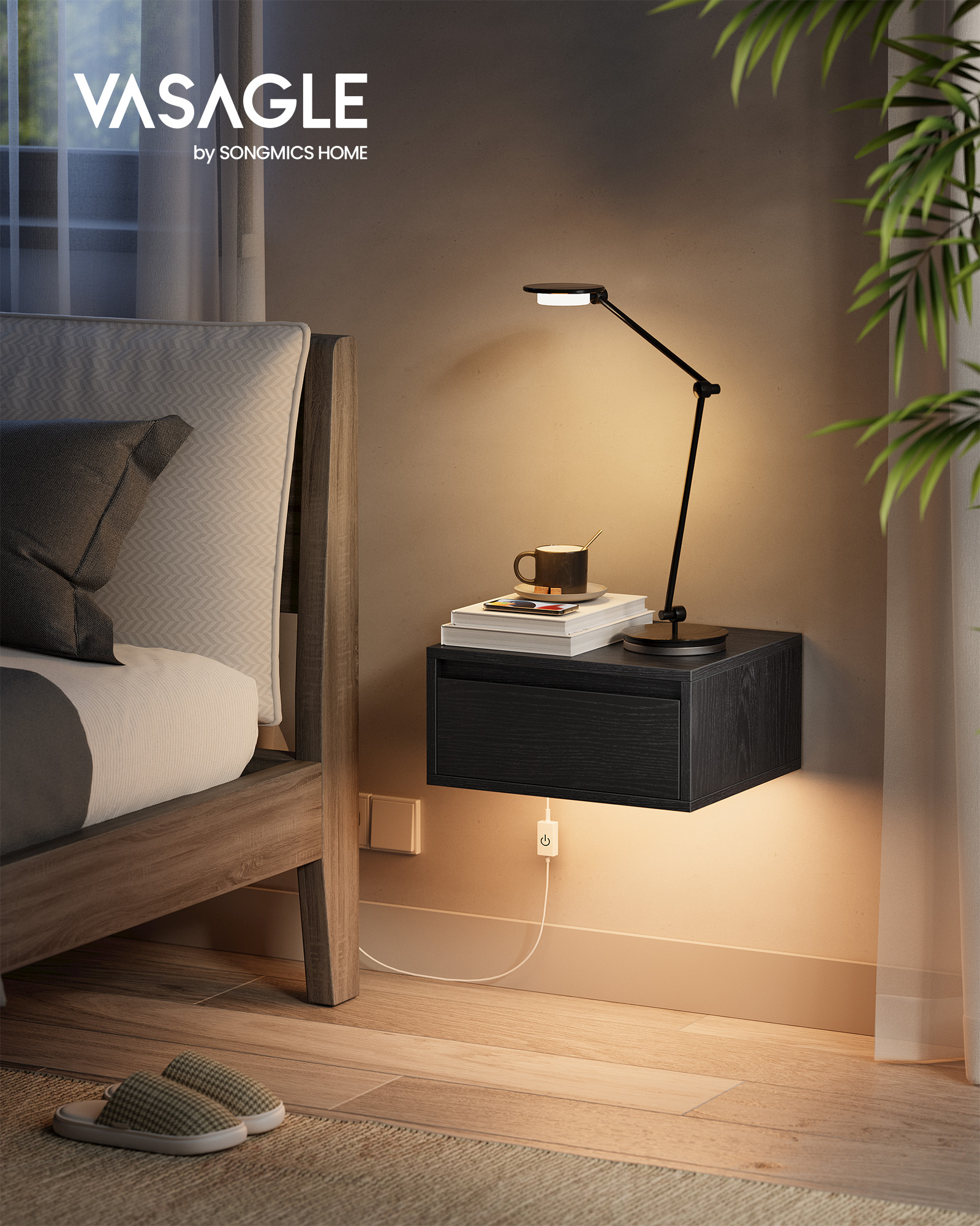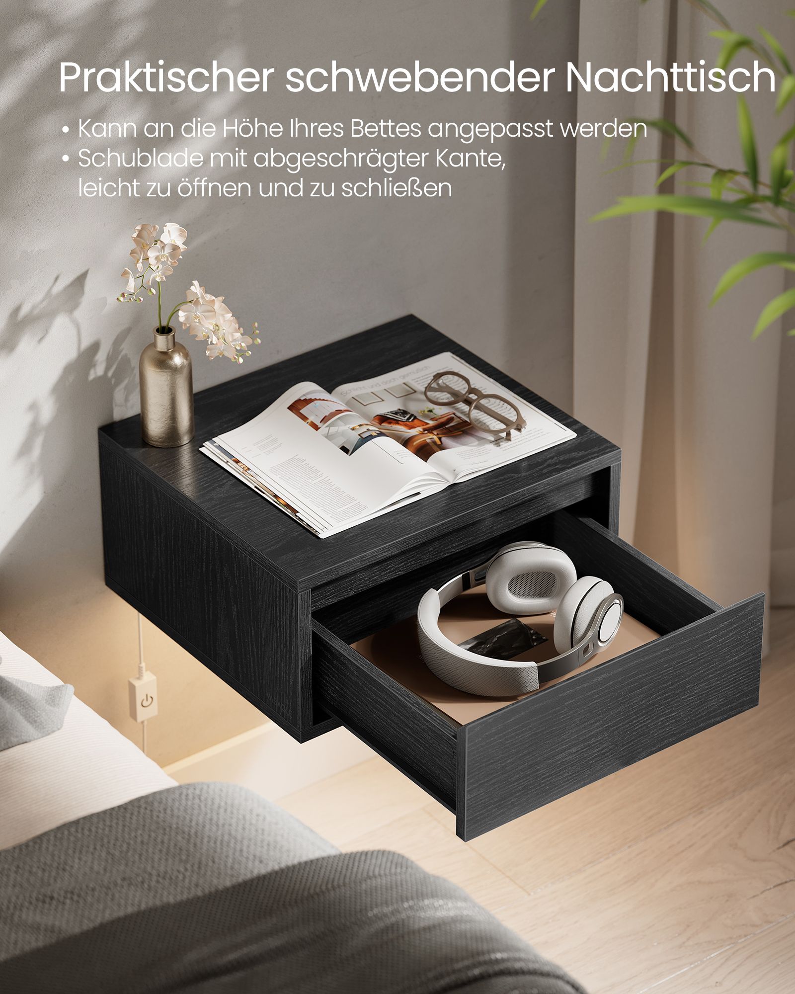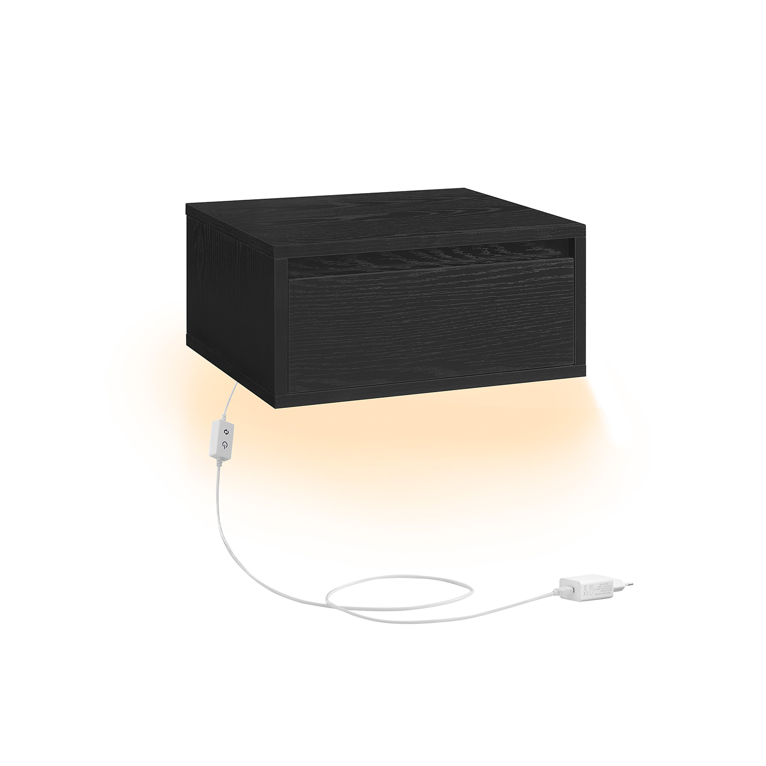 VASAGLE ripustettava yöpöytä, 2 kpl, 3 värinen valaisin, kelluva seinähylly, laatikko, 35 x 40 x 18 cm, moderni, olohuone, makuuhuone, eebenpuunmusta LET854B01