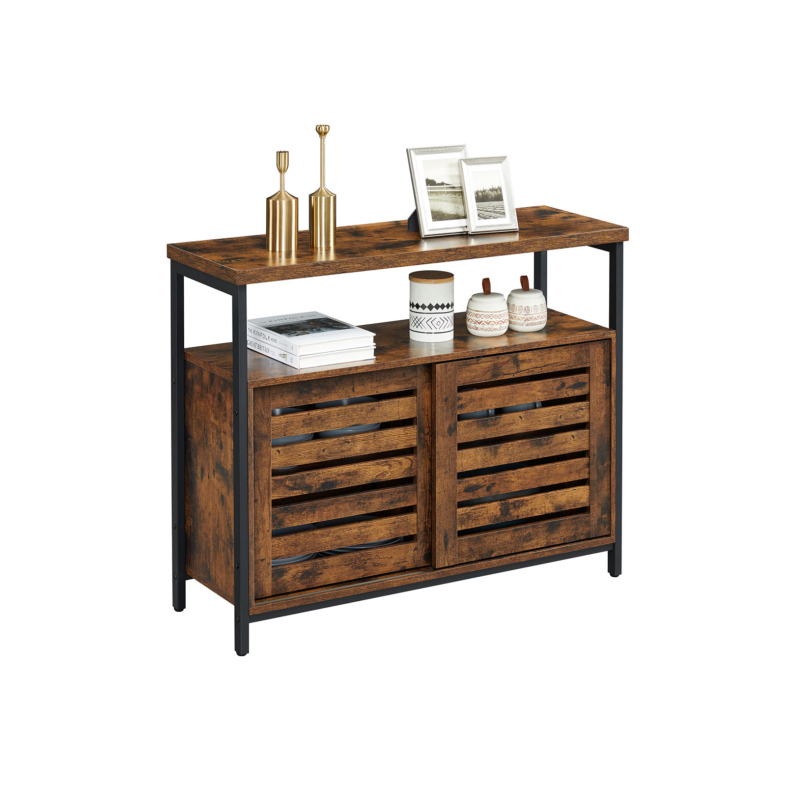 Tuotetiedot: – Väri: vintage-ruskea-musta – Materiaali: lastulevy, teräs – Koko: 100 x 35 x 80 cm (P x L x K) – Paino: 23,9 kg – Maks. staattinen kokonaiskuormitus: 30 kg Toimitus sisältää:- 1 x sivupöytä – 1 x lisävarustepaketti – 1 x kaatumissuoja – 1 x ohjeet (DE, EN, ES, FR, IT) VASAGLE-ohjeet: – Turvallisuussyistä lapset eivät saa kiivetä tuotteen päälle tai leikkiä sillä. – Kiinnitä tämä tuote seinään mukana toimitetulla kaatumissuojalla kaatumisen estämiseksi. Tuotekuvaus