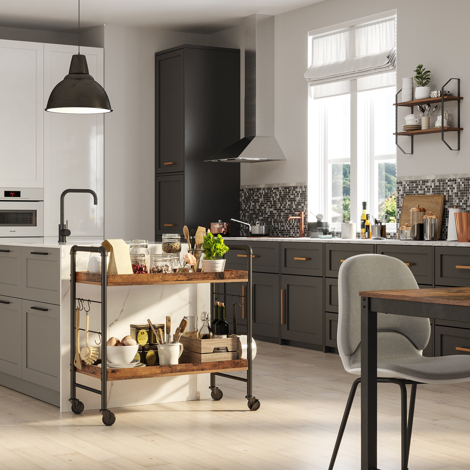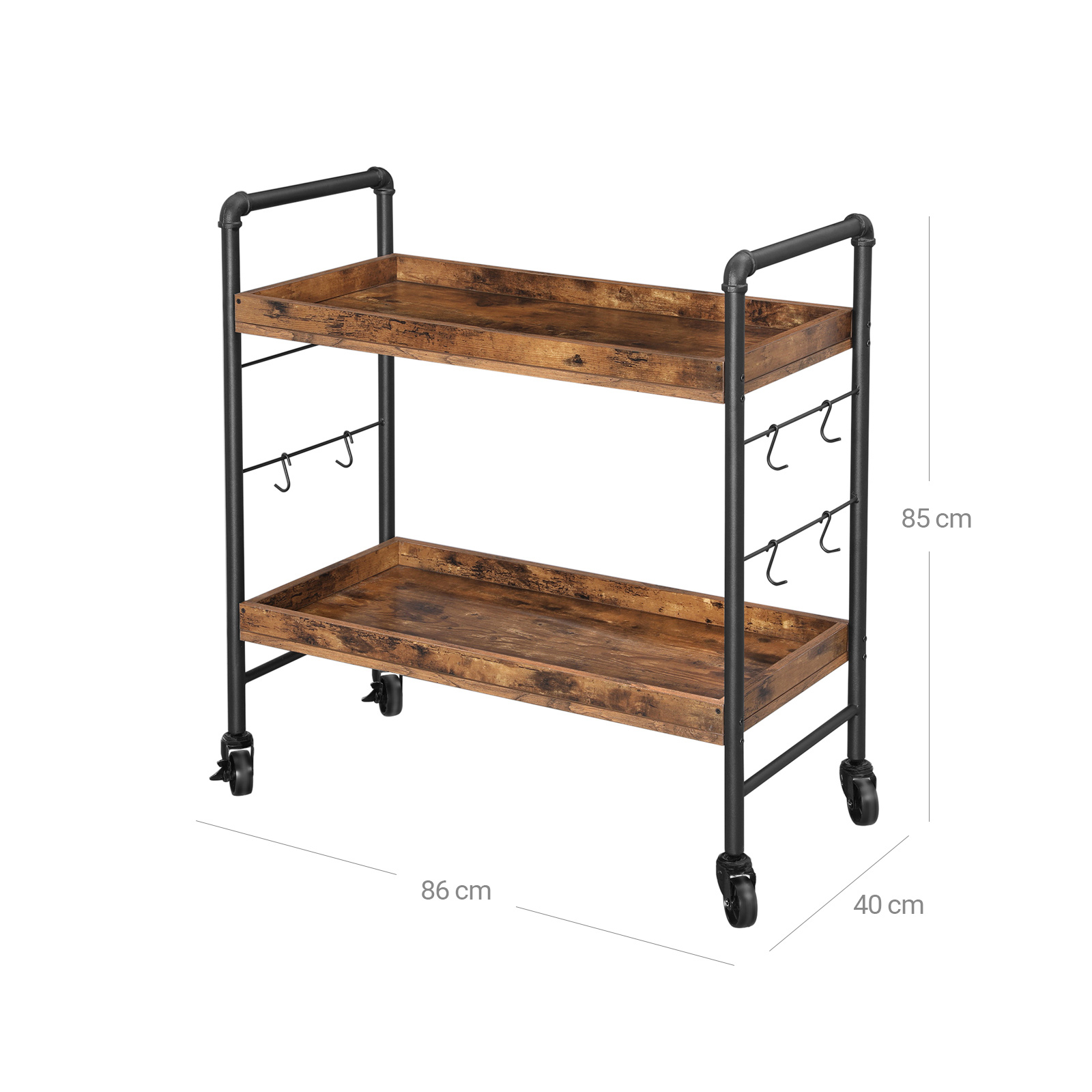 VASAGLE tarjoiluvaunu, keittiövaunu, jossa on yleiskäyttöiset rullat, keittiöhylly koukkuilla, 86 x 40 x 85 cm, suuri säilytystila, tukeva metallirunko, teollinen muotoilu, vintage, tummanruskea LRC85BX