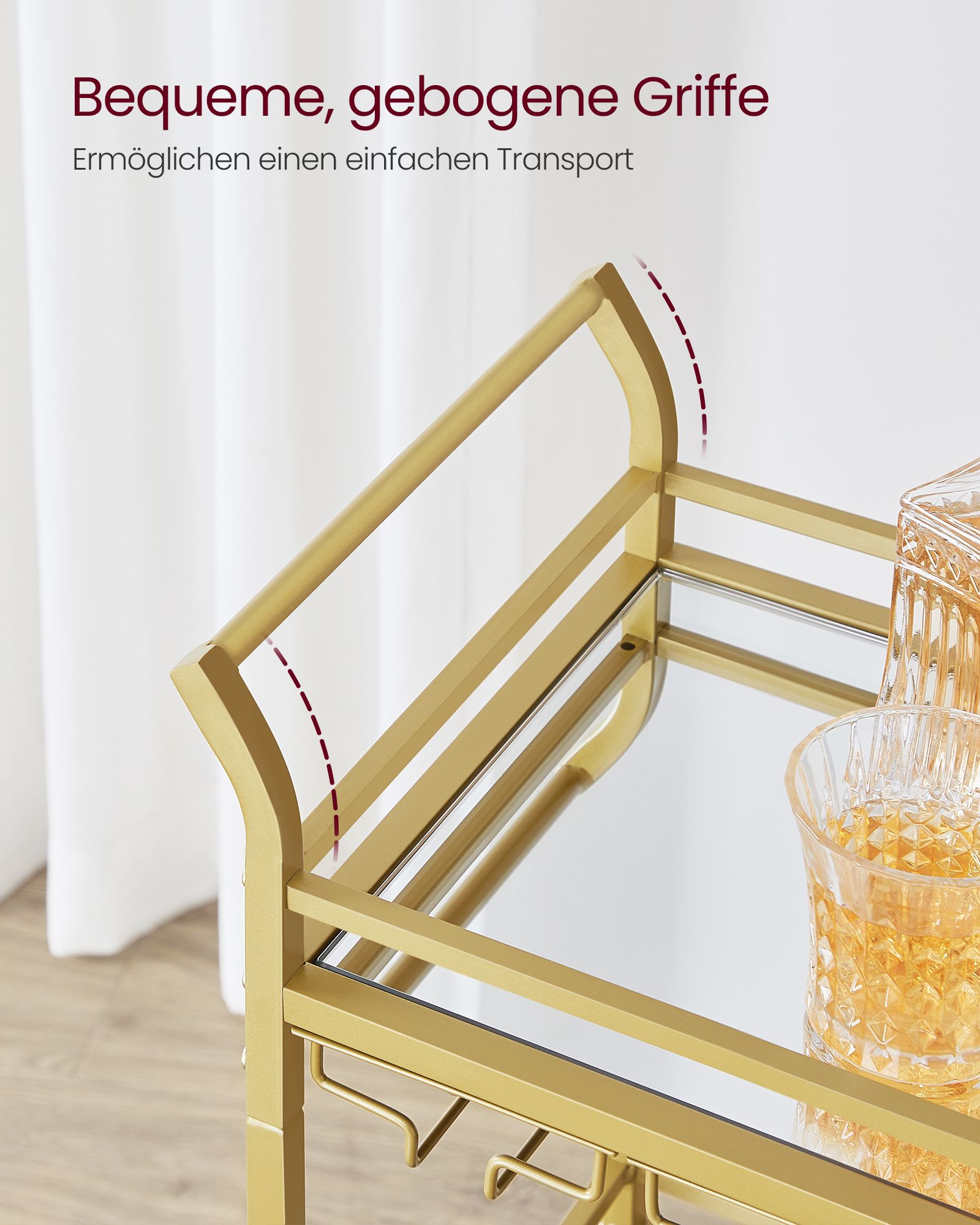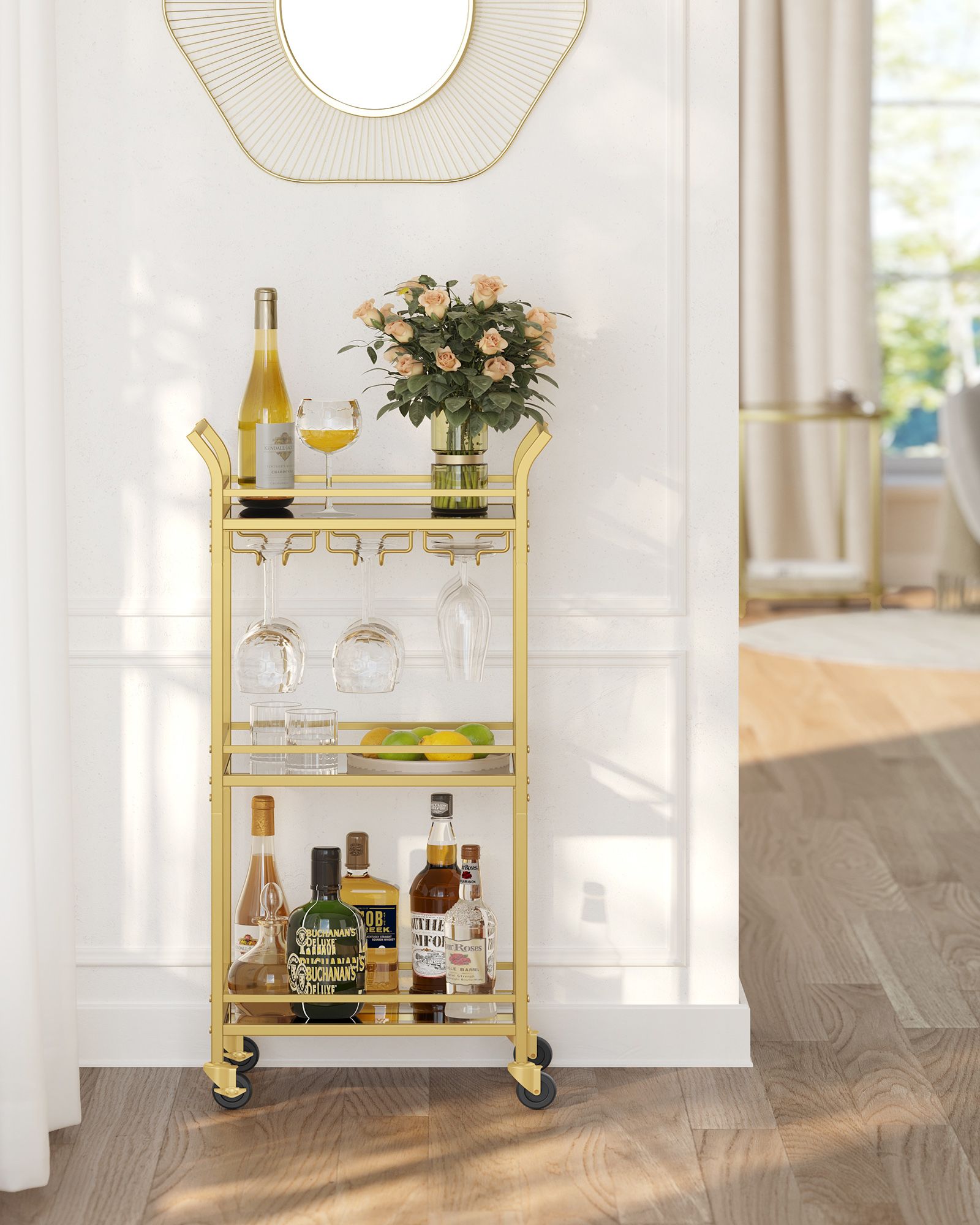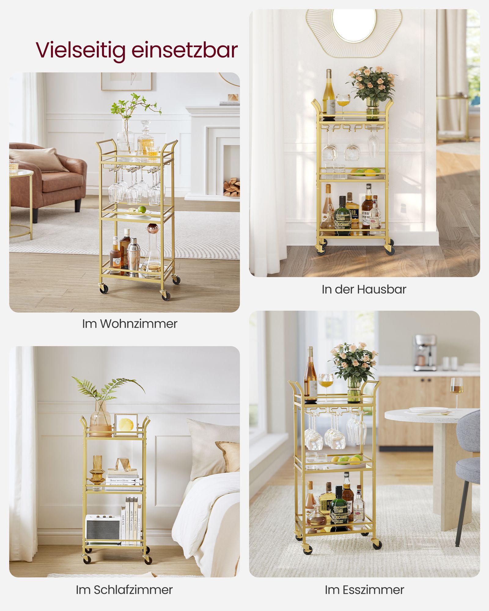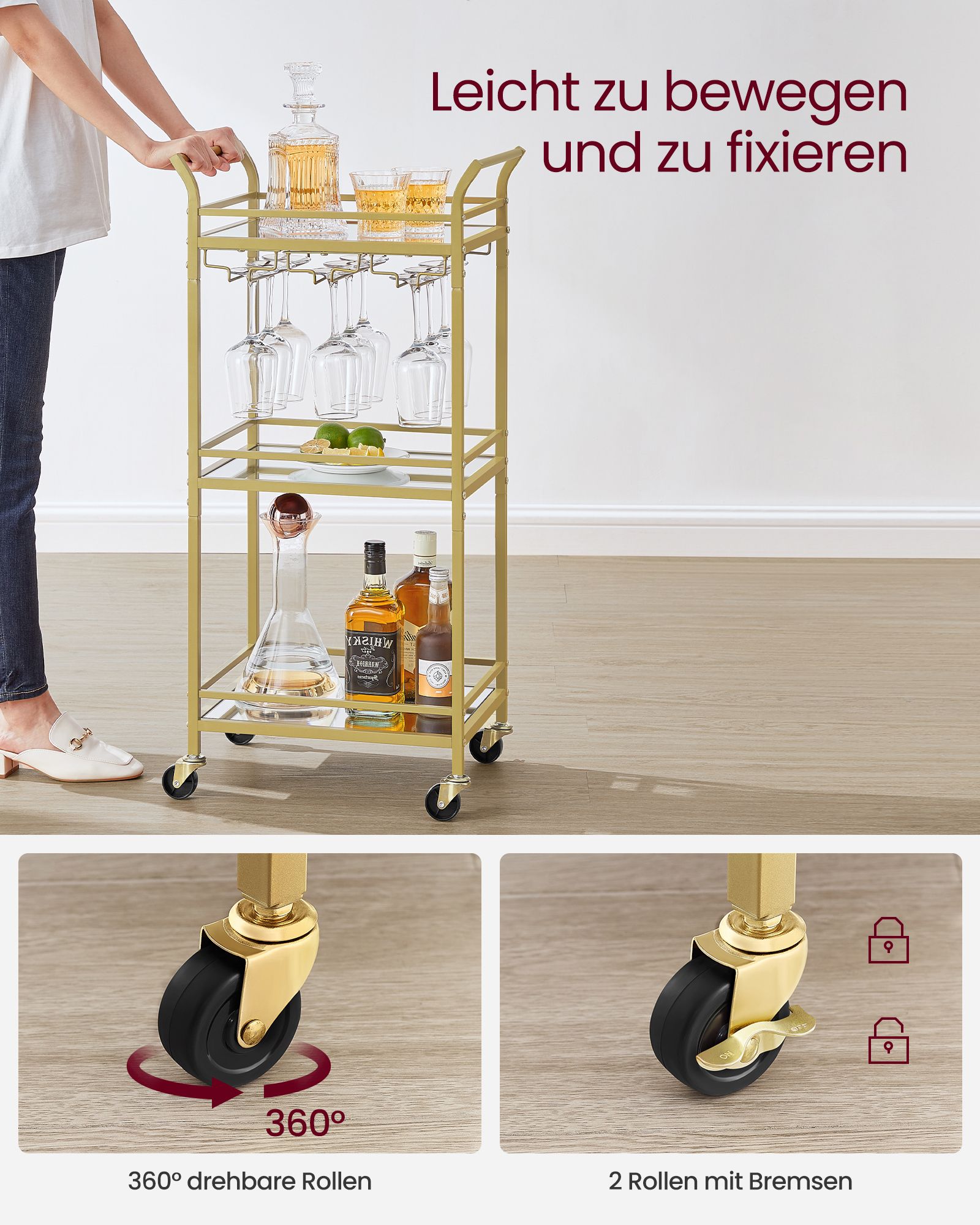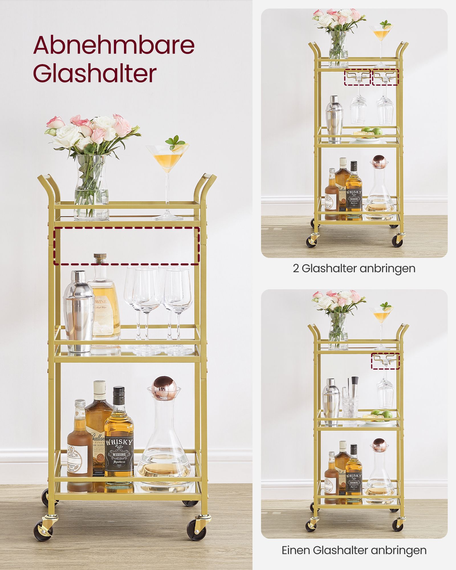 VASAGLE tarjoiluvaunu, 3 tasoa, rullavaunu, rullilla, kahvoilla, peililasihyllyillä, pieniin tiloihin, keittiöön, ruokasaliin, baariin