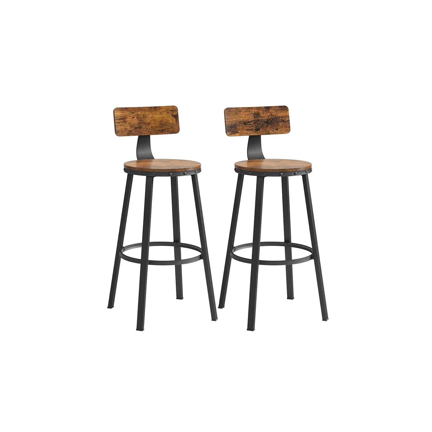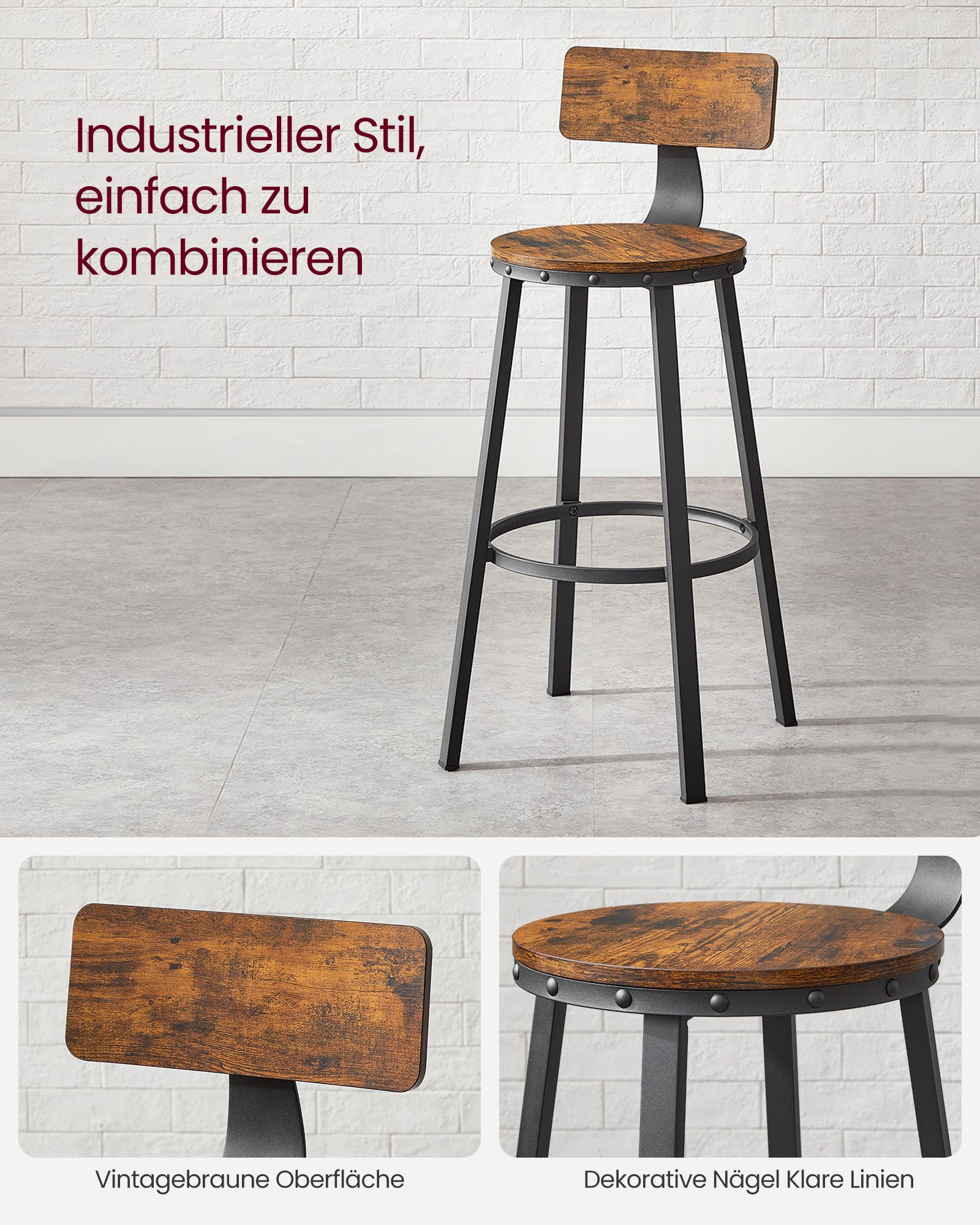 Tuotetiedot: – Väri: vintage-ruskea-musta – Materiaali: puulevy, teräs – Kokonaismitat: 54 x 99 cm (Ø x H) – Istuimen halkaisija: 37 cm – Istuinkorkeus: 73 cm – Paino: 12,3 kg – Maks. staattinen kantavuus per tuoli: 100 kg Toimitus sisältää: – 2 x baarituoli – 1 x lisävarustepaketti – 1 x ohjeet VASAGLE Huomautukset: – Turvallisuussyistä lapset eivät saa kiivetä tuotteelle tai leikkiä sillä. – Tuolin suurin staattinen kantavuus on 100 kg. Älä ylitä tätä enimmäispainoa.