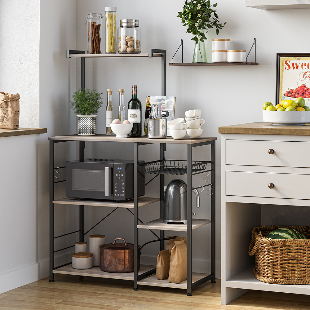 VASAGLE keittiöhylly, seisomahylly metallikorilla, leipomohylly 6 S-koukulla ja hyllyillä, mikroaaltouunihylly, maustehylly, kattiloille ja pannuille, teollinen muotoilu, greige-musta KKS035B02