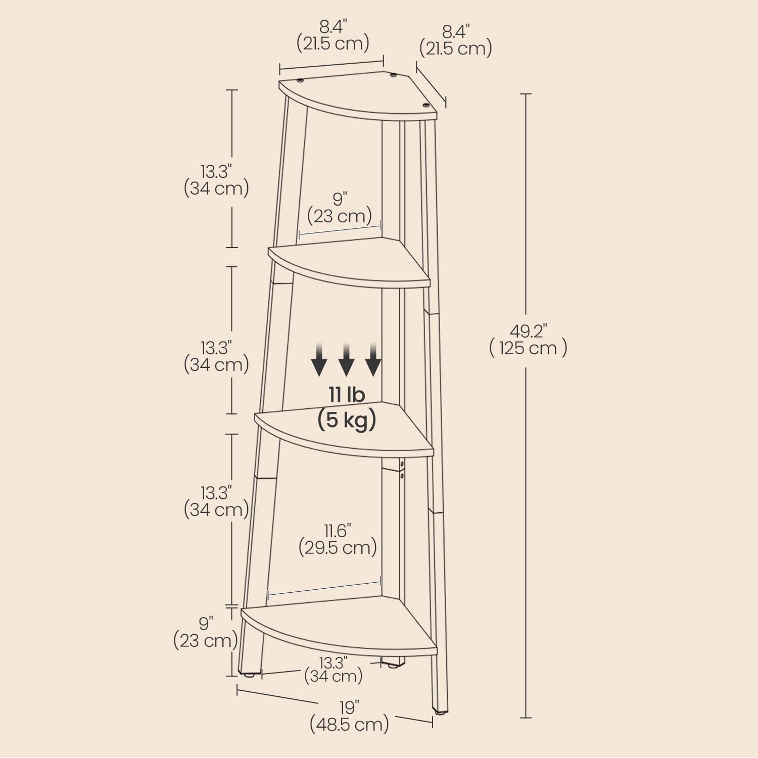 Jos tarvitset lisää tilaa ja haluat hyödyntää kodin kulmat järkevästi, kannattaa valita tämä tikkaat-hylly. Se yhdistää klassisen ja modernin huonekalutyylin viehätyksen. Käytä sitä olohuoneessa Täytä hylly silmiinpistävillä koriste-esineillä, ja siitä tulee varmasti kodin keskipiste. Aseta se työhuoneeseesi, toimistoosi tai kotitoimistoosi Aseta kirjat hyllylle ja säilytä asiakirjat käden ulottuvilla. Käytä sitä kylpyhuoneessa Järjestä pyyhkeet, hygieniatuotteet, wc-paperirullat ja paljon muuta. Aseta se parvekkeelle Esittele ylpeänä kasvisi, akvaariosi ja muut koristeet samalla kun sisustat rentouttavan nurkkauksen. Valitse tämä VASAGLE-kulmahylly ja lisää säilytystilaa sekä kaunis ja toimiva huonekalu kotiisi! Tuotetiedot: – Väri: vintage-ruskea-musta – Materiaali: puulevy, teräs – Mitat: 34 x 125 x 34 cm (L x K x S) – Paino: 6,87 kg – Maks. staattinen kantavuus hyllyä kohti: 5 kg Toimitus sisältää: – 1 x kulmahylly – 1 x lisävarustesarja – 1 x ohjeet (DE, EN, FR, ES, IT) VASAGLE-ohjeet: – Vältä suoraa auringonvaloa. – Vältä kosketusta terävien ja terävien esineiden, kuten veitsien, kanssa, jotta pinta ei vahingoitu.