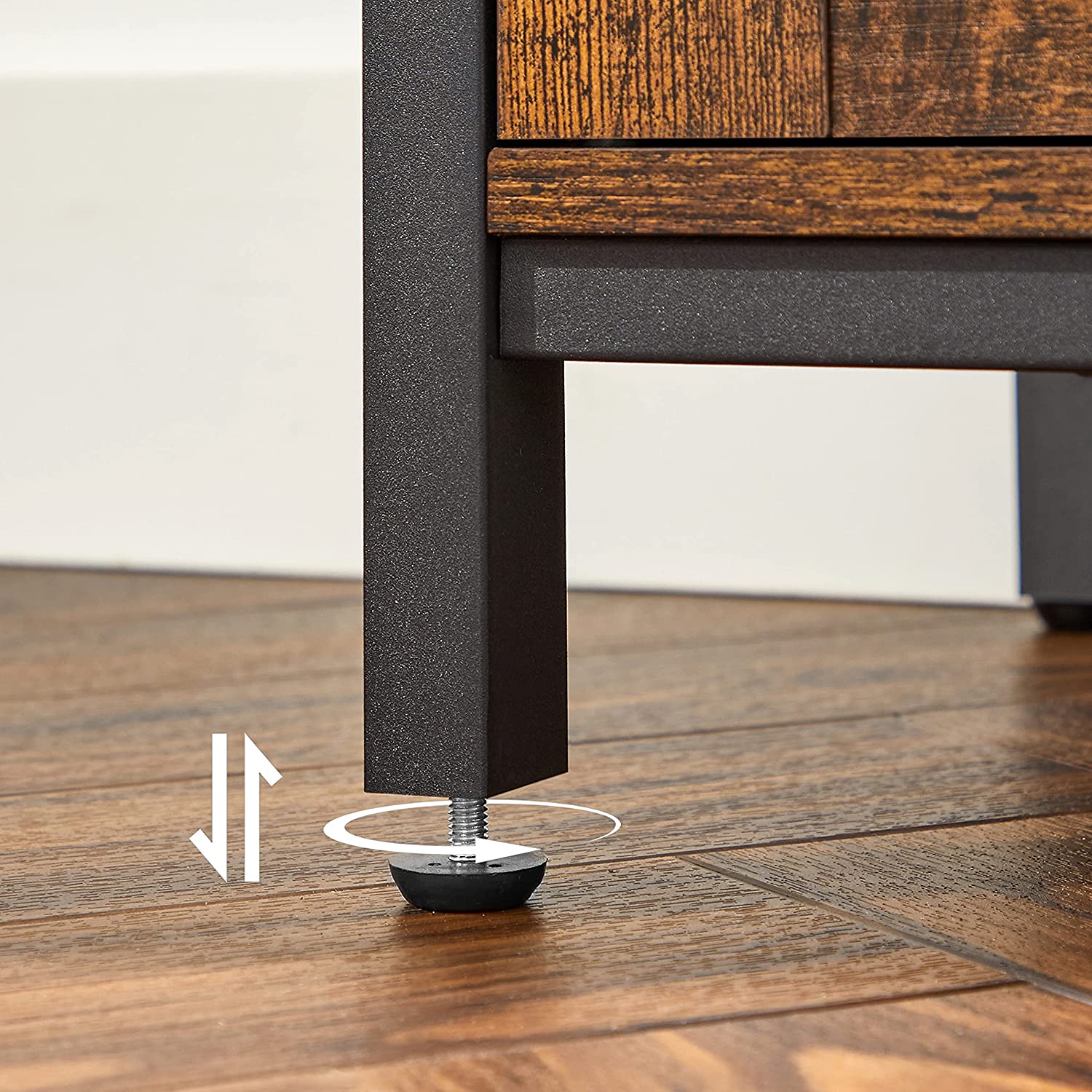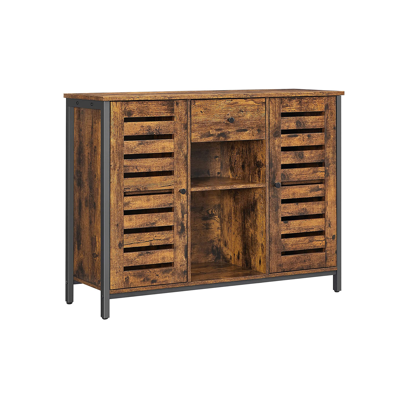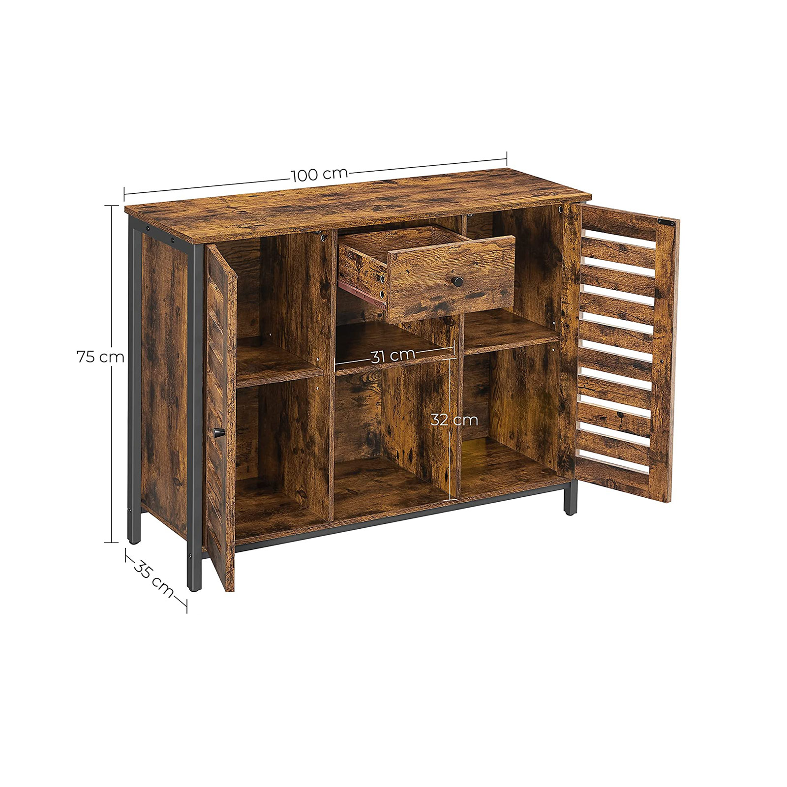 Tuotetiedot: – Väri: vintage-ruskea-musta – Materiaali: lastulevy, teräs – Koko: 100 x 35 x 75 cm (P x L x K) – Paino: 27,1 kg – Pinnan maks. staattinen kantavuus: 30 kg – Laatikon maks. staattinen kantavuus: 5 kg – Hyllyn maks. staattinen kantavuus: 10 kg Toimitus sisältää: – 1 x sivupöytä – 1 x lisävarustepaketti – 1 x ohjeet VASAGLE Huomautukset:- Turvallisuussyistä lapset eivät saa kiivetä tuotteen päälle tai leikkiä sillä.