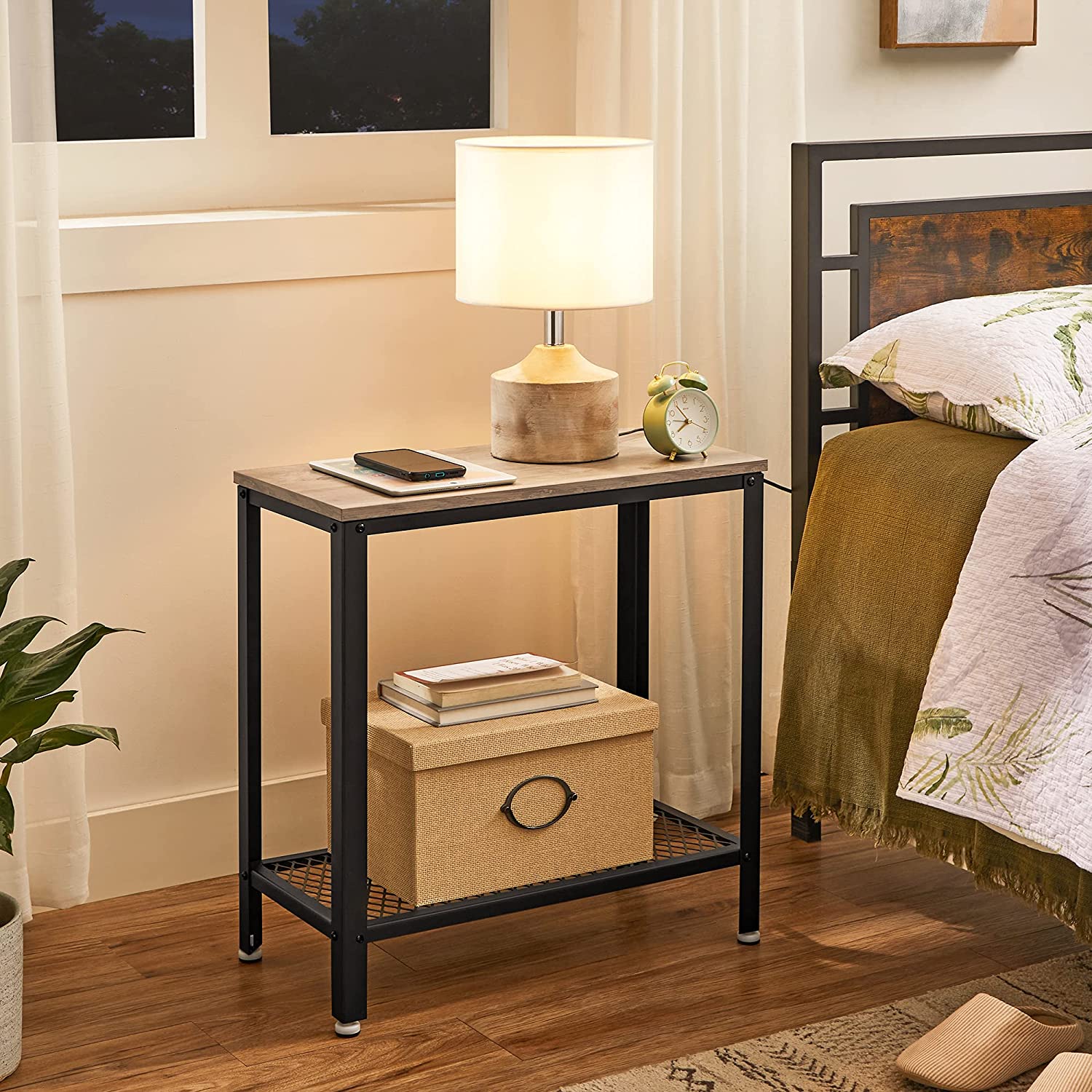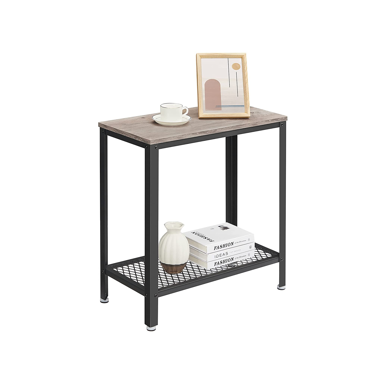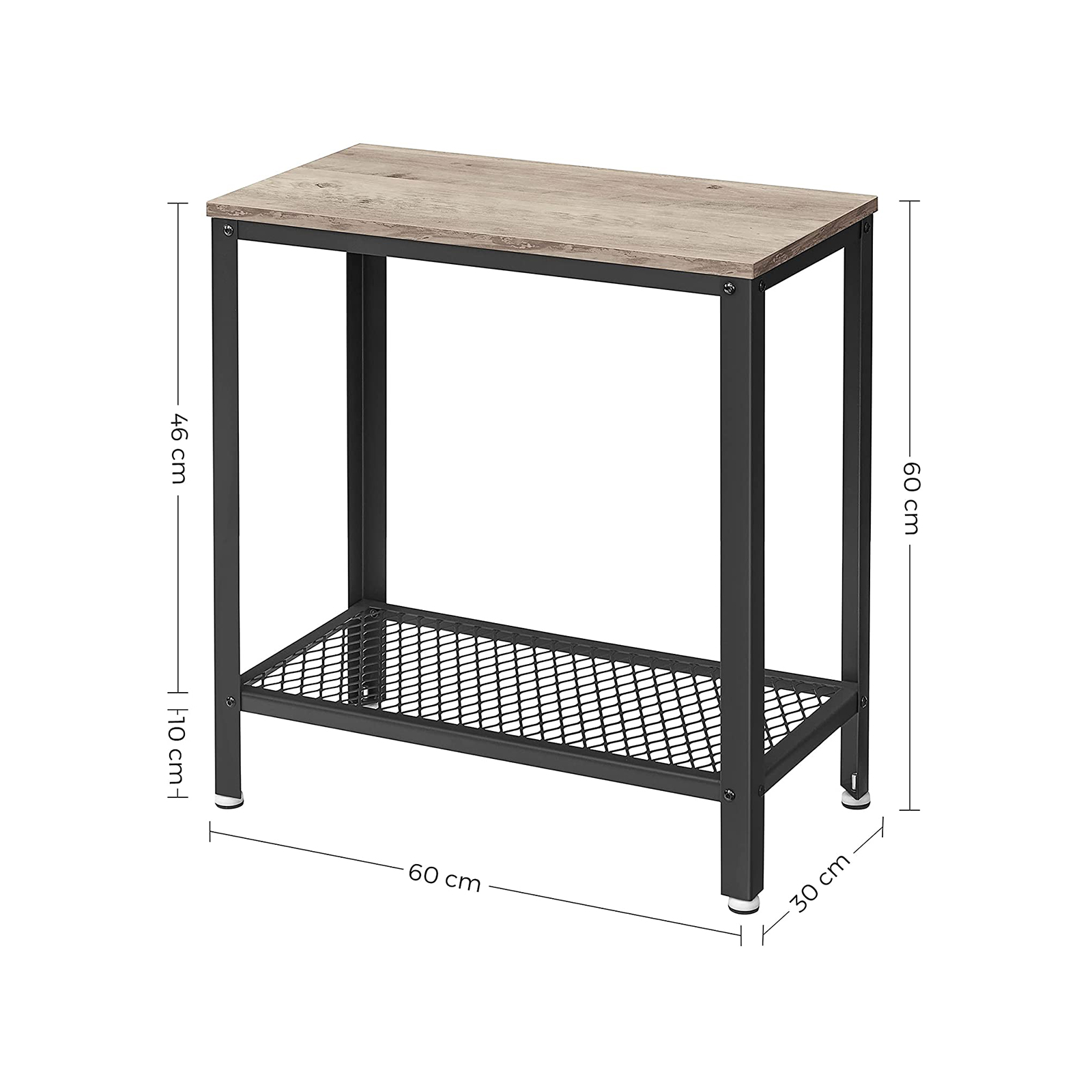 Tuotetiedot: – Väri: greige-musta – Materiaali: lastulevy, teräs – Koko: 60 x 30 x 60 cm (P x L x K) – Paino: 5,4 kg – Maks. staattinen kantavuus pinta: 20 kg – Maks. staattinen kantavuus ritilähylly: 10 kg Toimitus sisältää:- 1 x sivupöytä – 1 x lisävarustepaketti – 1 x kuusiokoloavain – 1 x ohjeet VASAGLE Huomautukset: – Turvallisuussyistä lapset eivät saa kiivetä tuotteelle tai leikkiä sillä.