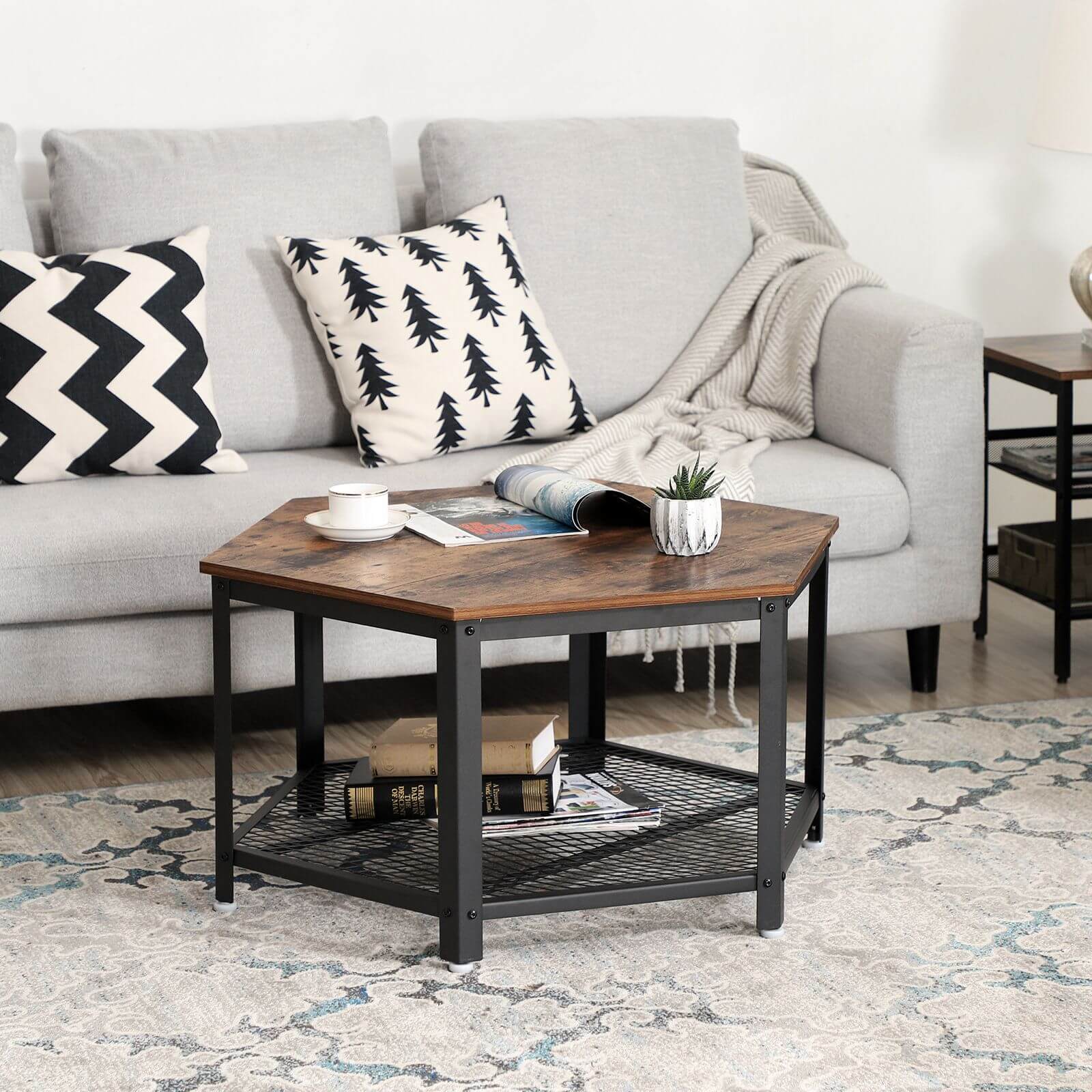 VASAGLE – Se edustaa mielikuvituksellista yhdistelmää toiminnallisuutta, kestävyyttä ja tyylikkäitä vintage-malleja. Jos haluat antaa huoneillesi yksilöllisen ilmeen ja antiikkisen sävyn, tällä huonekalusarjalla voit saavuttaa vaikuttavia tuloksia. Kutsu perhe ja ystävät yhteen pöydän ääreen Tämän sohvapöydän vintage-design luo kodikkaan tunnelman olohuoneeseesi ja kutsuu vieraasi viipymään. Kokoa ystäväsi pian 75 x 45 x 75 cm (L x K x S) kokoisen pöydän ääreen ja järjestä hauska peli-ilta. Pelikokoelmasi mahtuu täydellisesti käytännölliselle ritilähyllylle. Tai ehkä pidät siitä, että tarjoat välipaloja ja juomia olohuoneen pöydällä ja rentoudut perheen kanssa television ääressä? Riippumatta siitä, mitä suunnitelmia sinulla on, VASAGLE:n vintage-huonekalujen avulla voit toteuttaa sisustussuunnitelmasi helposti! Tuotetiedot: – Väri: vintage, musta – Materiaali: rautakehys, puulevy (paksuus: 15 mm) – Mitat: 75 x 45 x 75 cm (L x K x S) – Paino: 14 kg Toimitus sisältää: – 1 x sohvapöytä – 1 x lisävarustepussi – 1 x ohjeet (DE, EN, FR, ES, IT) VASAGLE-huomautukset: – Tuote on tarkoitettu käytettäväksi vain sisätiloissa. Aseta se kuivaan ympäristöön.