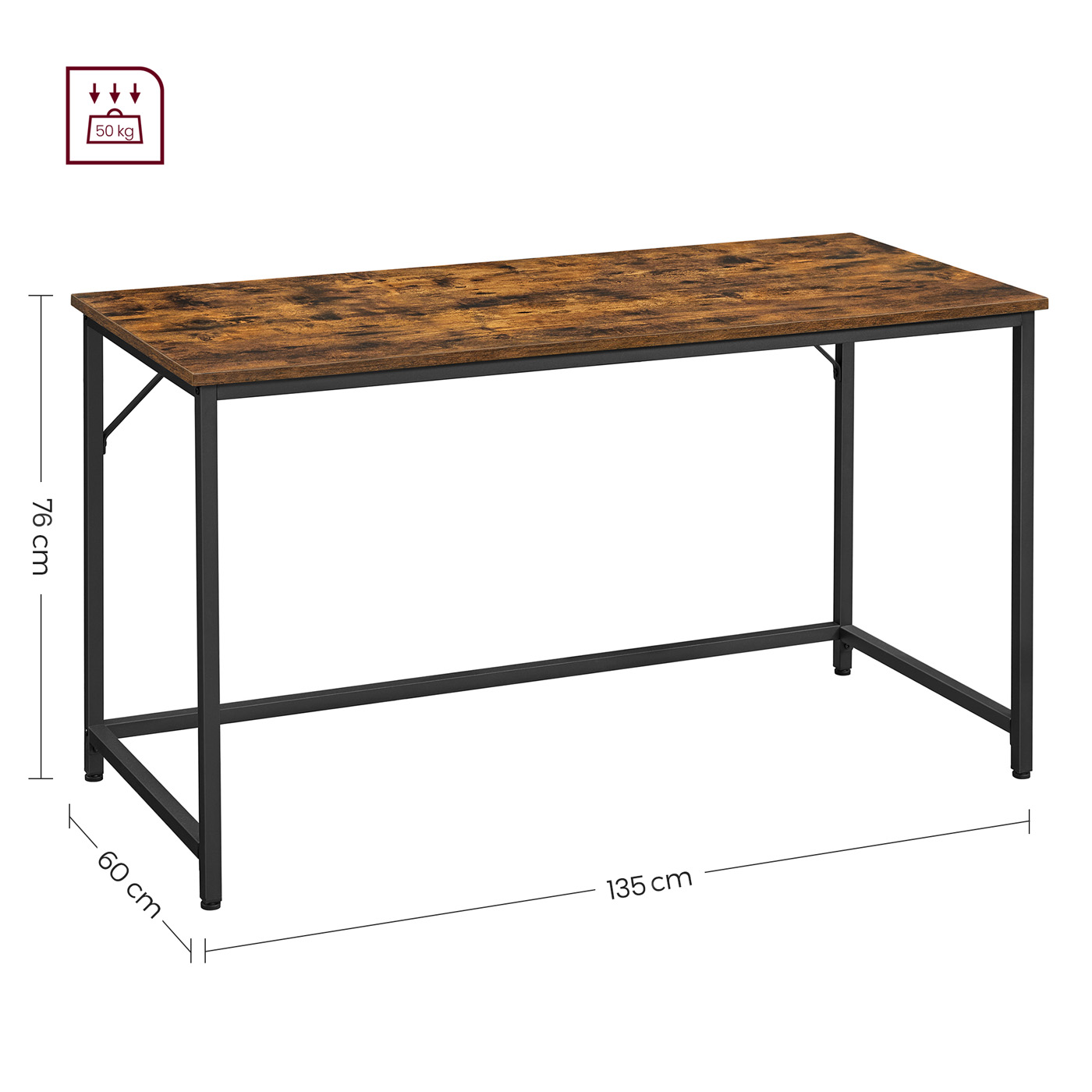 Tuotetiedot: – Väri: vintage-ruskea-musta – Materiaali: lastulevy, teräs – Koko: 135 x 60 x 75 cm (P x L x K) – Paino: 14,2 kg – Maks. staattinen kantavuus: 50 kg Toimitus sisältää: – 1 x työpöytä – 1 x lisävarustepaketti – 1 x ohjeet VASAGLE Huomautukset: – Turvallisuussyistä lapset eivät saa kiivetä tuotteelle tai leikkiä sillä.