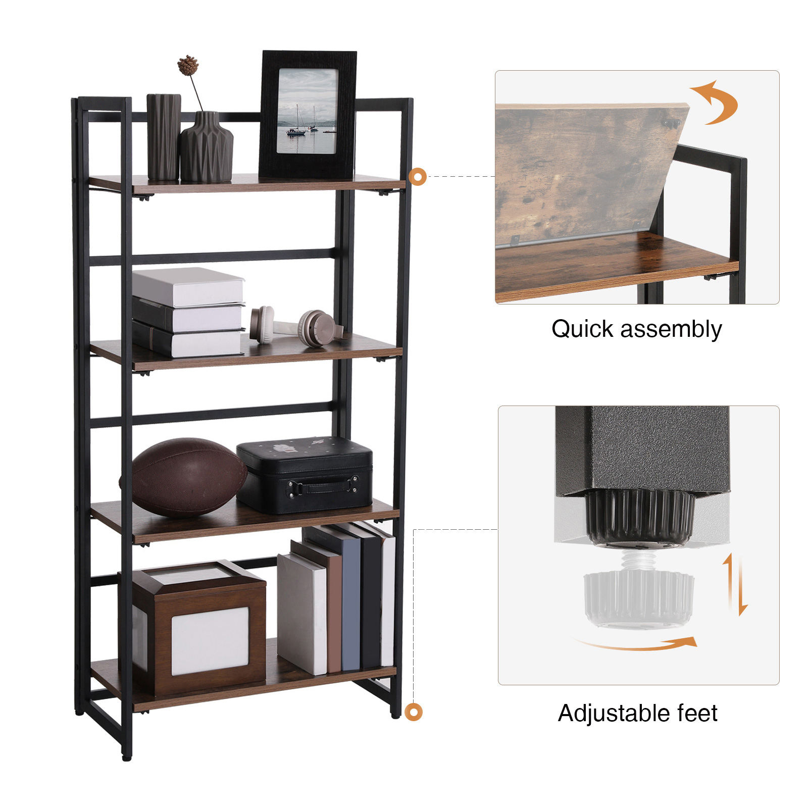 Älykäs muotoilu Taitettavan rungon ansiosta VASAGLE-varastohylly on helppo koota vain kahdessa vaiheessa. Kirjahyllyn kuljettaminen ja kokoaminen ei ole koskaan ollut näin helppoa, mikä on erityisen hyödyllistä muuton yhteydessä. Lisäpoikkipalkit huonekalun takaosassa lisäävät vakautta ja varmistavat, että taitettavan hyllyn päälle asetetut esineet eivät putoa. Aina käyttövalmis Kestävä rauta ja vintage-tyylinen eleganssi – tämä 4-tasoinen hylly on yksinkertaisen kaunis. Houkuttelevan ulkonäönsä ja toimivan muotoilunsa ansiosta tämä huonekalu sopii mihin tahansa huoneeseen. Voit esimerkiksi sijoittaa sen olohuoneeseen ja asettaa sen päälle silmiinpistäviä koriste-esineitä. Hylly sopii erinomaisesti myös kirjojen ja asiakirjojen säilytykseen toimistossa. Tai käytä sitä parvekkeella kauniiden kasvien säilytykseen, autotallissa, keittiössä… Tätä helposti koottavaa hyllyä on pakko rakastaa! Kokeile sitä! Ehkä tilaat jopa kaksi? Tuotetiedot: – Väri: vintage-ruskea, musta – Materiaali: lastulevy, teräs – Koko: 60 x 125,5 x 30 cm (L x K x S) – Paino: 15,6 kg – Maks. staattinen kantavuus hyllyä kohti: 5 kg Toimitus sisältää: – 1 x kokoontaitettava hylly – 1 x lisävarustepussi – 1 x kaatumissuoja – 1 x ohjeet (EN, DE, FR, ES, IT) VASAGLE Huomautukset: – Vältä sijoittamasta hyllyä kosteaan ympäristöön pitkäksi ajaksi. – Älä aseta raskaita esineitä hyllylle.