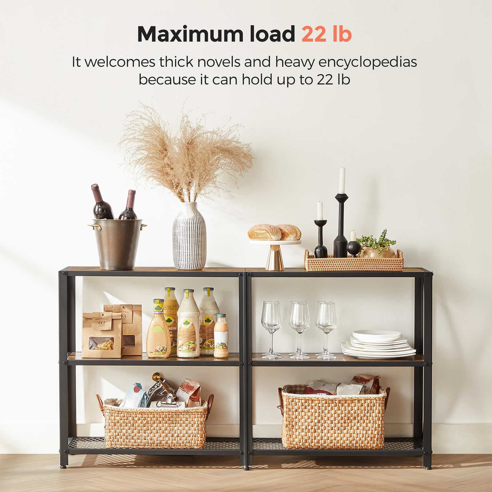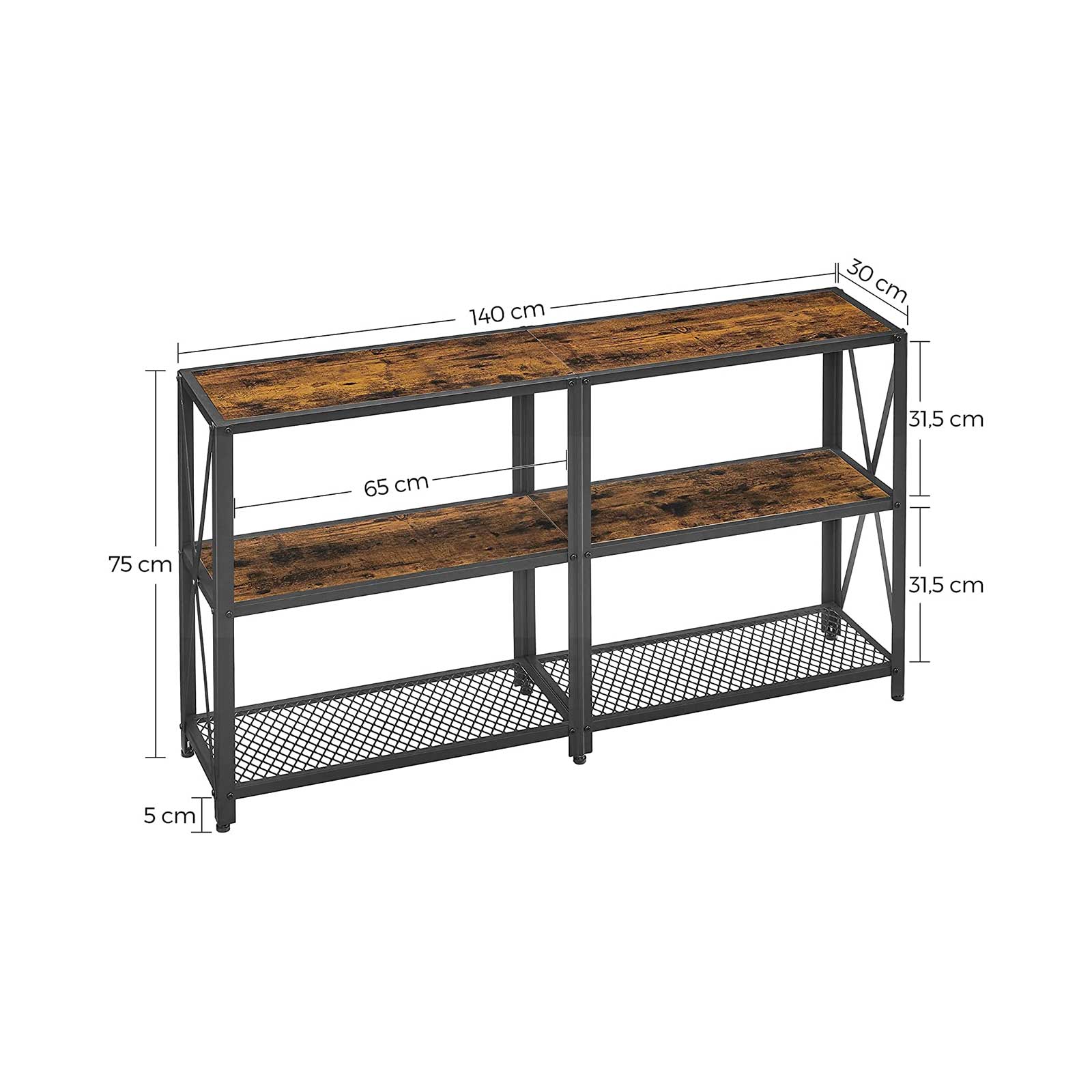 Tuotetiedot: – Väri: vintage-ruskea-musta – Materiaali: lastulevy, teräs – Koko: 140 x 30 x 75 cm (P x L x K) – Paino: 15,5 kg – Lastulevyhyllyn maks. staattinen kantavuus: 80 kg – Ritilähyllyn maks. staattinen kantavuus: 10 kg Toimitus sisältää:- 1 x konsolipöytä – 1 x lisävarustepaketti – 1 x ohjeet VASAGLE-ohjeet: – Turvallisuussyistä lapset eivät saa kiivetä tuotteelle tai leikkiä sillä.