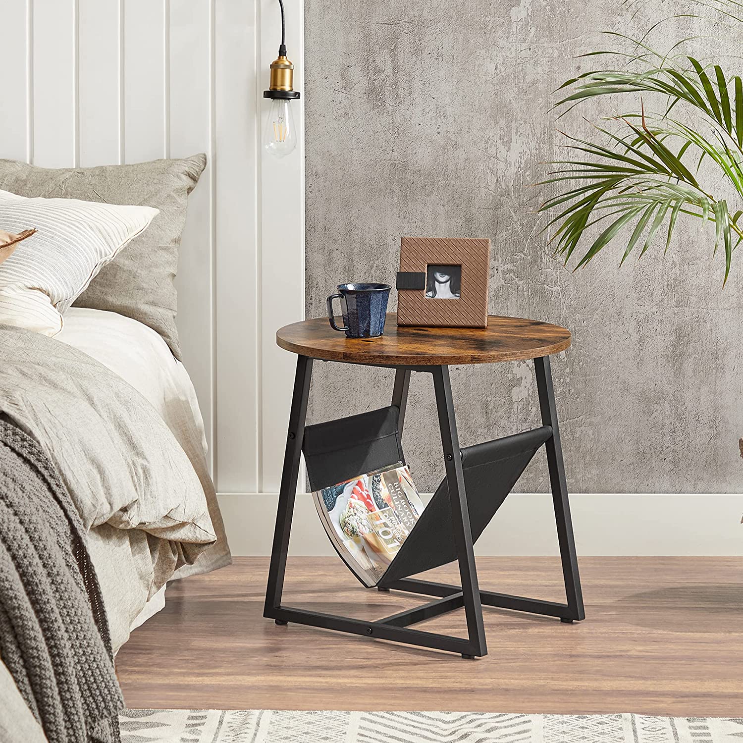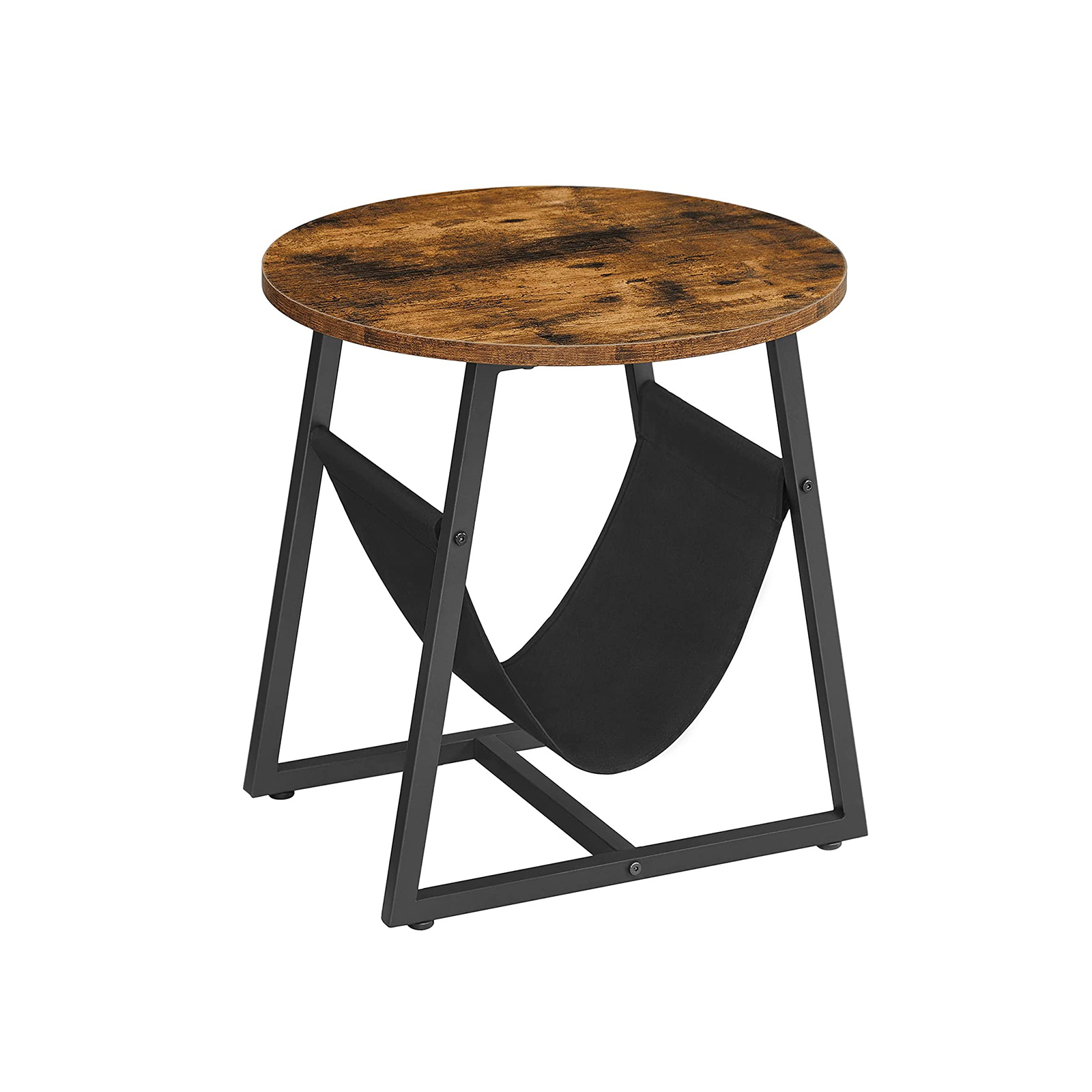 Tuotetiedot: – Väri: vintage-ruskea-musta – Materiaali: lastulevy, teräs – Koko: 50 x 50 cm (Ø x H) – Paino: 4,3 kg – Pöytälevyn suurin staattinen kantavuus: 20 kg Toimitus sisältää: – 1 x sivupöytä – 1 x lisävarustepaketti – 1 x ohjeet VASAGLE Huomautukset:- Turvallisuussyistä lapset eivät saa kiivetä tuotteelle tai leikkiä sillä.