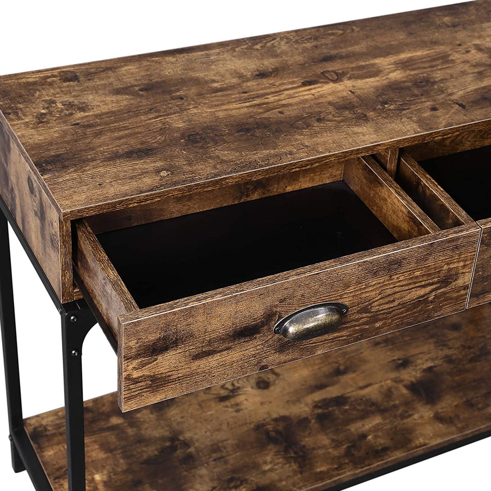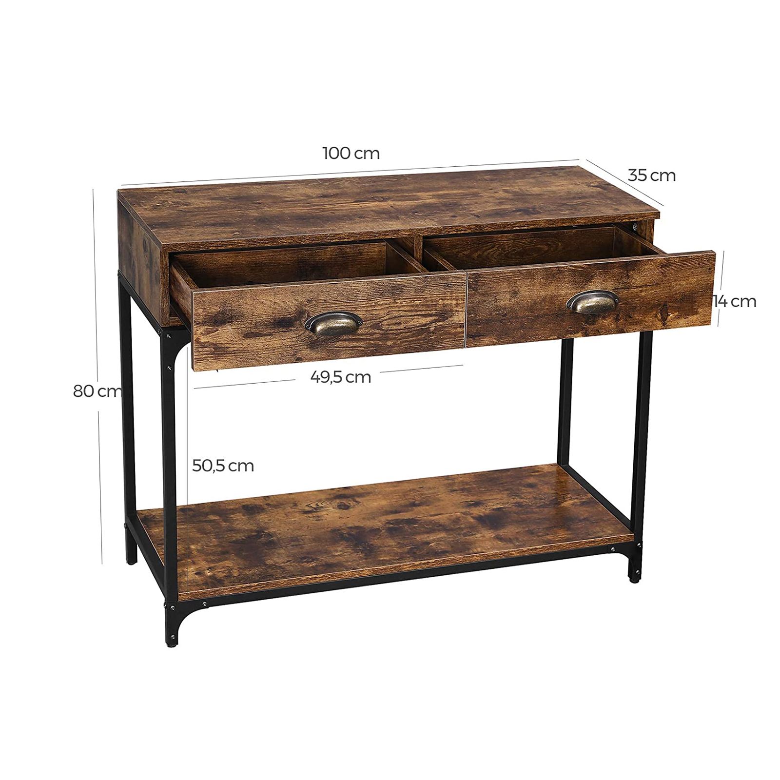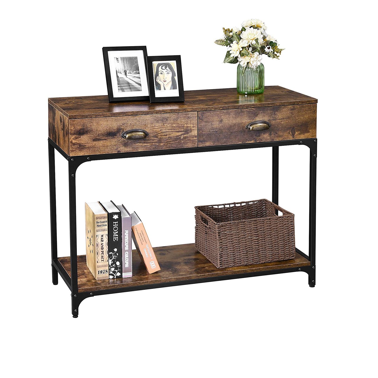 KONSOLIPÖYTÄ Olitpa juuri muuttanut ensimmäiseen omaan asuntoosi tai haluatko elävöittää olohuoneesi modernilla, mutta klassisella tyylillä, tämä VASAGLE:n teollisen muotoilun konsolipöytä tekee kaiken mahdolliseksi.- Tummanruskea vintage-viilu ja musta rautakehys antavat tälle teollisen tyylin eteispöydälle trendikkään ilmeen, joka sopii monenlaisiin sisustustyyleihin. – Kahden laatikon ansiosta pöydän hyllyjen välissä on runsaasti säilytystilaa eteistilallesi (maks. staattinen kantavuus 50 kg).- Rungon sivuilla olevat X-tukipalkit lisäävät huonekalun vakautta. Säädettävien jalkojen ansiosta voit asettaa pöydän epätasaiselle lattialle ja suojata sen naarmuilta. – Mukana toimitetun kaatumissuojan avulla voit kiinnittää konsolin turvallisesti seinään. Tämä on erityisen kätevää perheille, joissa on pieniä lapsia. Tuotetiedot: – Väri: tummanruskea/vintage, musta – Materiaali: lastulevy, rauta, sinkkiseos – Koko per koukku: 100 x 35 x 80 cm (P x L x K) – Paino per koukku: 21,2 kg – Maks. staattinen kantavuus: 50 kg Toimitus sisältää:- 1 x konsolipöytä – 1 x säilytyslaatikko tarvikkeilla – 1 x kaatumissuoja – 1 x ohjeet (DE, EN, FR, ES, IT) VASAGLE-ohjeet: – Älä altista tuotetta pitkään voimakkaalle auringonvalolle tai kostealle ympäristölle.