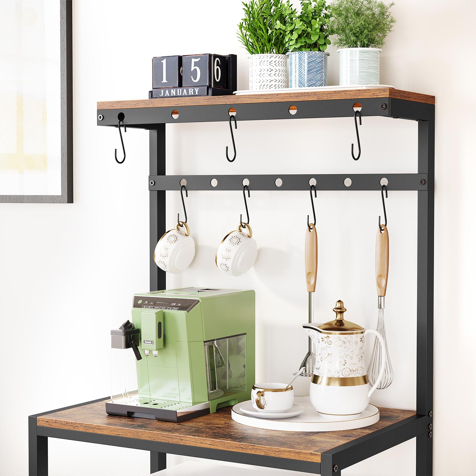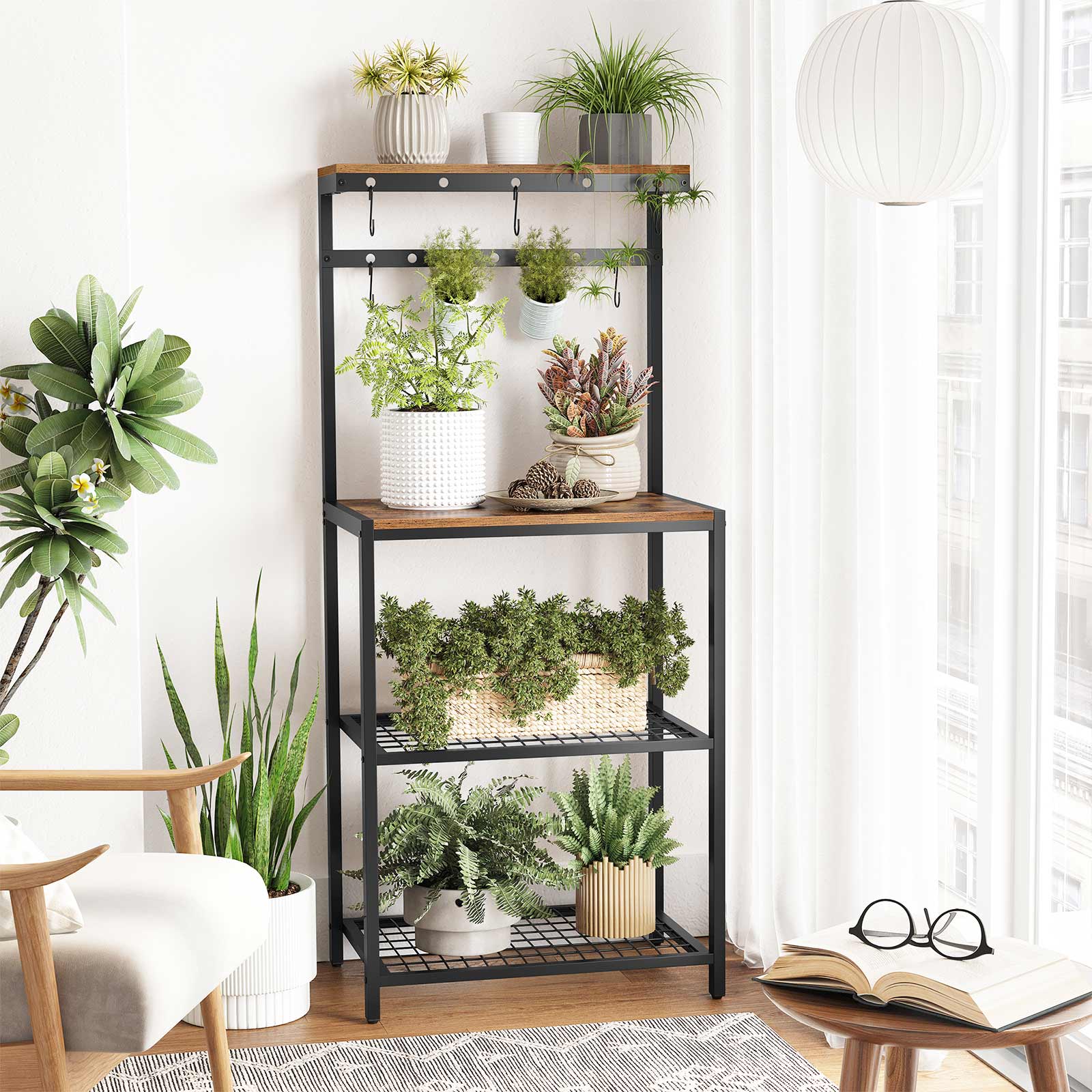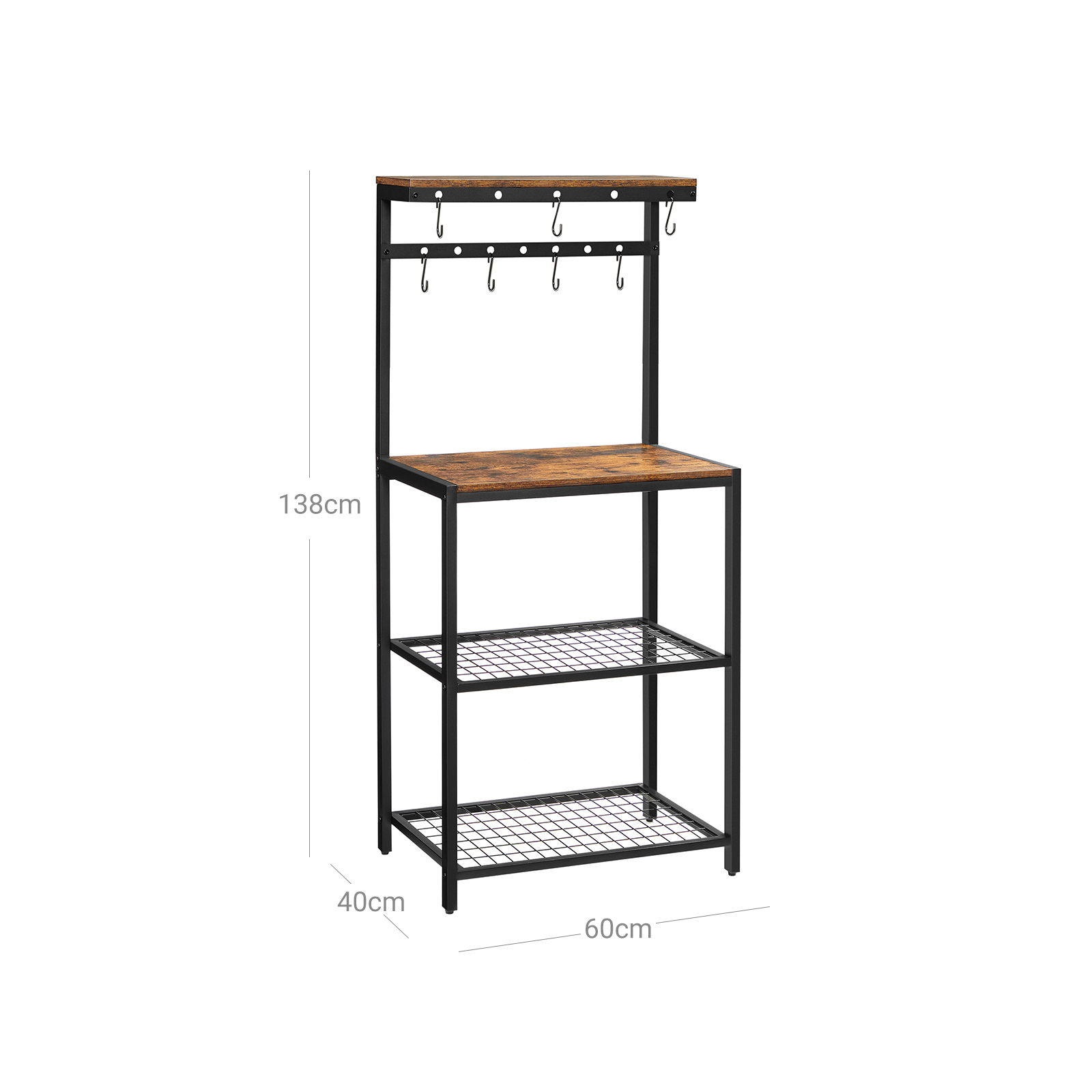 Tuotetiedot: – Väri: vintage-ruskea-musta – Materiaali: lastulevy, teräs – Koko: 60 x 40 x 138 cm (P x L x K) – Paino: 9,9 kg – Maks. staattinen kantavuus:- Ylin hyllytaso: 15 kg – Pöytäpinta: 25 kg – Kukin ritilähylly: 10 kg Toimitussisältö: – 1 x keittiöhylly – 7 x S-muotoista koukkua – 1 x kaatumissuoja – 1 x lisävarustepaketti – 1 x ohjeet (DE, EN, IT, FR, ES) VASAGLE Huomautukset:- Turvallisuussyistä lapset eivät saa kiivetä tuotteelle tai leikkiä sillä. – Kiinnitä tämä tuote seinään mukana toimitetulla kaatumissuojalla turvallisen käytön varmistamiseksi. – Hygieniasyistä älä aseta elintarvikkeita suoraan metallihyllyille. – Tarkista huolellisesti, että hyllyn koko sopii mikroaaltouunillesi tai muille keittiökoneillesi.