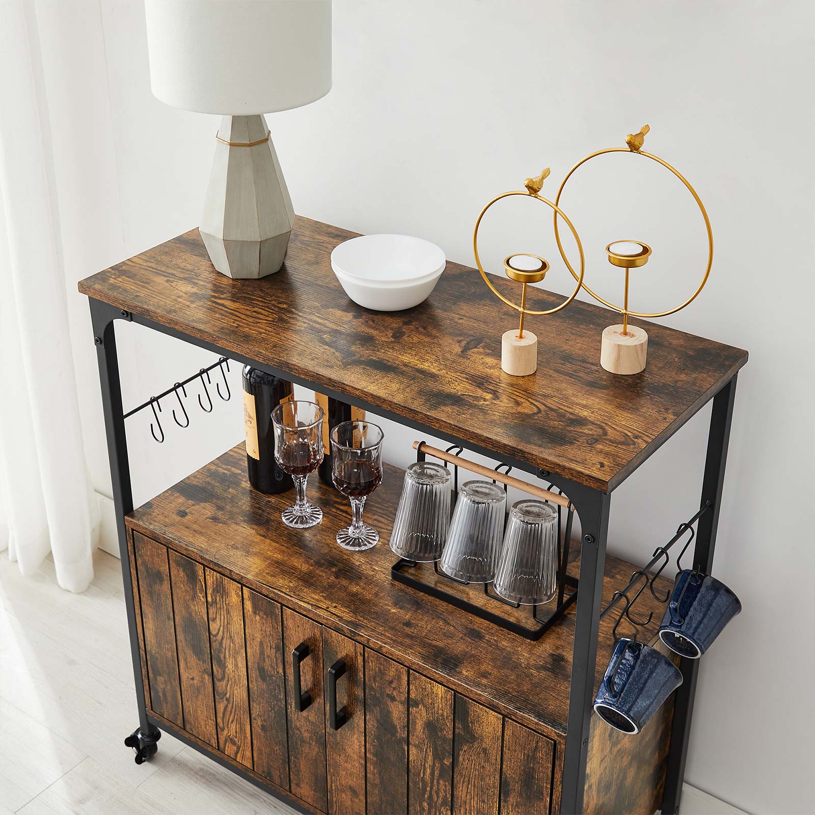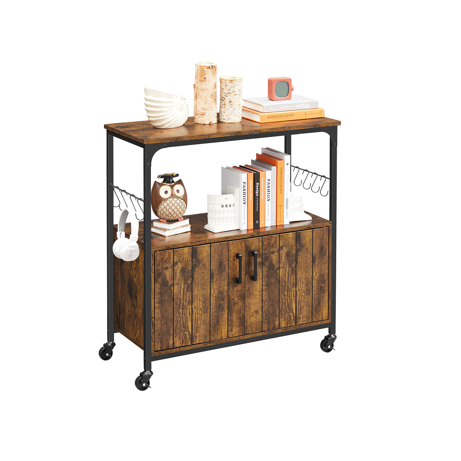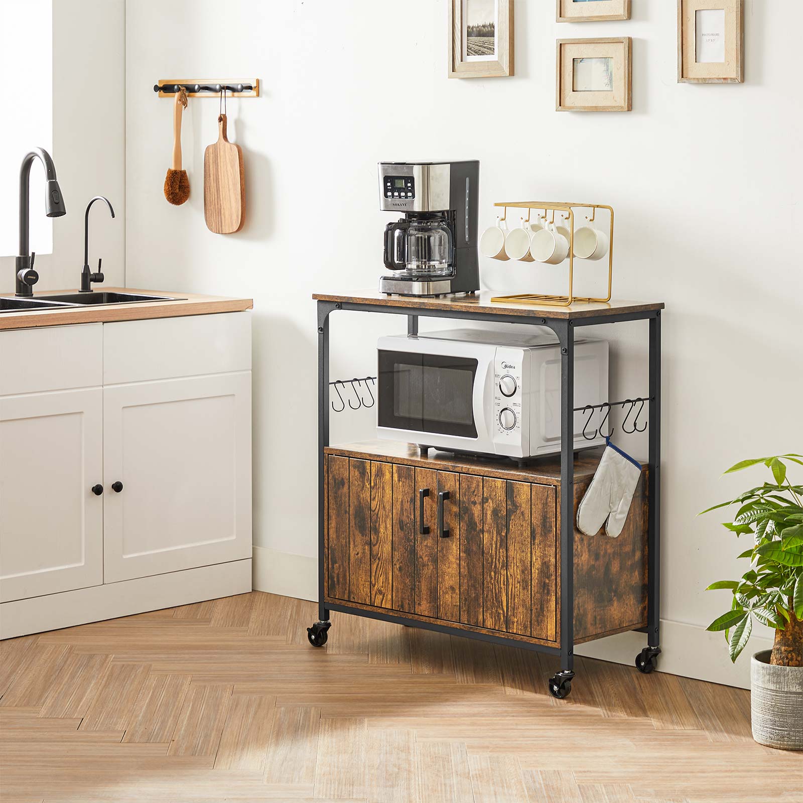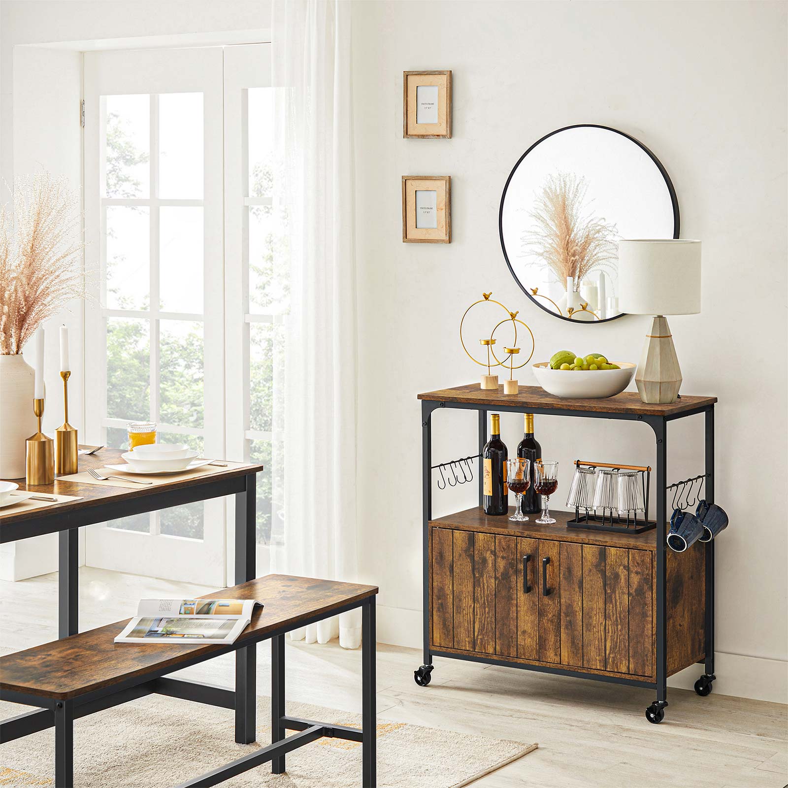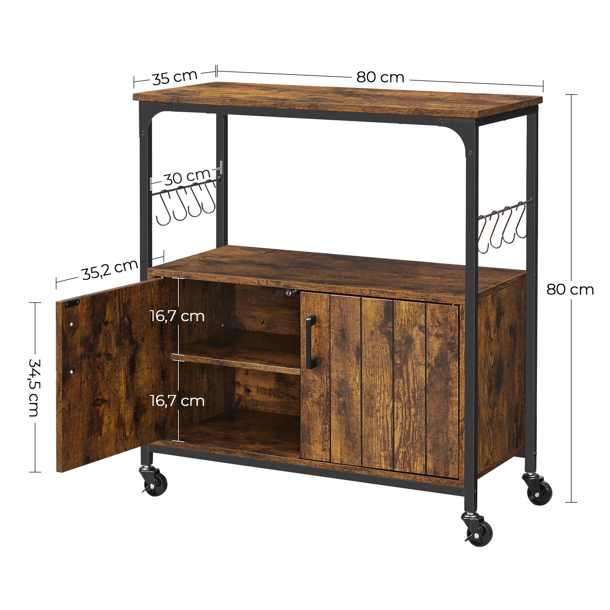 Tuotetiedot: – Väri: vintage-ruskea-musta – Materiaali: lastulevy, teräs – Koko: 80 x 35 x 80 cm (P x L x K) – Paino: 19,5 kg – Ylimmän hyllyn maks. staattinen kantavuus: 30 kg – Kaapin ovien takana olevan hyllytason maks. staattinen kantavuus: 10 kg Toimitus sisältää: – 1 x keittiökärry – 1 x lisävarustepaketti – 1 x kaatumissuoja – 1 x ohjeet VASAGLE Huomautukset:- Turvallisuussyistä lapset eivät saa kiivetä tuotteen päälle tai leikkiä sillä. – Kiinnitä tämä tuote seinään mukana toimitetulla kaatumissuojalla turvallisen käytön varmistamiseksi.
