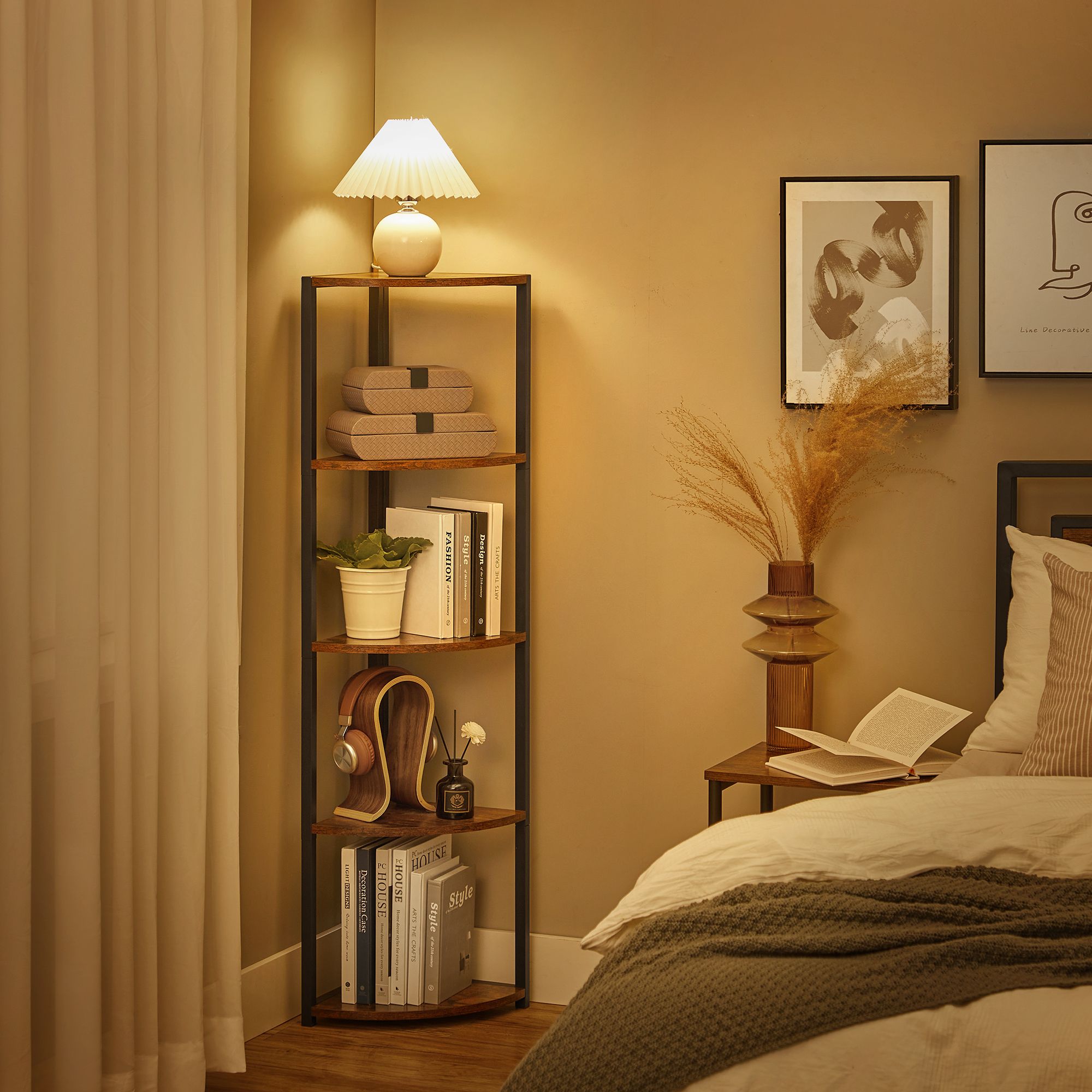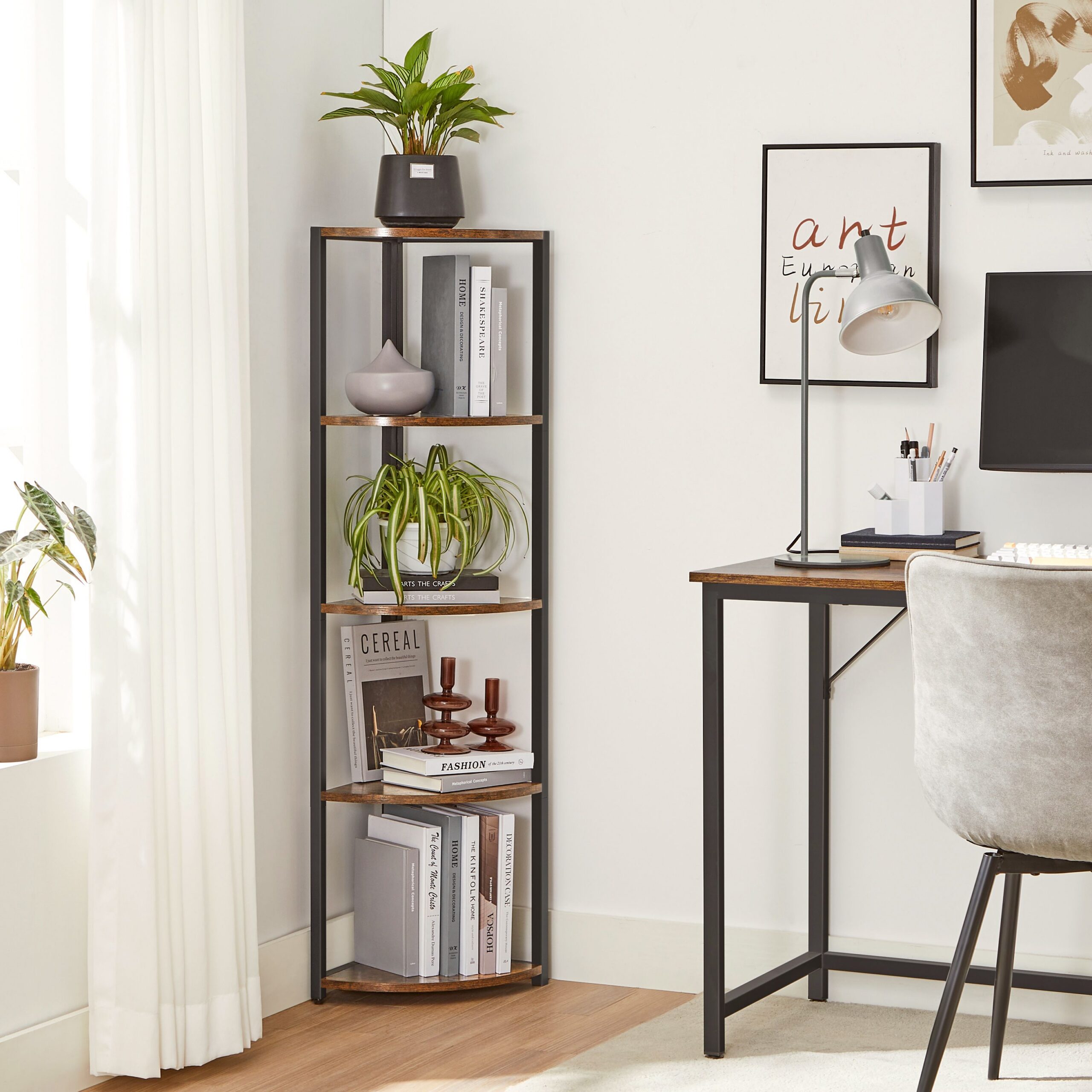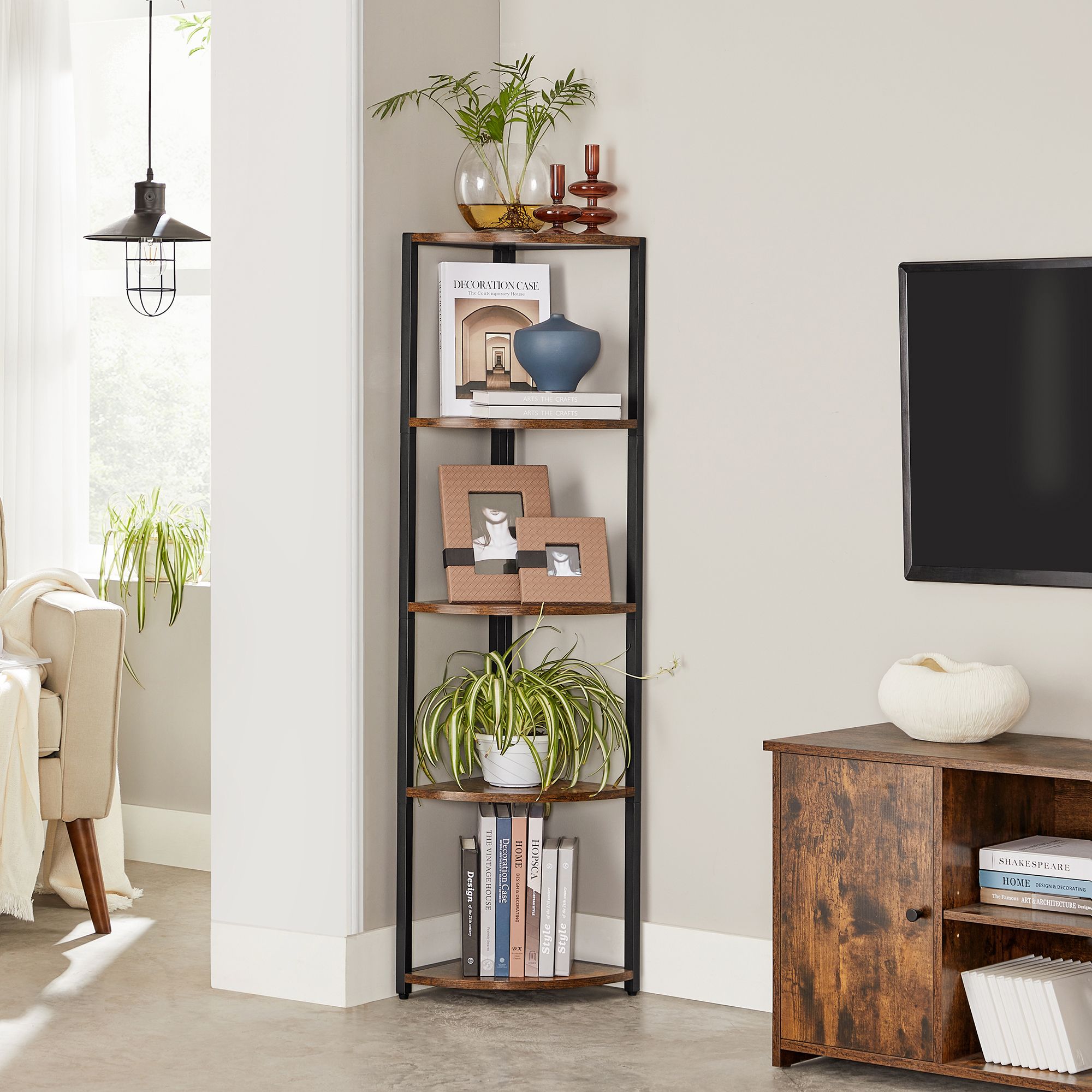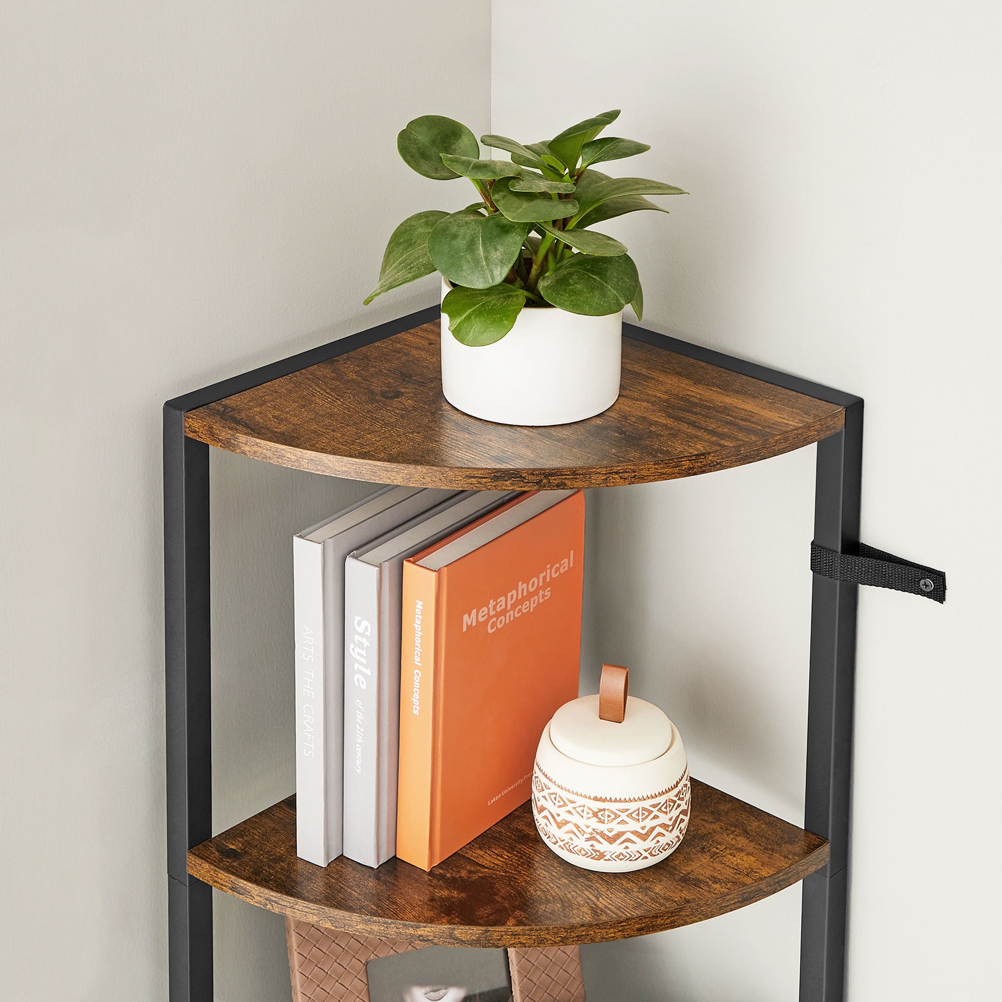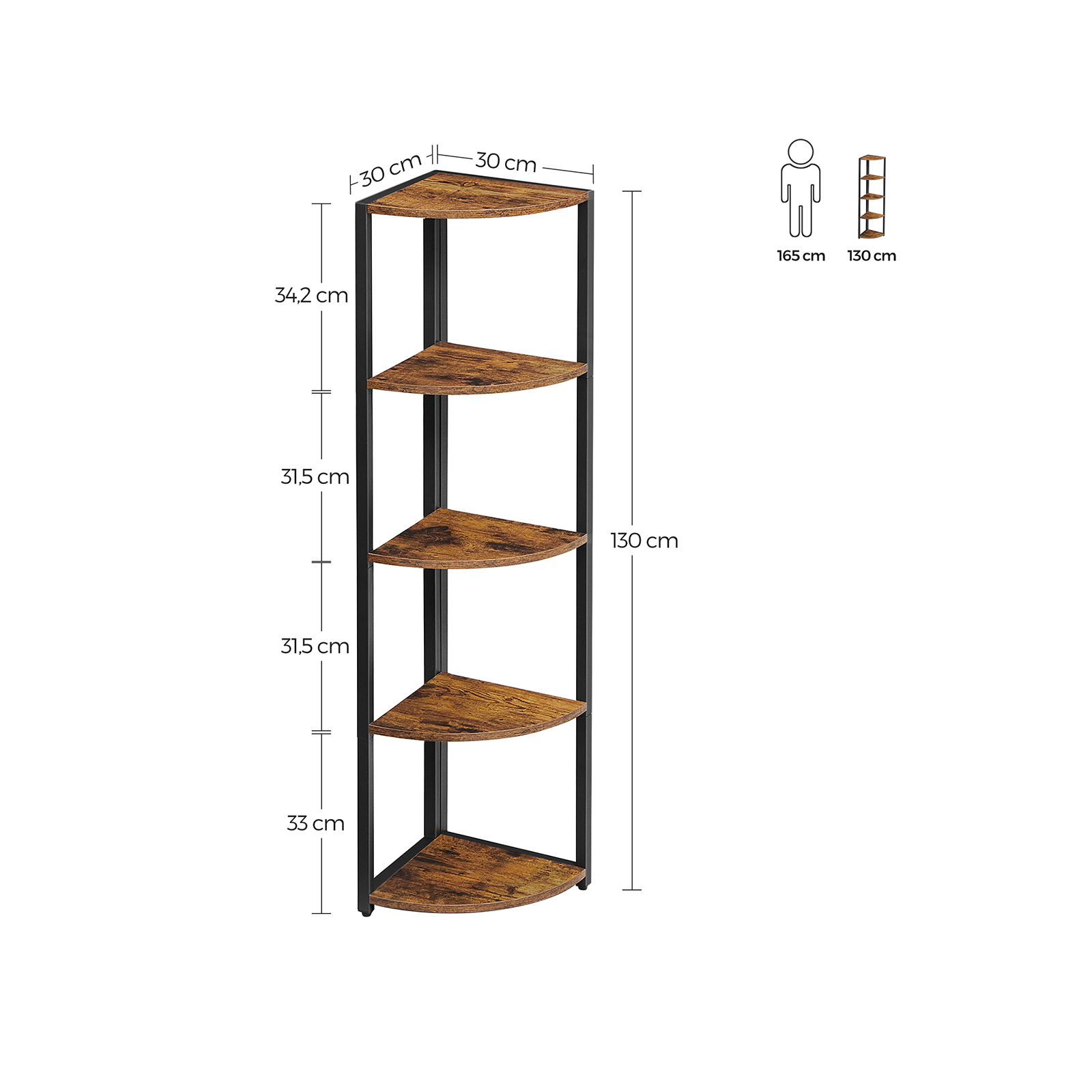 Tuotetiedot: – Väri: vintage-ruskea-musta – Materiaali: lastulevy, teräs – Koko: 30 x 30 x 129,5 cm (P x L x K) – Paino: 6 kg – Maks. staattinen kantavuus hyllytasoa kohti: 5 kg Toimitus sisältää:- 1 x kulmahylly – 1 x lisävarustepaketti – 2 x kaatumissuoja – 1 x ohjeet VASAGLE Huomautukset: – Kiinnitä tämä tuote seinään mukana toimitetulla kaatumissuojalla. – Turvallisuussyistä lapset eivät saa kiivetä tuotteelle tai leikkiä sillä.