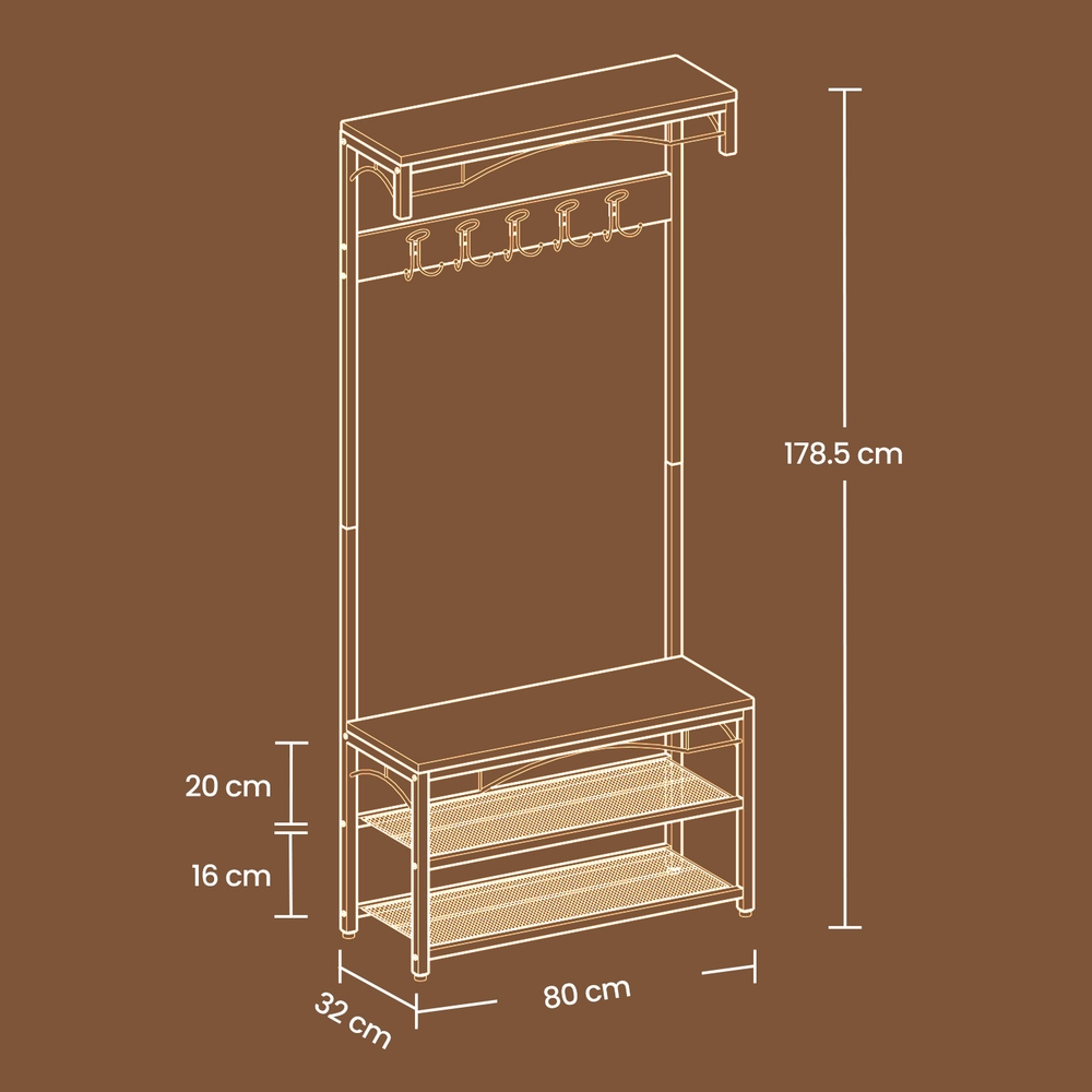 Kiireisenä työpäivän aamuna käytännöllinen eteisen vaatekaappi voi olla erittäin hyödyllinen. Säästääksesi rahaa ja tilaa, VASAGLE tarjoaa tämän uuden vaatekaapin, jossa yhdistyvät täydellisesti vaatekoukut, penkki ja kenkätelineet. Vaatekoukut – 5 tukevaan koukkuun voit ripustaa takit, avaimet, hatut, huivit jne. siististi ja kätevästi saataville. Penkki – Vintage-tyylinen puukuitupaneelista valmistettu hylly tarjoaa istumapaikan, kun laitat kenkiä jalkaan tai otat ne pois, ja se on myös ihanteellinen käsilaukkujen ja säilytyslaatikoiden säilyttämiseen, joten eteinen pysyy aina siistinä. Kenkätelineet – Metalliset telineet alaosassa pitävät jokapäiväiset kenkäsi yhdessä paikassa, joten sinun ei tarvitse joka päivä etsiä sopivia kenkiä. Hanki tämä viehättävä rustiikkityylinen vaateteline kotiisi ja vastaanota vieraasi siistissä eteisessä! Tuotetiedot: – Väri: musta, tummanruskea (vintage) – Materiaali: jauhemaalatut metalliputket, E1-lastulevy – Mitat: 80 x 178,5 x 30 cm (L x K x S) – Hyllyn mitat: 80 x 30 cm – Paino: 14,1 kg – Kunkin koukun kantavuus: 3 kg – Puuhyllyn kantavuus: 100 kg Toimitus sisältää: – 1 x vaatehylly – 1 x ohjeet (DE, EN, ES, FR, IT) VASAGLE Huomautukset: – Turvallisuuden takaamiseksi käytä kaatumissuojaa. – Ylintä hyllyä ei saa käyttää raskaiden esineiden säilytykseen. Älä myöskään kiipeä hyllylle.