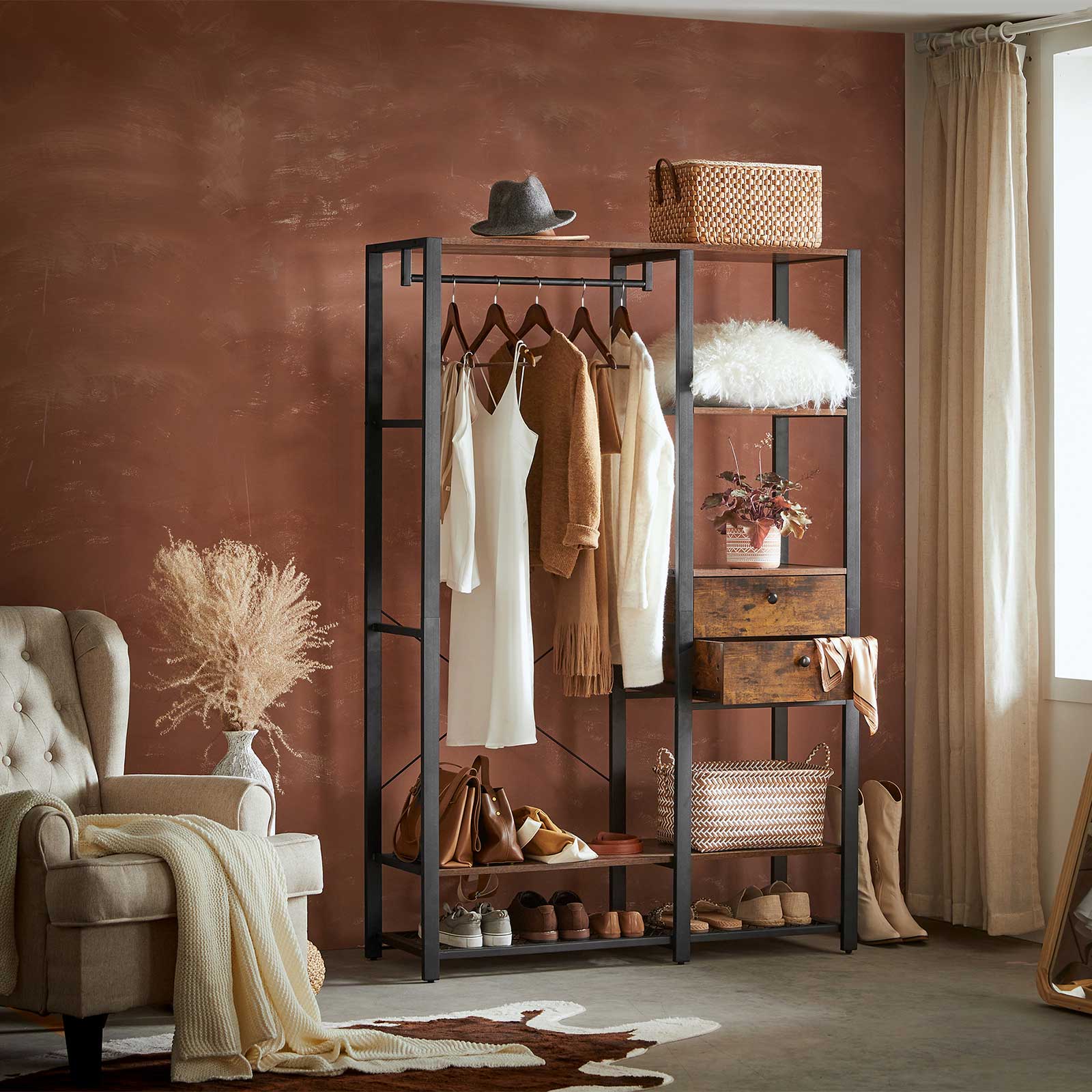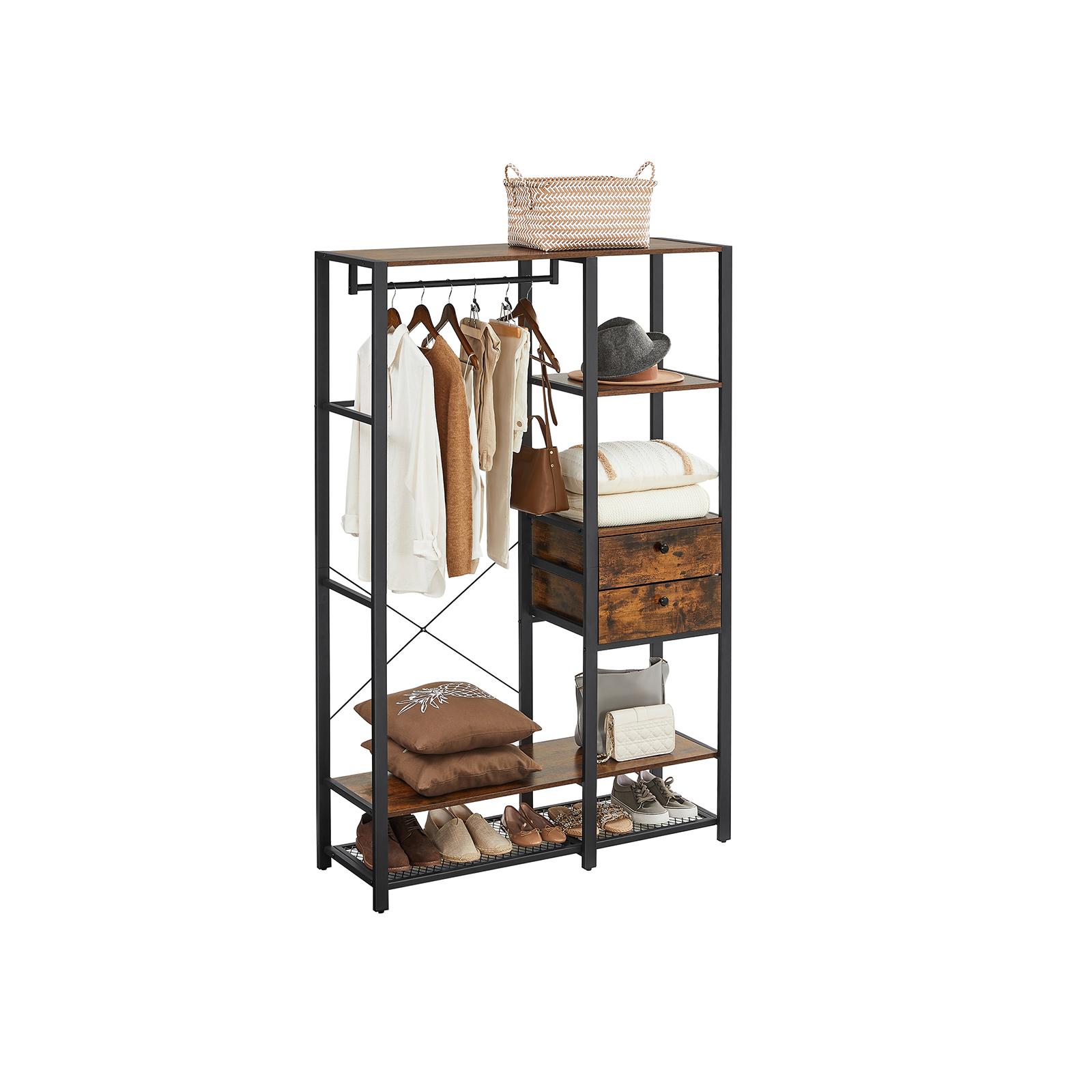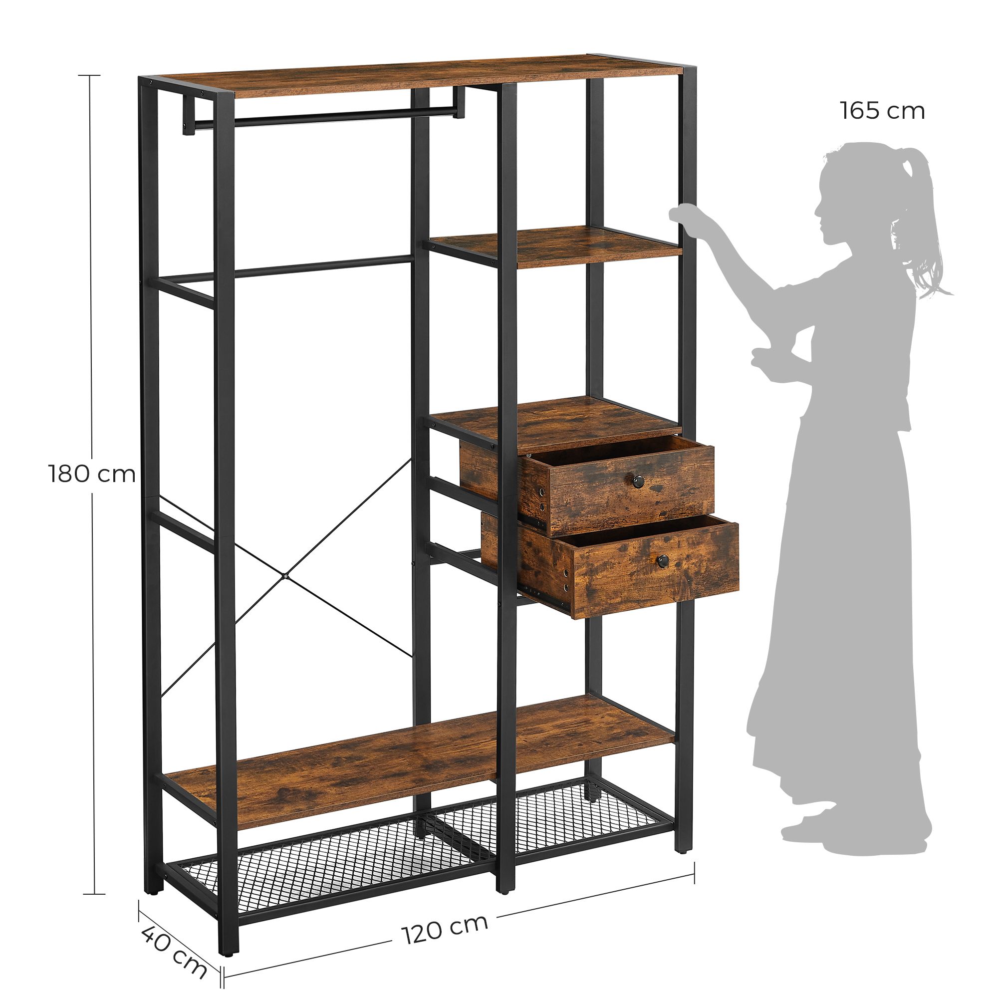 Tuotetiedot: – Väri: vintage-ruskea-musta – Materiaali: lastulevy, teräs – Koko: 120 x 40 x 180 cm (P x L x K) – Paino: 34 kg – Maks. staattinen kokonaiskuormitus: 115 kg – Maks. staattinen kuormitus ylähyllyllä: 15 kg – Oikean yläosan hyllyn maks. staattinen kantavuus: 15 kg – Tangon maks. staattinen kantavuus: 30 kg – Laatikon pinnan maks. staattinen kantavuus: 15 kg – Alahyllyn maks. staattinen kantavuus: 20 kg – Ritilähyllyn maks. staattinen kantavuus: 20 kg Toimitus sisältää:- 1 x vaatekaappi – 1 x lisävarustepaketti – 1 x kaatumissuoja – 1 x ohjeet VASAGLE Huomautukset: – Turvallisuussyistä lapset eivät saa kiivetä tuotteen päälle tai leikkiä sillä. – Kiinnitä tämä tuote seinään mukana toimitetulla kaatumissuojalla kaatumisen estämiseksi.