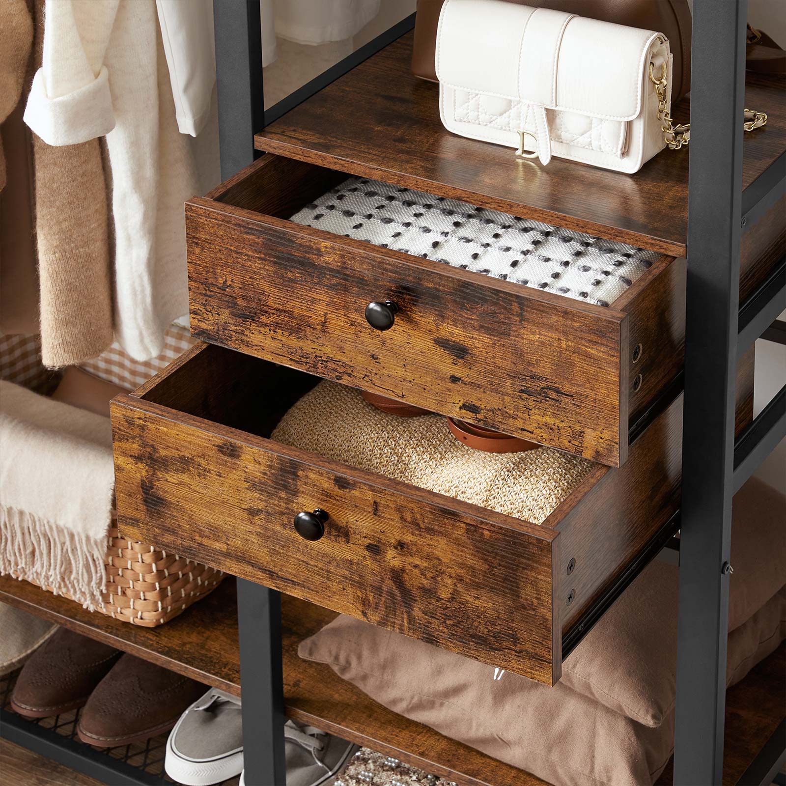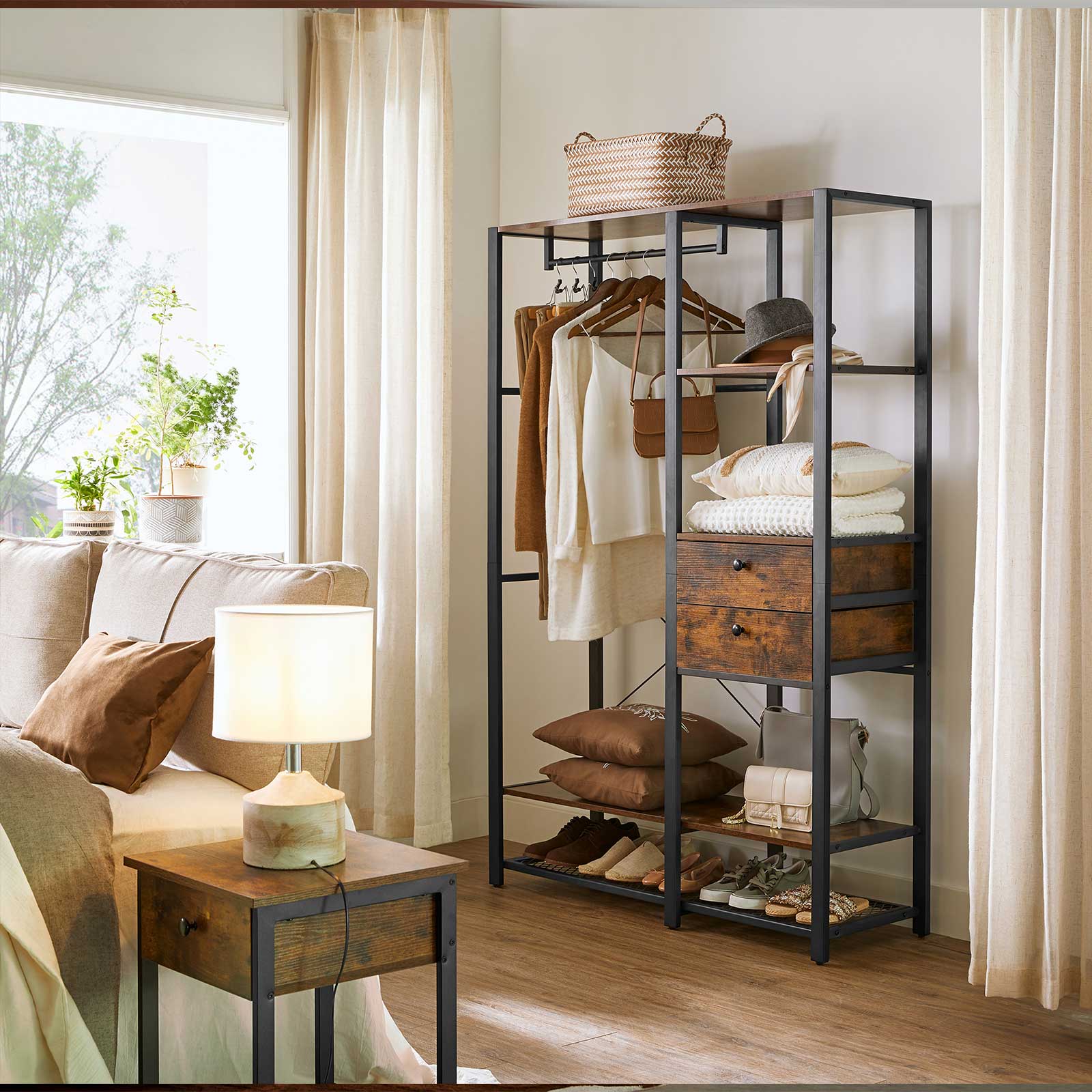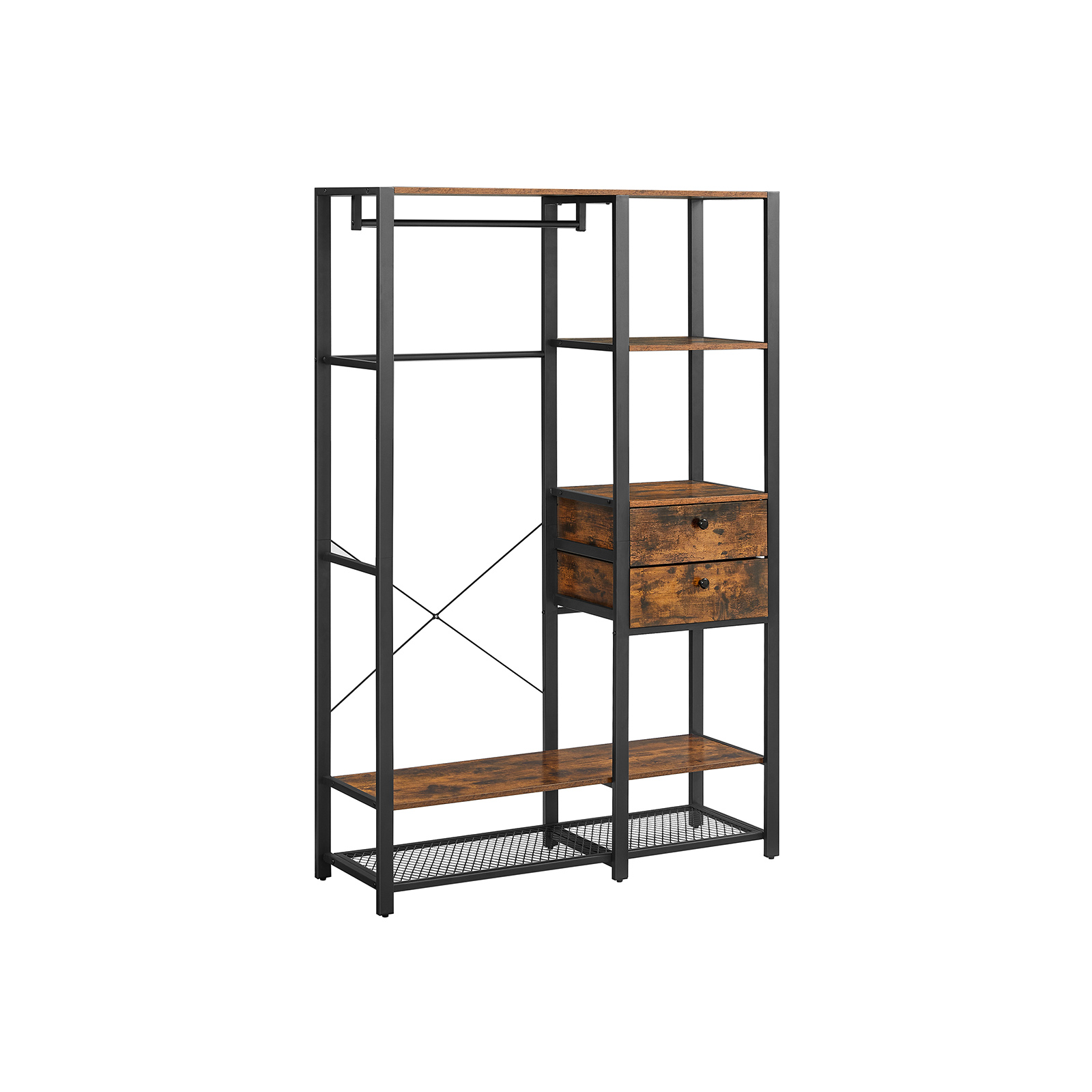 Tuotetiedot: – Väri: vintage-ruskea-musta – Materiaali: lastulevy, teräs – Koko: 120 x 40 x 180 cm (P x L x K) – Paino: 34 kg – Maks. staattinen kokonaiskuormitus: 115 kg – Maks. staattinen kuormitus ylähyllyllä: 15 kg – Oikean yläosan hyllyn maks. staattinen kantavuus: 15 kg – Tangon maks. staattinen kantavuus: 30 kg – Laatikon pinnan maks. staattinen kantavuus: 15 kg – Alahyllyn maks. staattinen kantavuus: 20 kg – Ritilähyllyn maks. staattinen kantavuus: 20 kg Toimitus sisältää:- 1 x vaatekaappi – 1 x lisävarustepaketti – 1 x kaatumissuoja – 1 x ohjeet VASAGLE Huomautukset: – Turvallisuussyistä lapset eivät saa kiivetä tuotteen päälle tai leikkiä sillä. – Kiinnitä tämä tuote seinään mukana toimitetulla kaatumissuojalla kaatumisen estämiseksi.