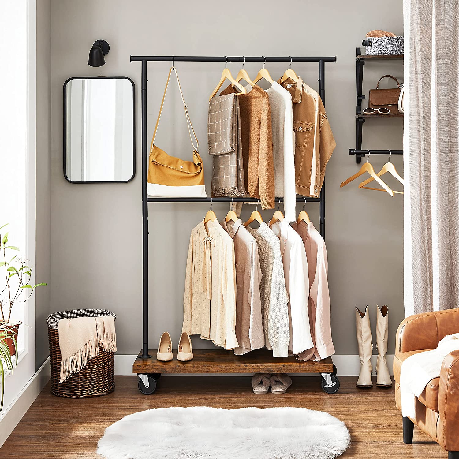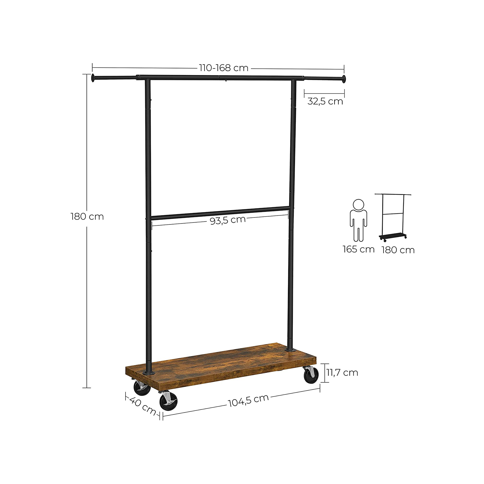 Tuotetiedot: – Väri: vintage-ruskea-musta – Materiaali: lastulevy, teräs – Koko: (110-168) x 40 x 180 cm (P x L x K) – Paino: 11,2 kg – Yläosan keskitangon maks. staattinen kantavuus: 50 kg – Sivutangon maks. staattinen kantavuus: 9 kg – Alatangon maks. staattinen kantavuus: 45,5 kg – Hyllyn maks. staattinen kantavuus: 25 kg Toimitus sisältää:- 1 x vaateteline – 1 x lisävarustepaketti – 1 x ohjeet