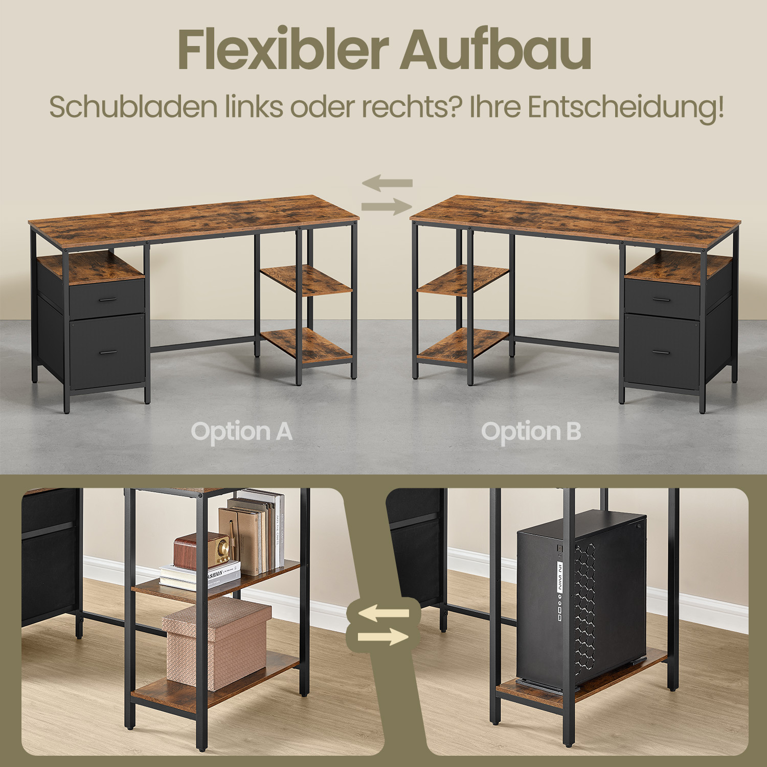 VASAGLE Kirjoituspöytä, tietokonepöytä, PC-pöytä, toimistopöytä, 2 hyllyllä oikealla tai vasemmalla puolella, toimistoon, olohuoneeseen, teräsrunko, teollinen muotoilu, musta LWD047B16