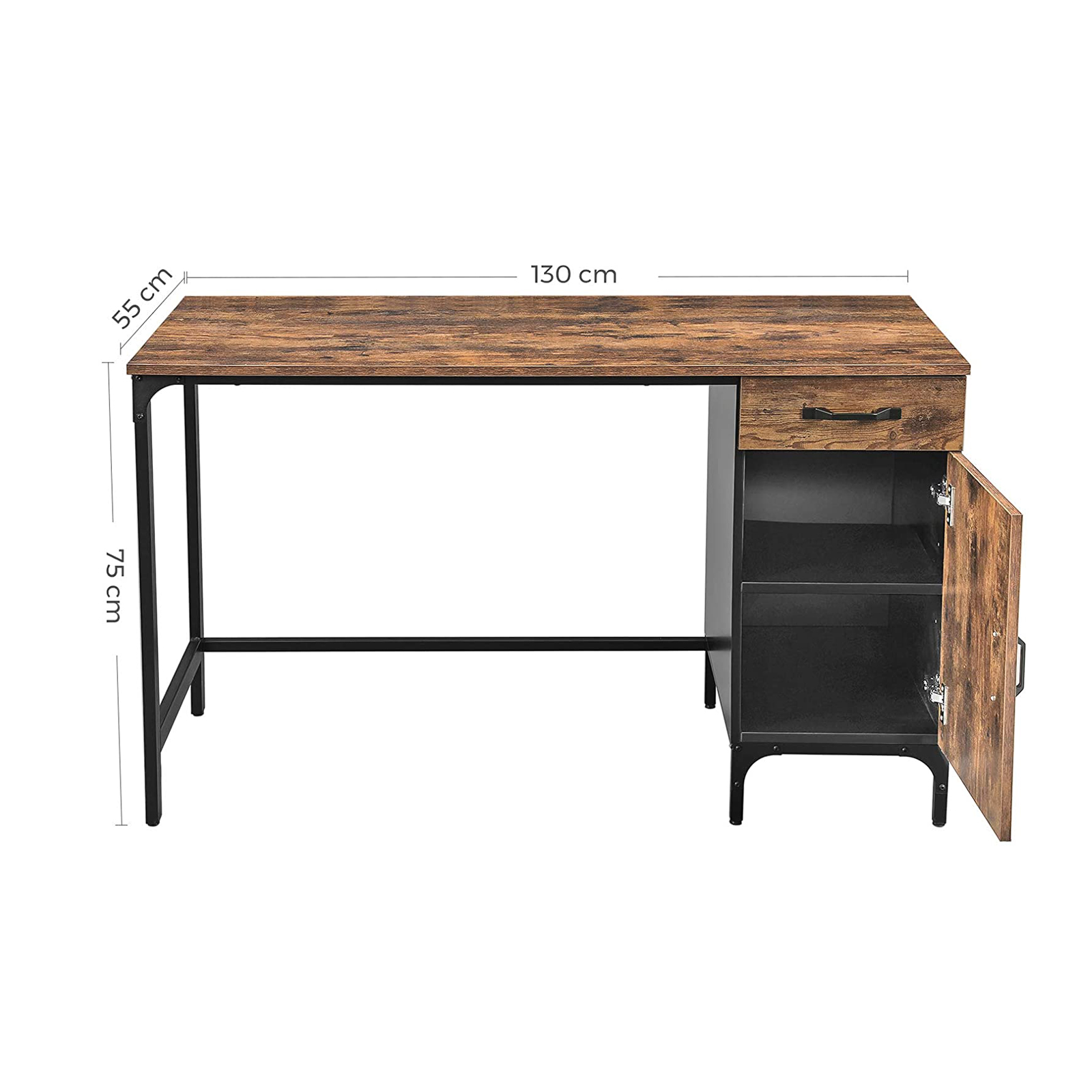 Tuotetiedot: Väri: vintage/tummanruskea – Materiaali: lastulevy, rauta – Koko: 130 x 55 x 75 cm (P x L x K) – Paino: 30 kg – Maks. staattinen kantavuus: 50 kg Toimitus sisältää:- 1 x työpöytä kaapilla ja laatikolla – 1 x lisävarustepaketti – 1 x ohjeet (DE, EN, ES, FR, IT) VASAGLE Huomautukset: – Turvallisuussyistä lapset eivät saa kiivetä tuotteelle tai leikkiä sillä.