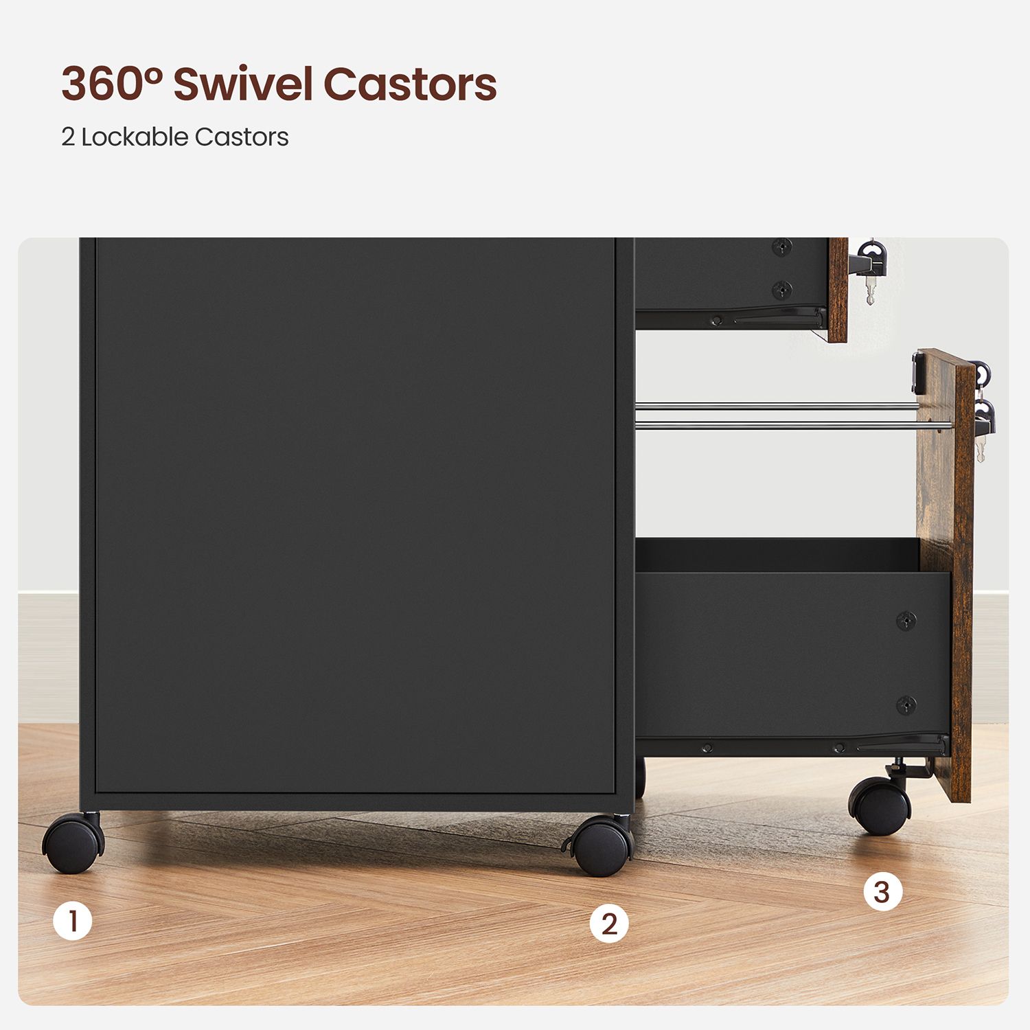 VASAGLE lukittava rullakontti, arkistokaappi, toimistokaappi laatikoilla, universaalirullat, DIN A4- ja Letter-kokoiset asiakirjat, avoin lokero, teräsrunko, greige-musta OFC077B02