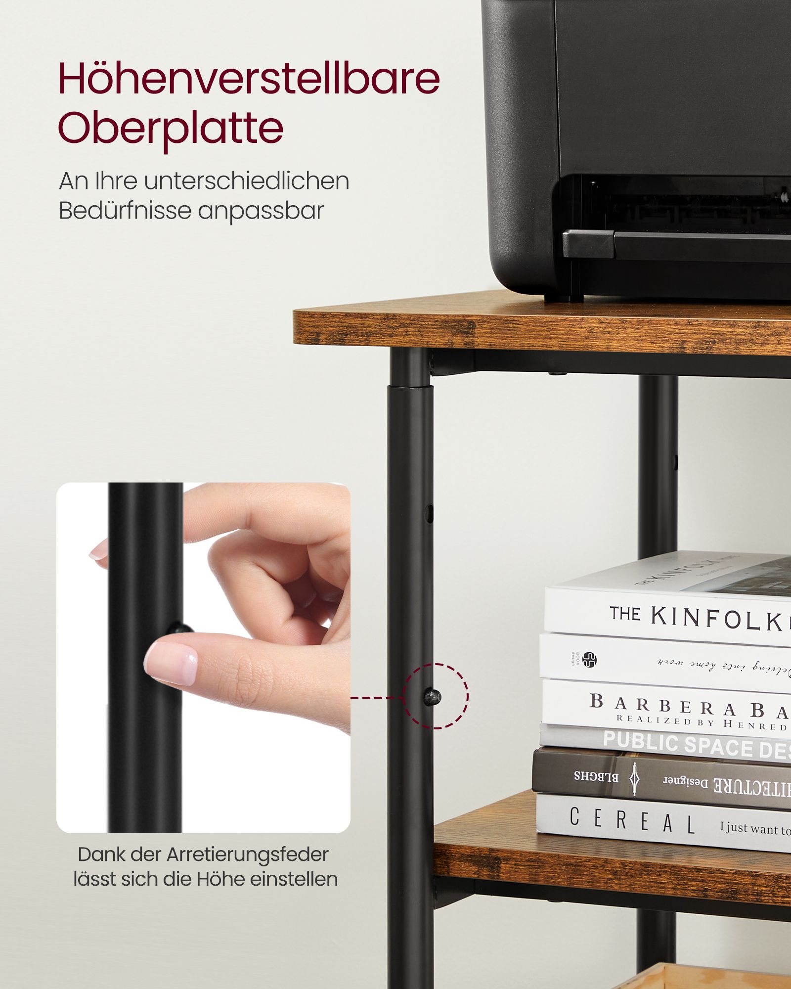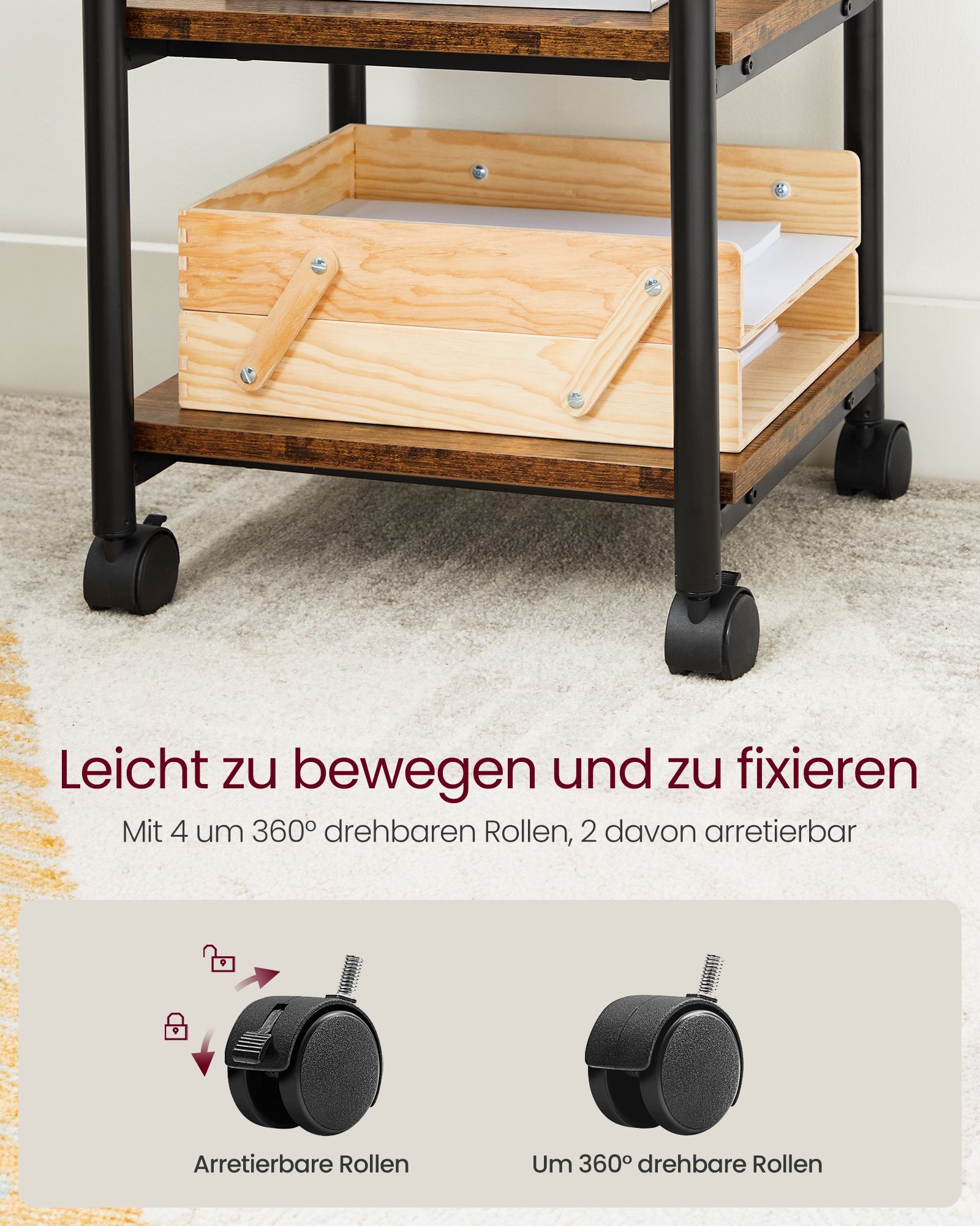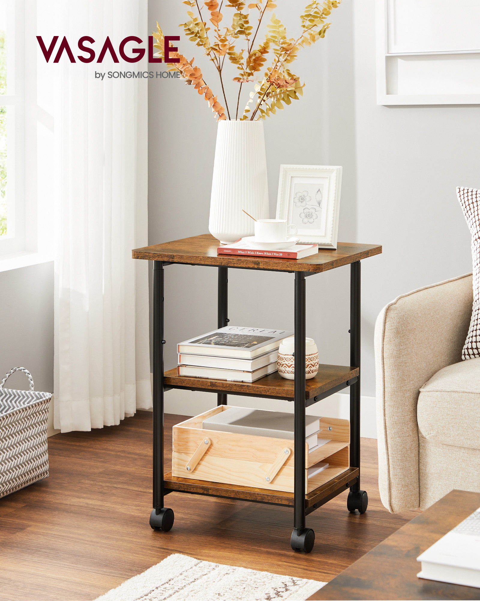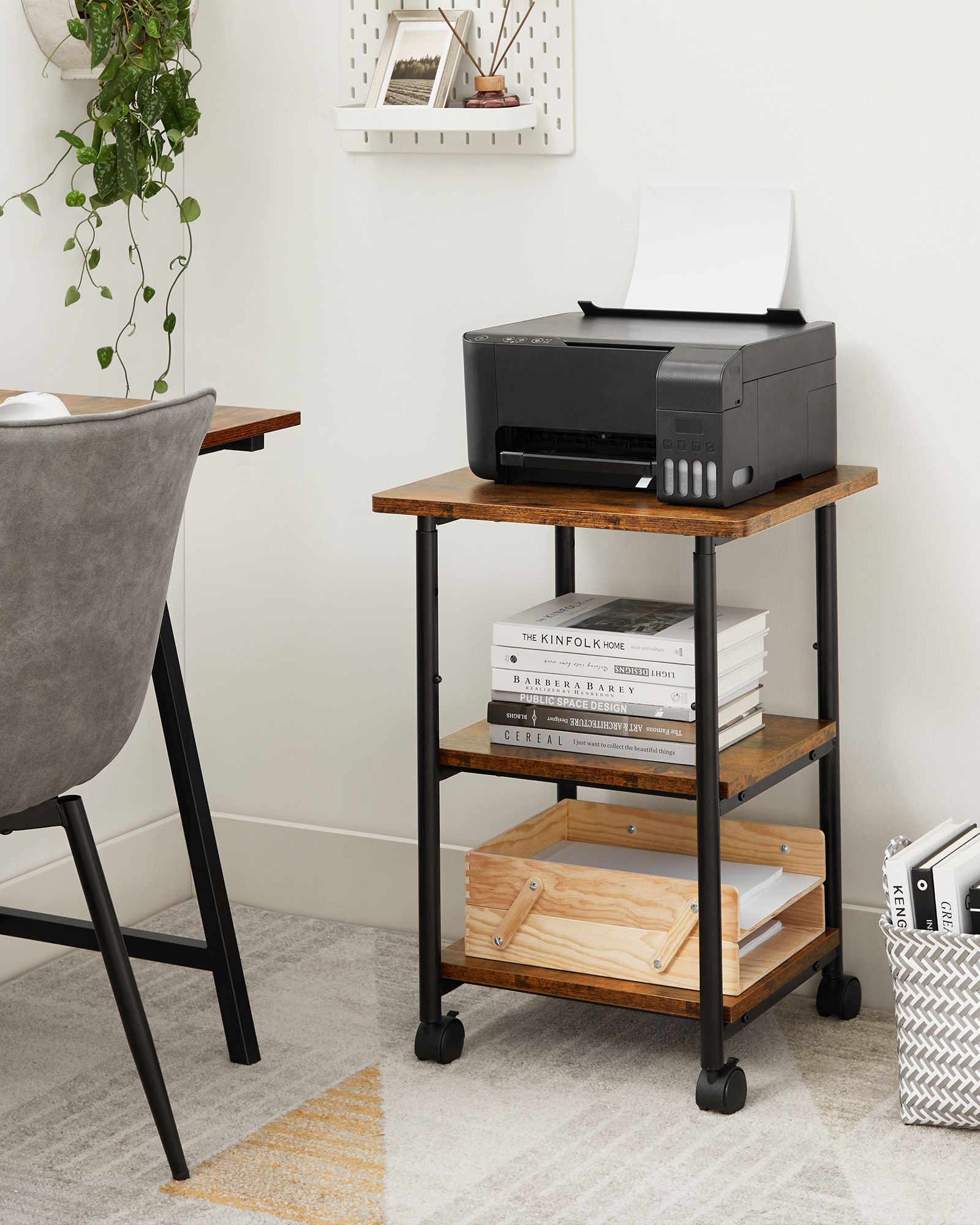 VASAGLE tulostuspöytä pyörillä, 3-tasoinen tulostinteline, säädettävä pöytälevy, kestävä, säilytyshylly, teollinen, toimistoon tai työhuoneeseen, vintage-ruskea-musta OPS003B01V1