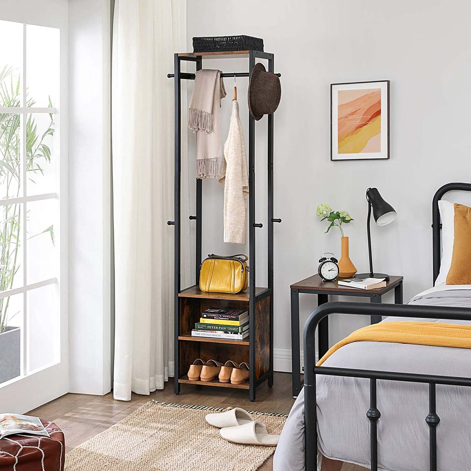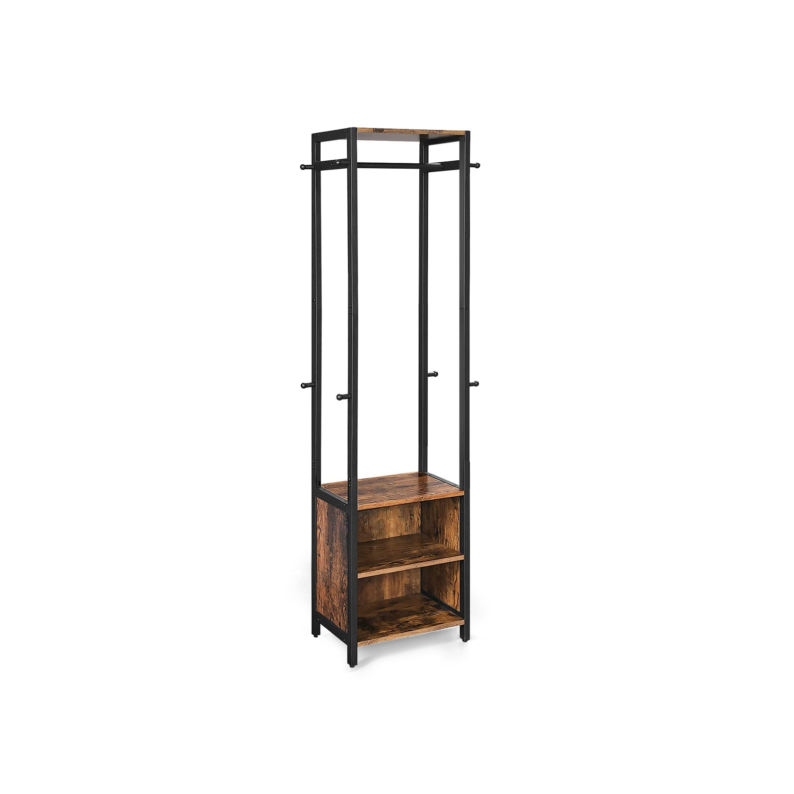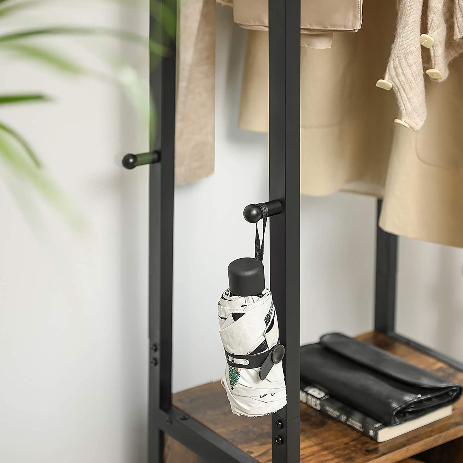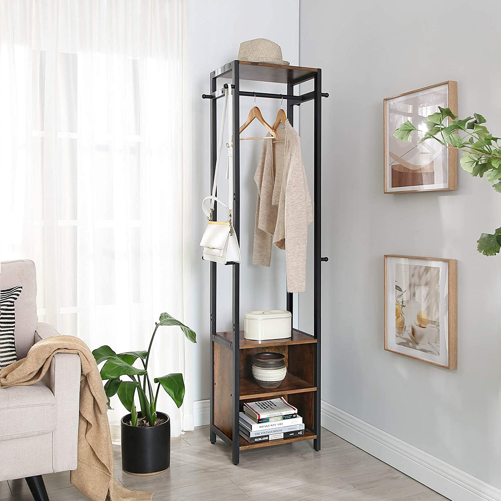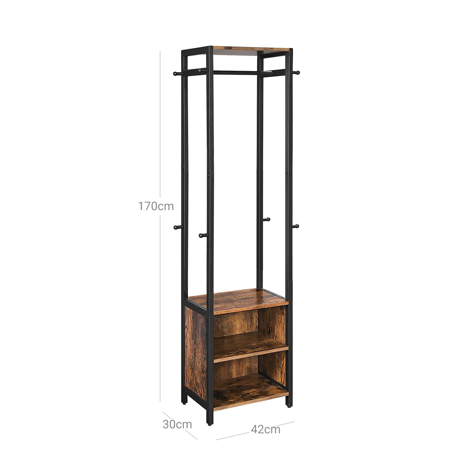 Tuotetiedot: – Väri: vintage-ruskea-musta – Materiaali: lastulevy, teräs – Koko: 42 x 30 x 170 cm (P x L x K) – Paino: 13,3 kg – Hyllyjen maks. staattinen kantavuus: 5 kg – Vaatekoukkujen maks. staattinen kantavuus: 3 kg – Vaatetangon maks. staattinen kantavuus: 5 kgToimitus sisältää:- 1 x vaatekaappi – 1 x lisävarustepaketti – 1 x kaatumissuoja – 1 x ohjeet (DE, EN, ES, FR, IT) VASAGLE Huomautukset: – Turvallisuussyistä lapset eivät saa kiivetä tuotteelle tai leikkiä sillä. – Kiinnitä tämä tuote seinään mukana toimitetulla kaatumissuojalla.