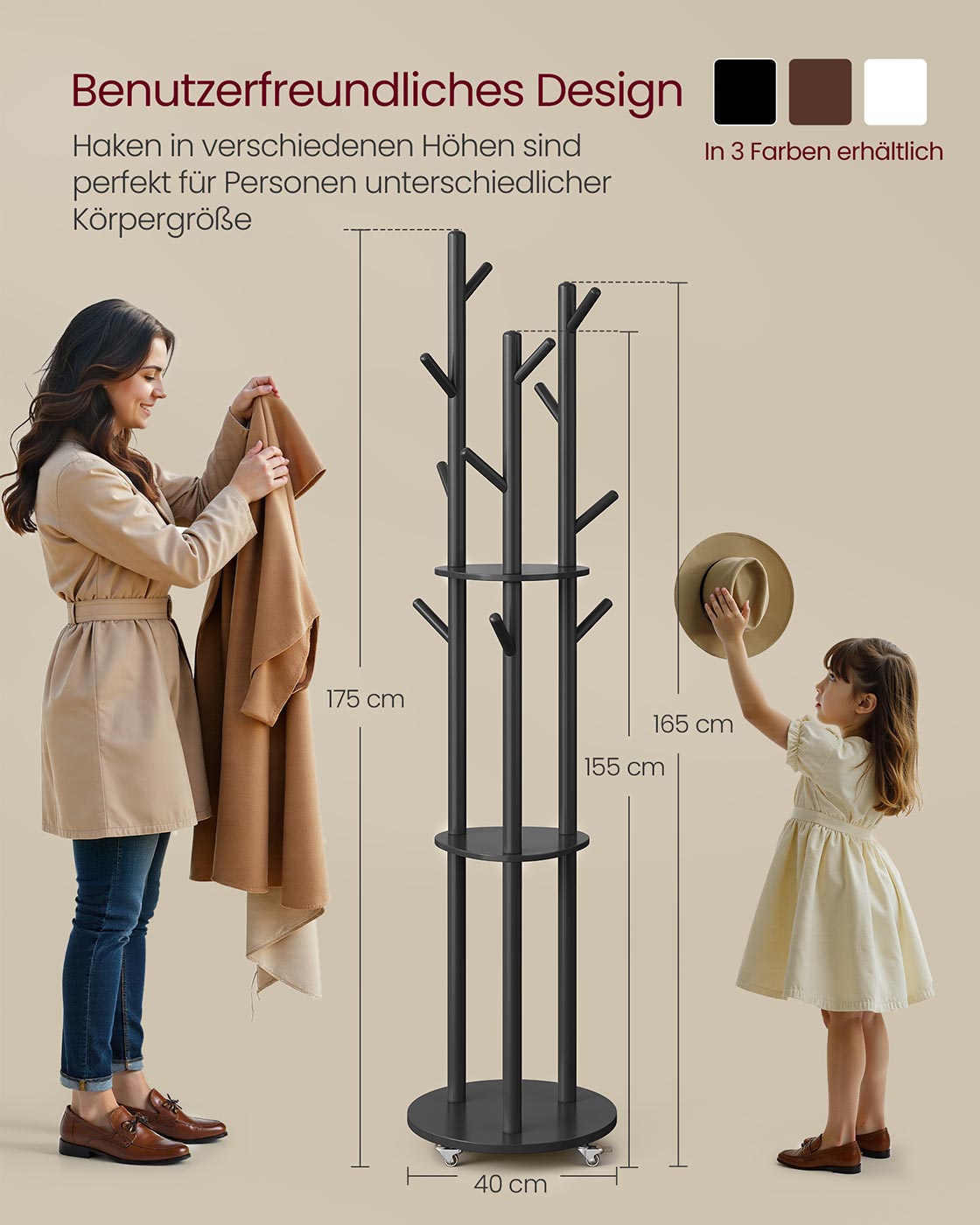 VASAGLE vaateripustin, vaateripustin 11 koukulla ja 3 hyllyllä, 4 kääntyvää ja irrotettavaa pyörää, koukut ja tukitangot massiivipuusta, eteinen makuuhuone olohuone, musta RCR023B01