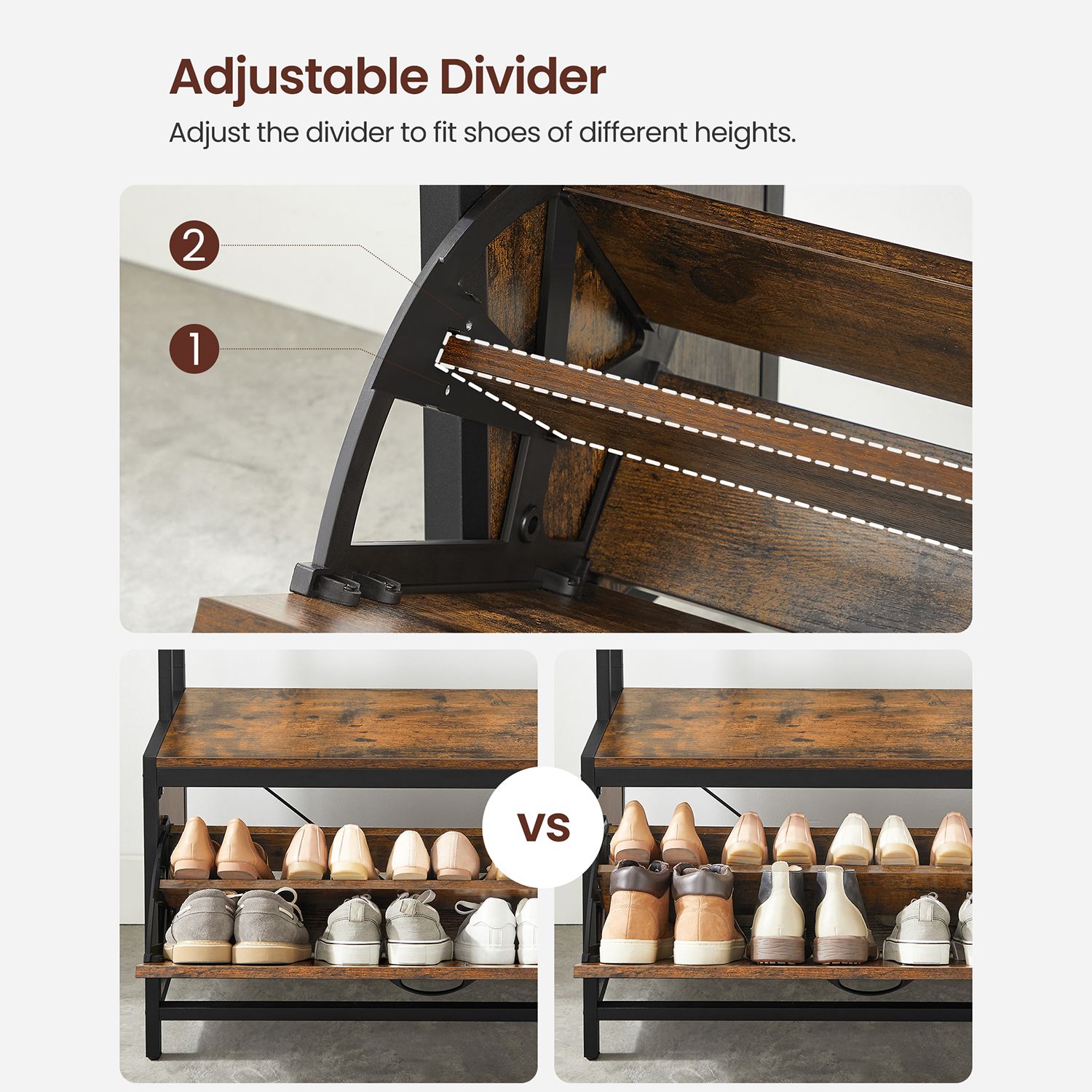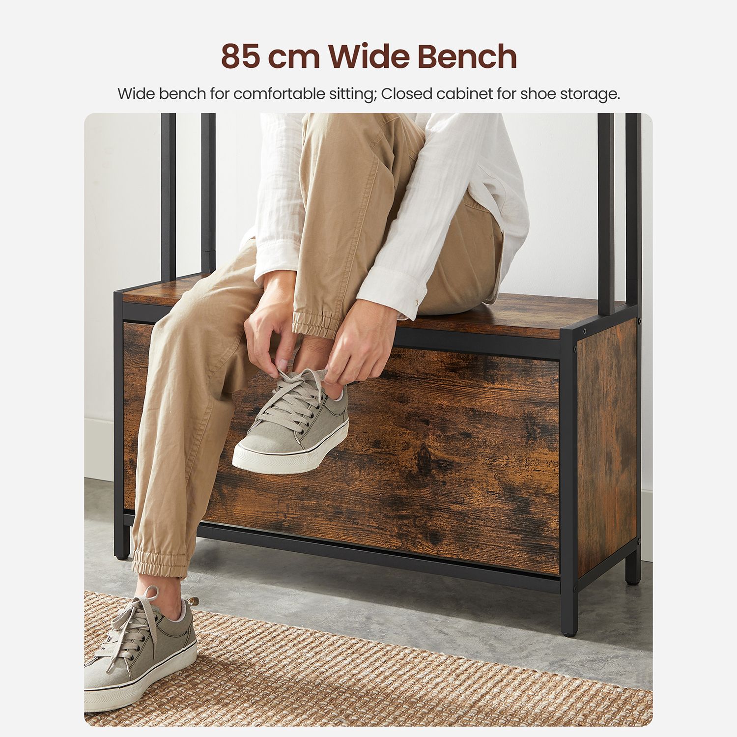 Tuotetiedot: – Väri: vintage-ruskea-musta – Materiaali: lastulevy, teräs – Koko: 30 x 85 x 180 cm (S x L x K) – Paino: 20,1 kg – Maks. staattinen kantavuus koukkua kohti: 5 kg – Maks. staattinen kantavuus penkkiä kohti: 100 kg – Ylimmän levyn maks. staattinen kantavuus: 10 kg Toimitus sisältää: – 1 x vaateripustin – 1 x lisävarustepaketti – 1 x kaatumissuoja – 1 x ohjeet VASAGLE Huomautukset: – Turvallisuussyistä lapset eivät saa kiivetä tuotteelle tai leikkiä sillä.- Kiinnitä tämä tuote seinään mukana toimitetulla kaatumissuojalla turvallisen käytön varmistamiseksi. – Istuimen suurin staattinen kantavuus on 100 kg. Älä ylitä tätä enimmäispainoa.
