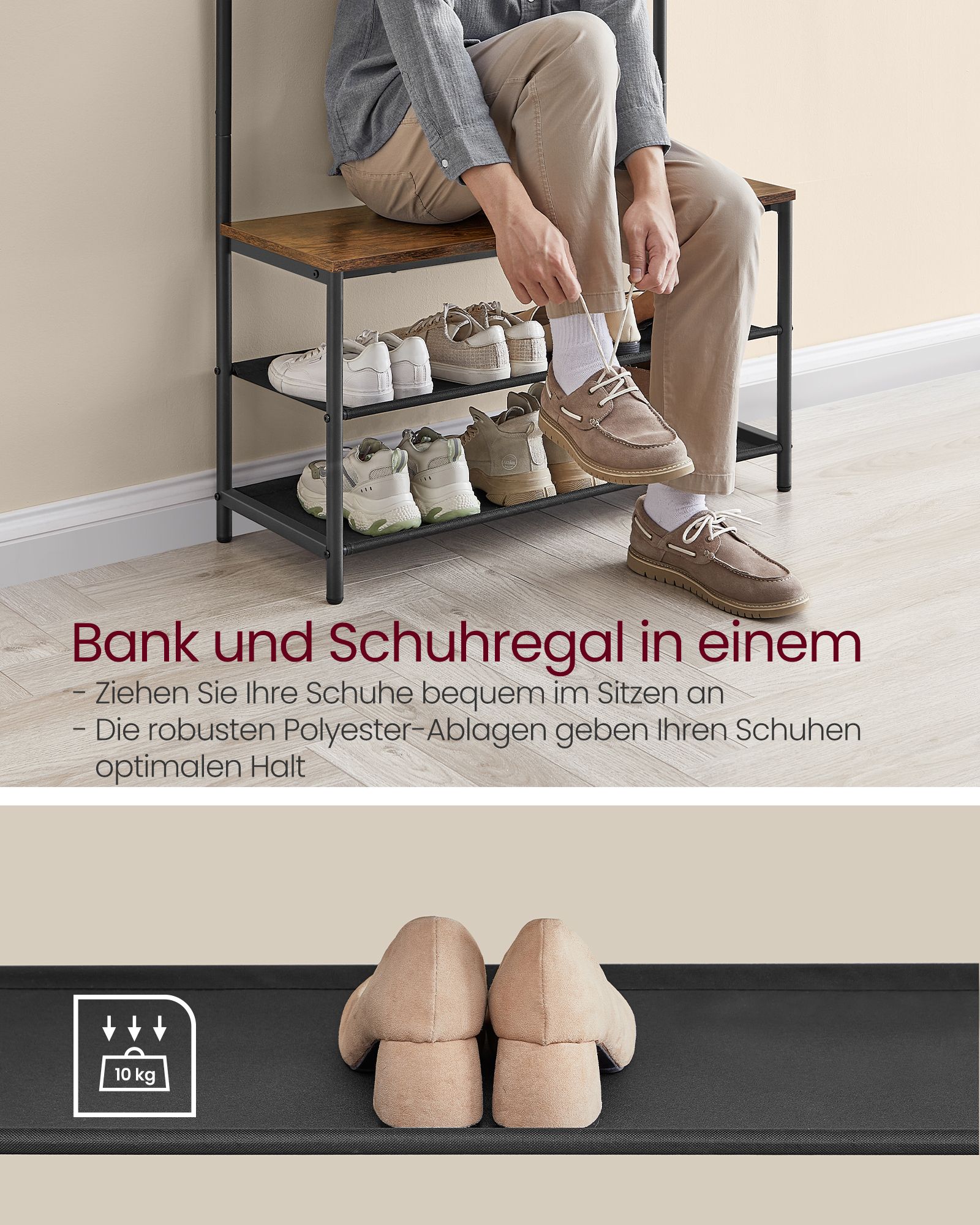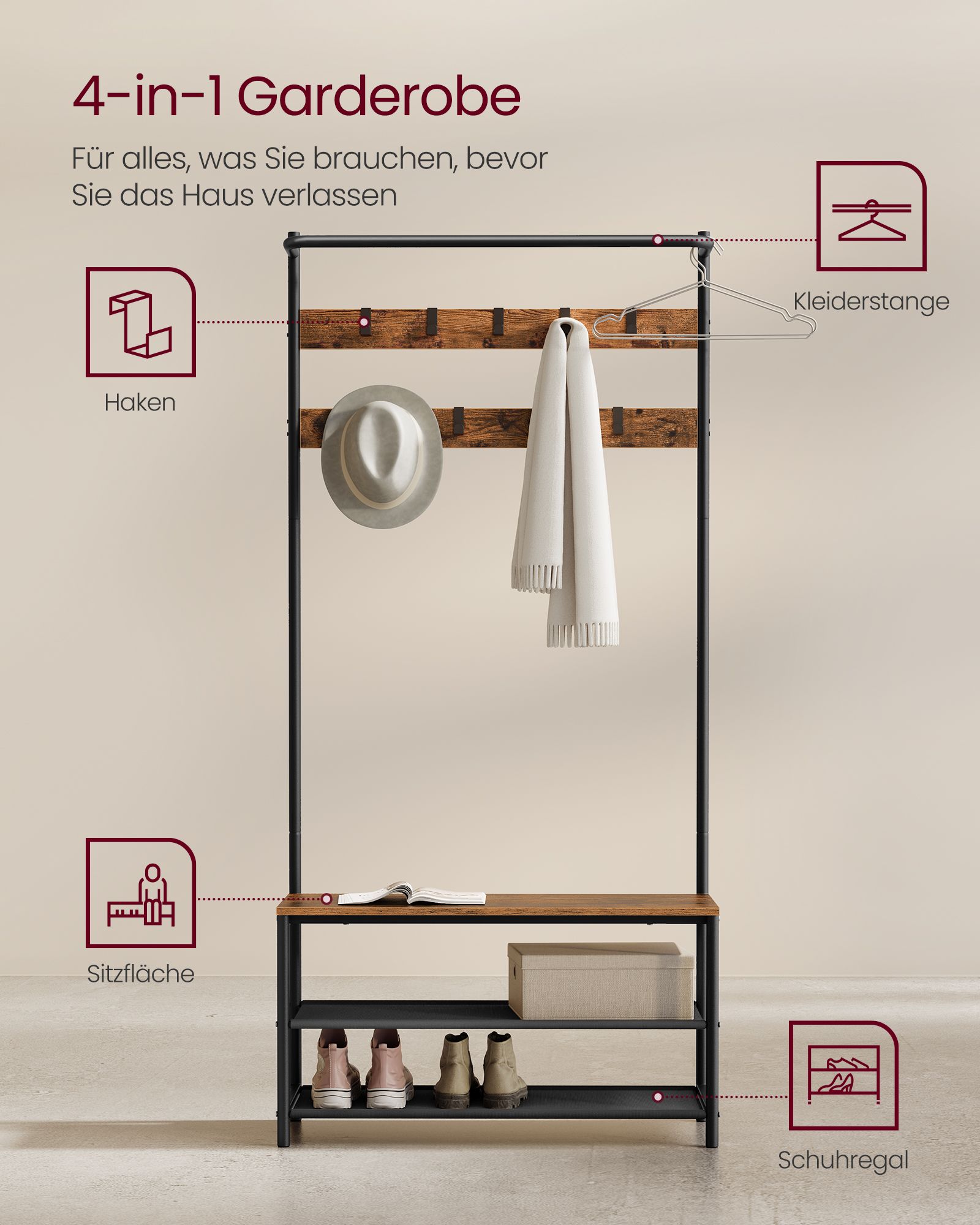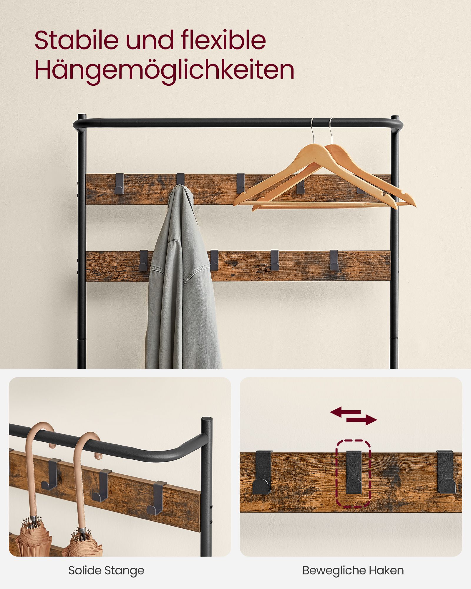 VASAGLE vaatekaappi, vaatekaappi kenkäpenkillä, vaateteline, vaatetanko, 9 irrotettavaa koukkua